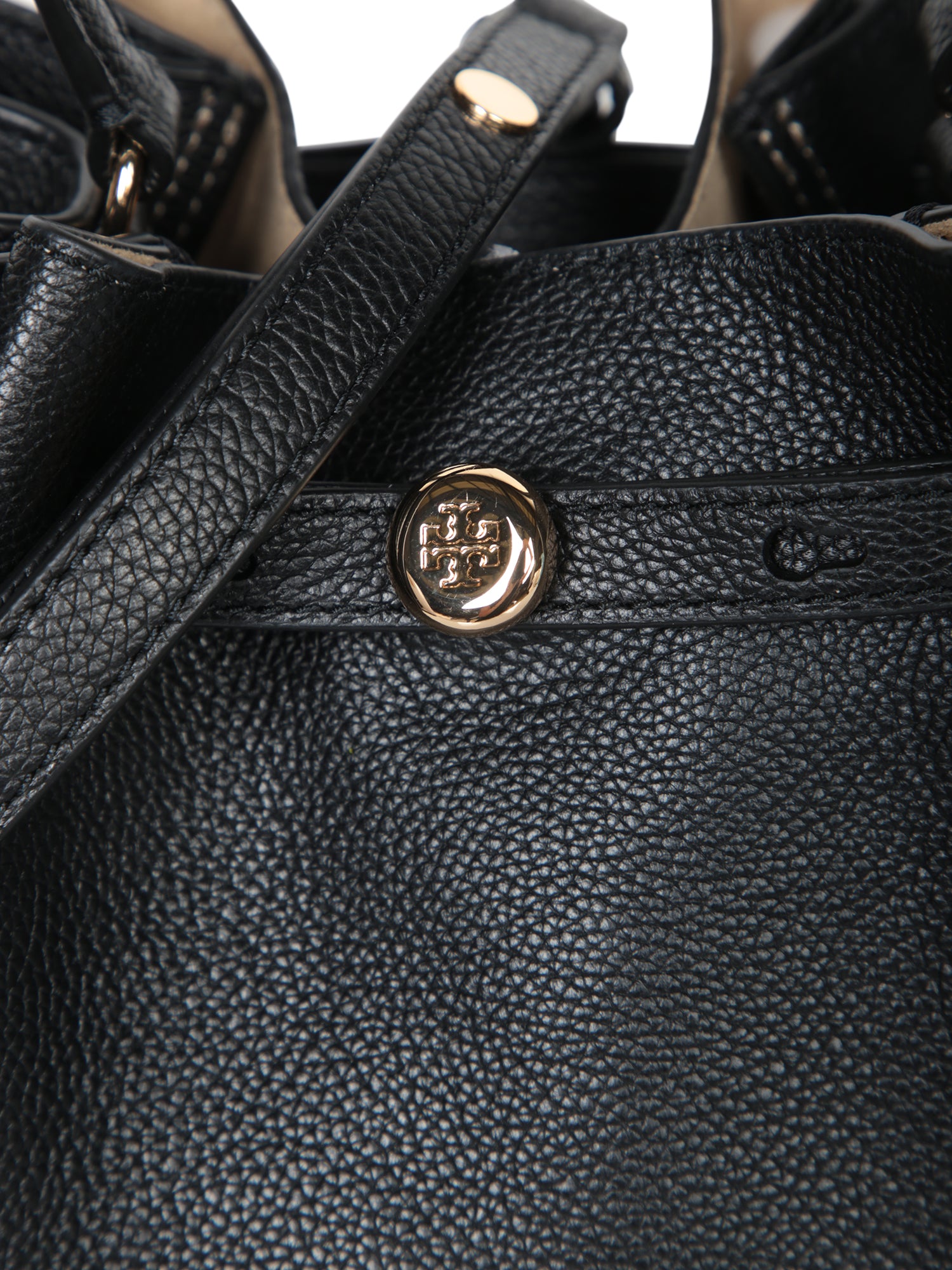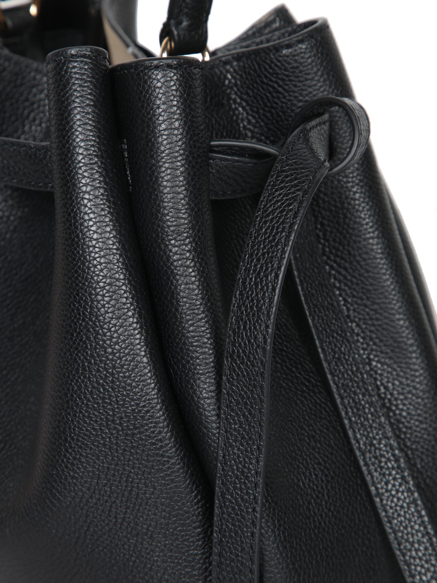 Black leather bag. Adjustable and removable shoulder strap. Drawstring closure.