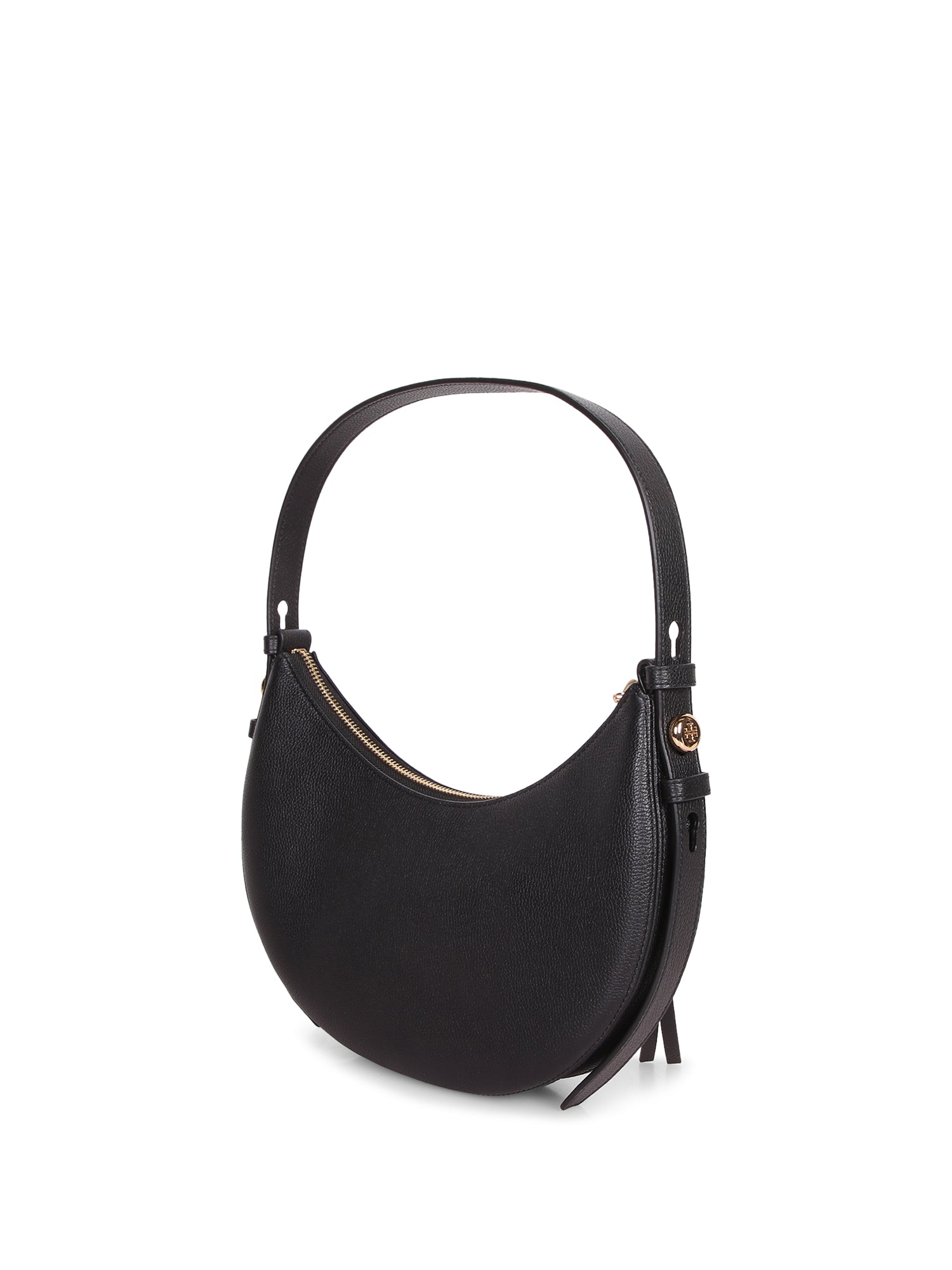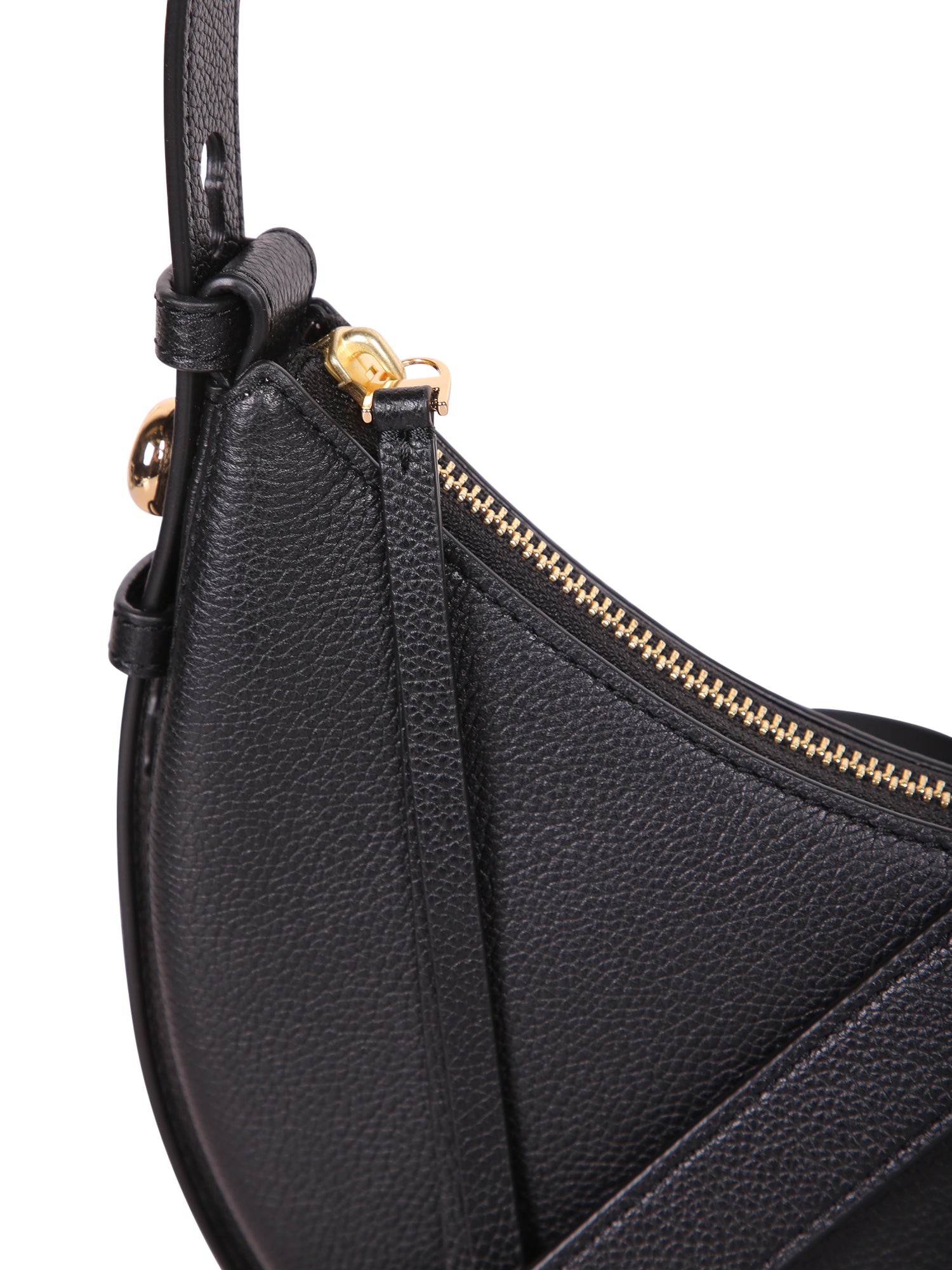 Half-moon bag. Textured black leather. Adjustable strap, gold-toned metal details.