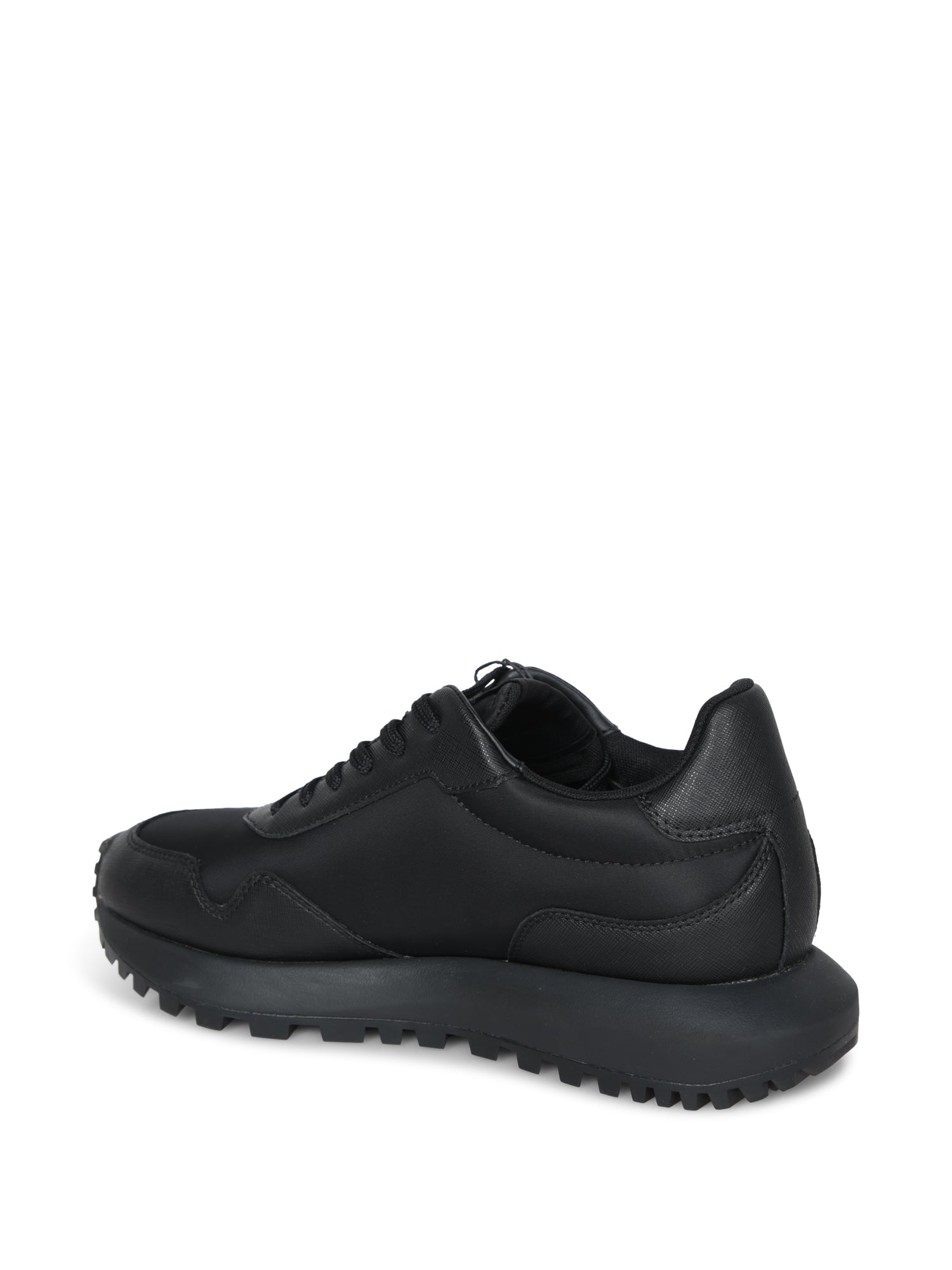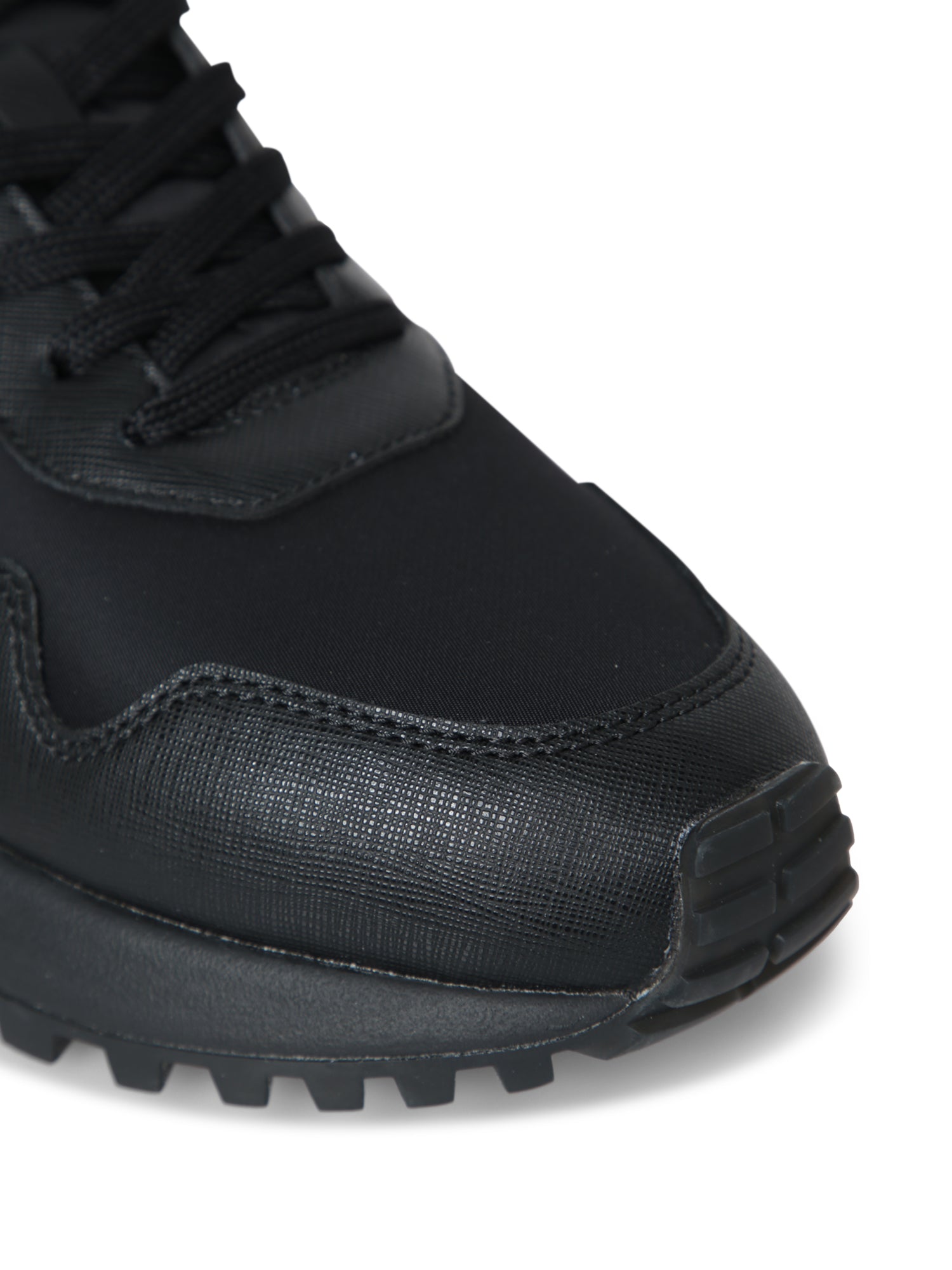 Sneakers crafted from black technical fabric and leather. Jagged rubber sole. Silver side logo.