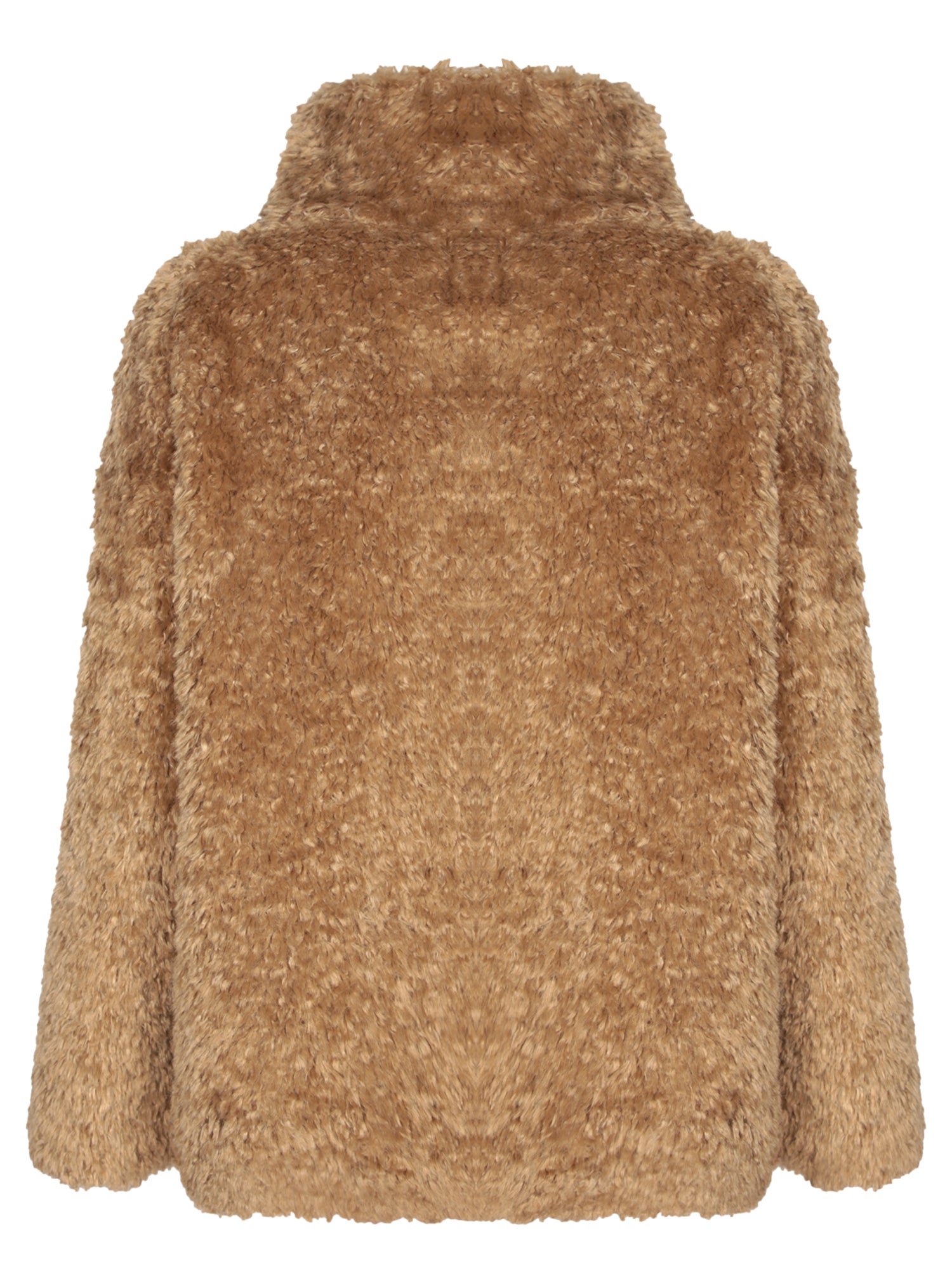 Synthetic fur jacket. Collar closure with buckle. Long sleeves. No front closures.