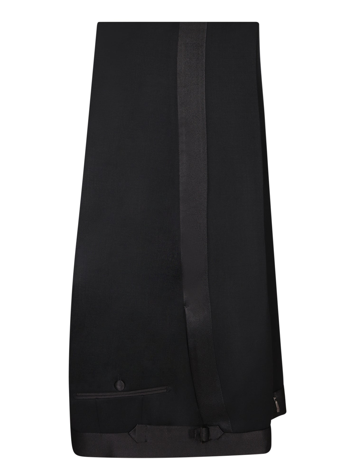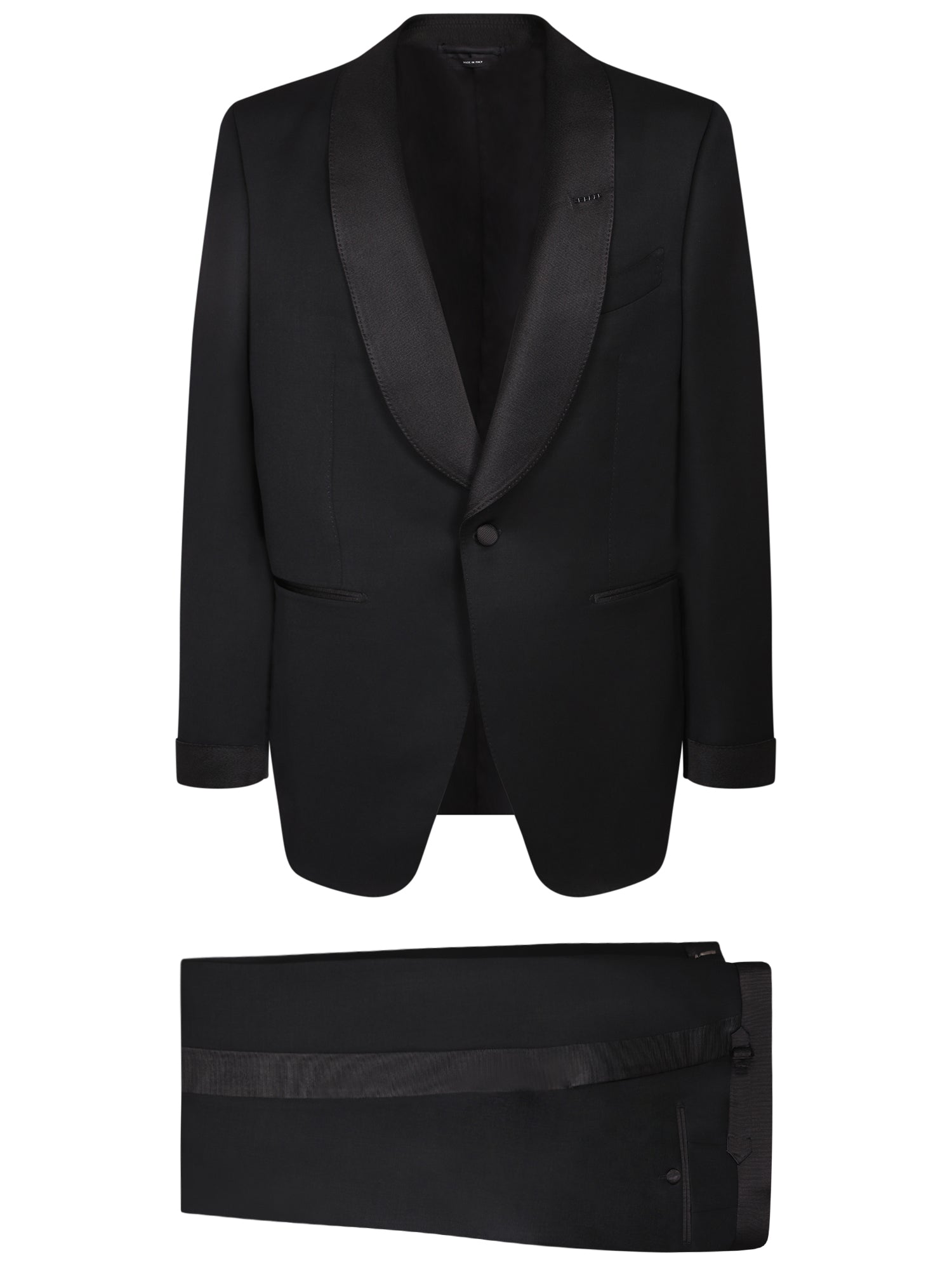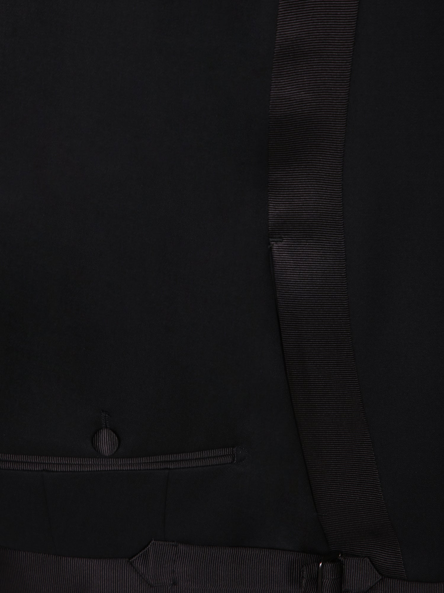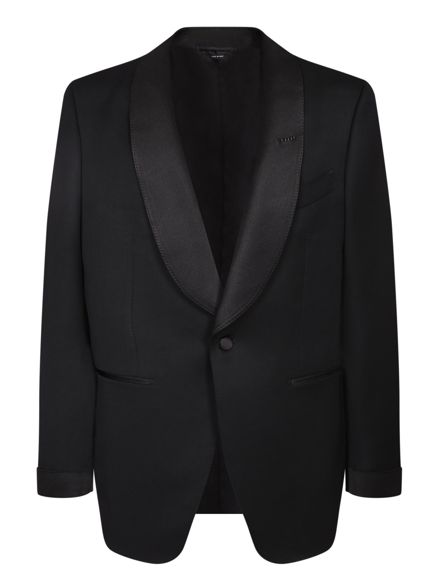 Black suit with satin lapels, jetted pockets, and single-button closure. Coordinated trousers with a covered placket.