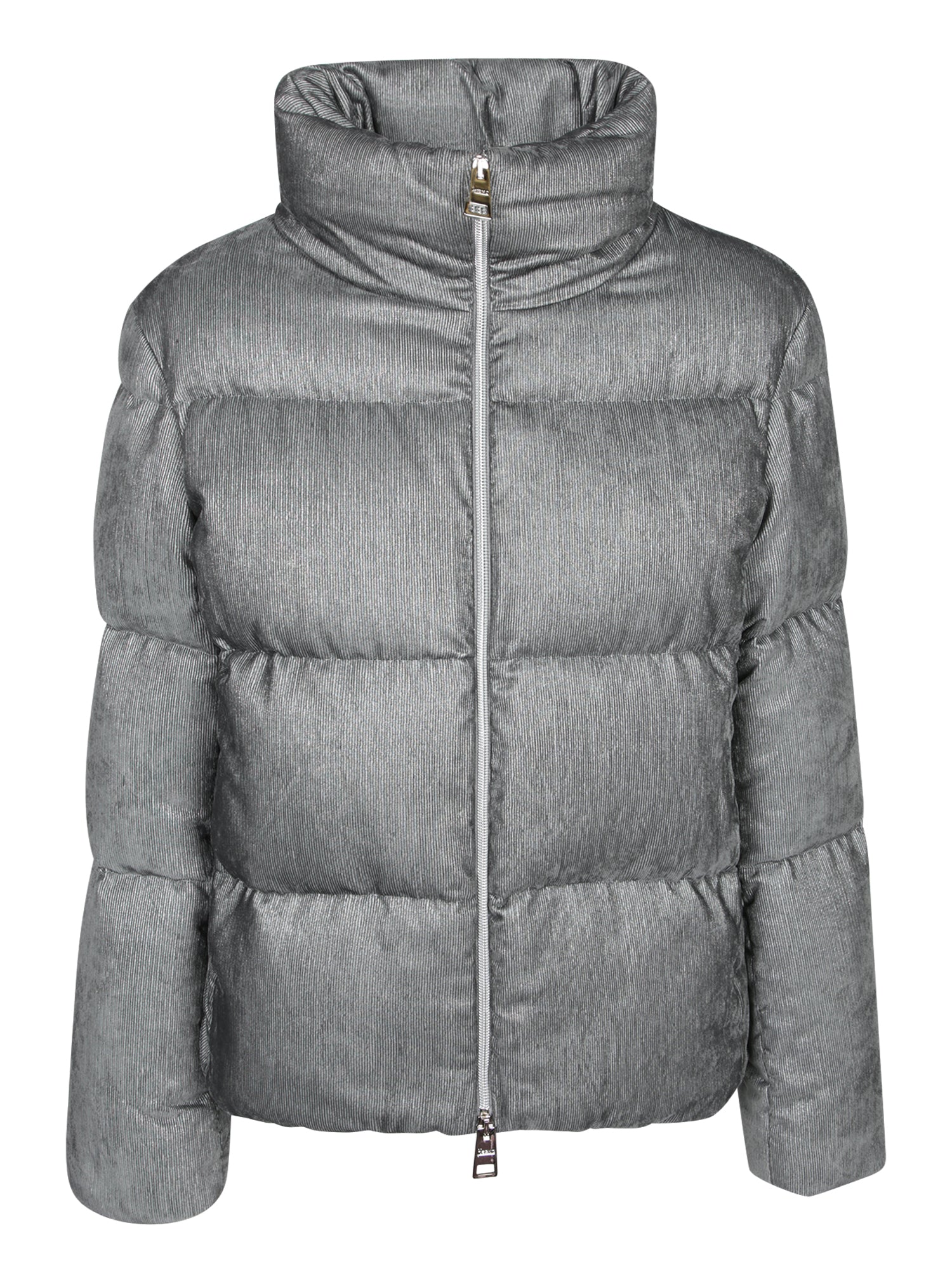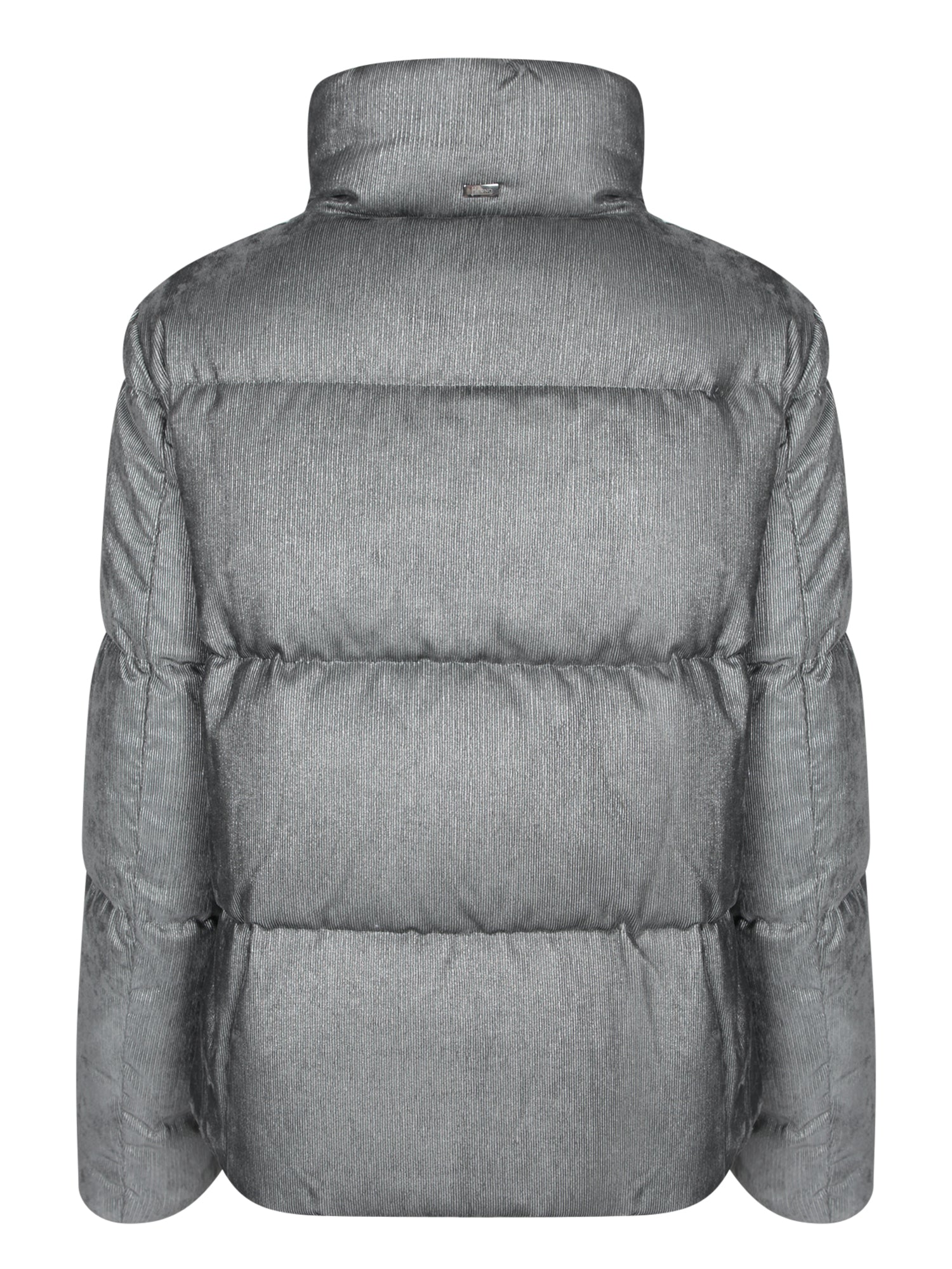 Shiny corduroy fabric puffer jacket with a front zipper and high collar.