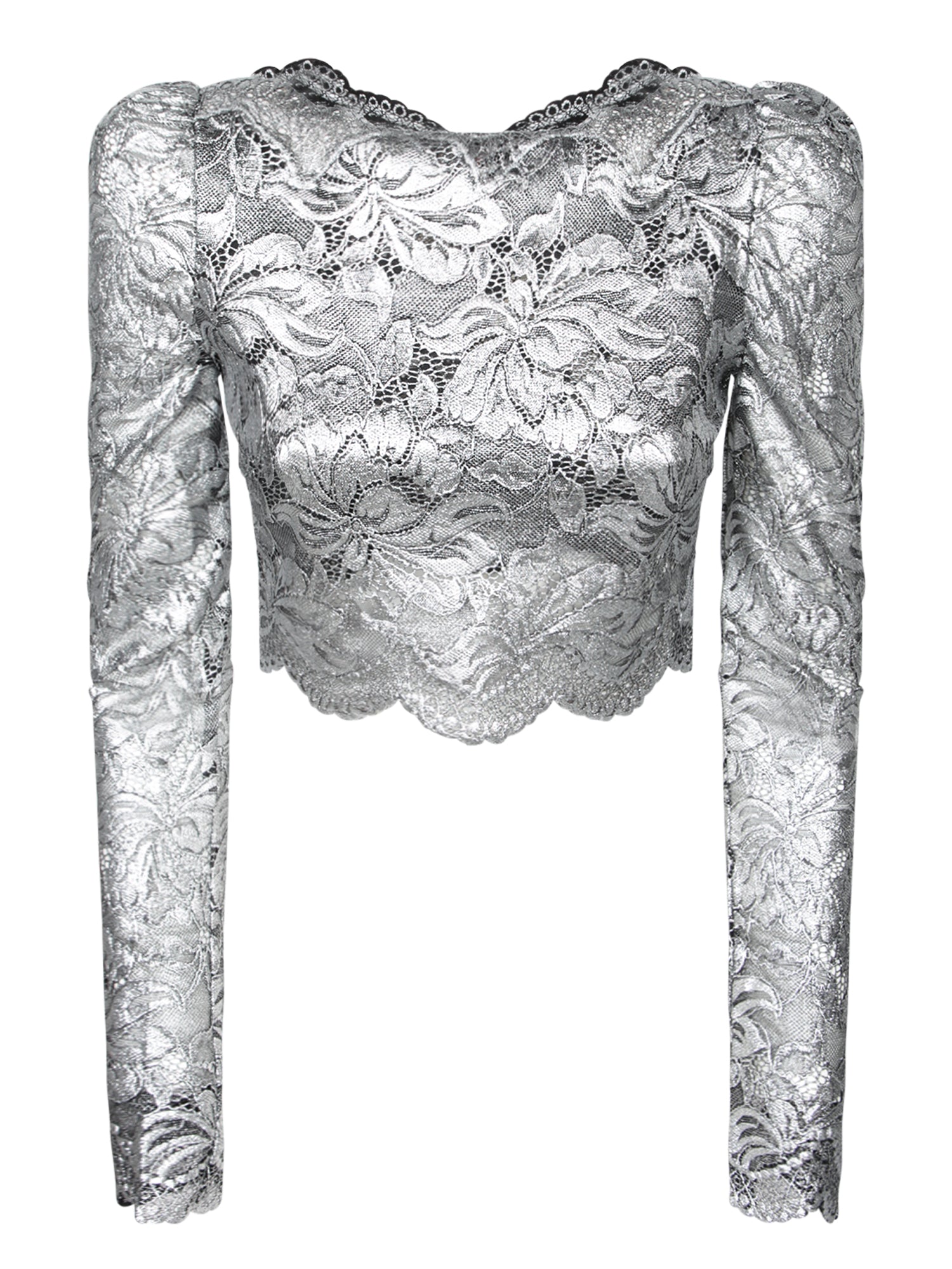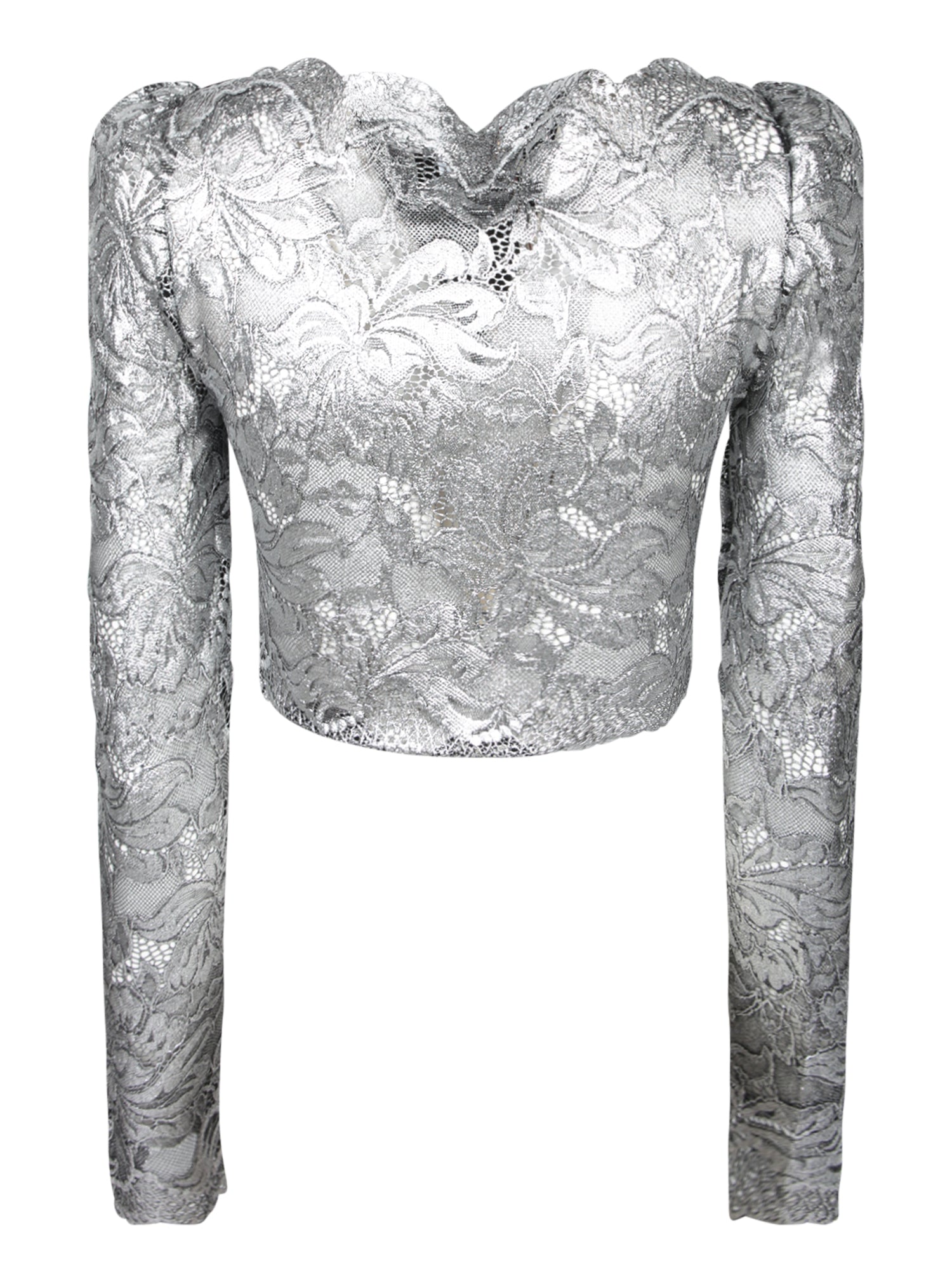 Long sleeves, coated lace fabric, sweetheart neckline.