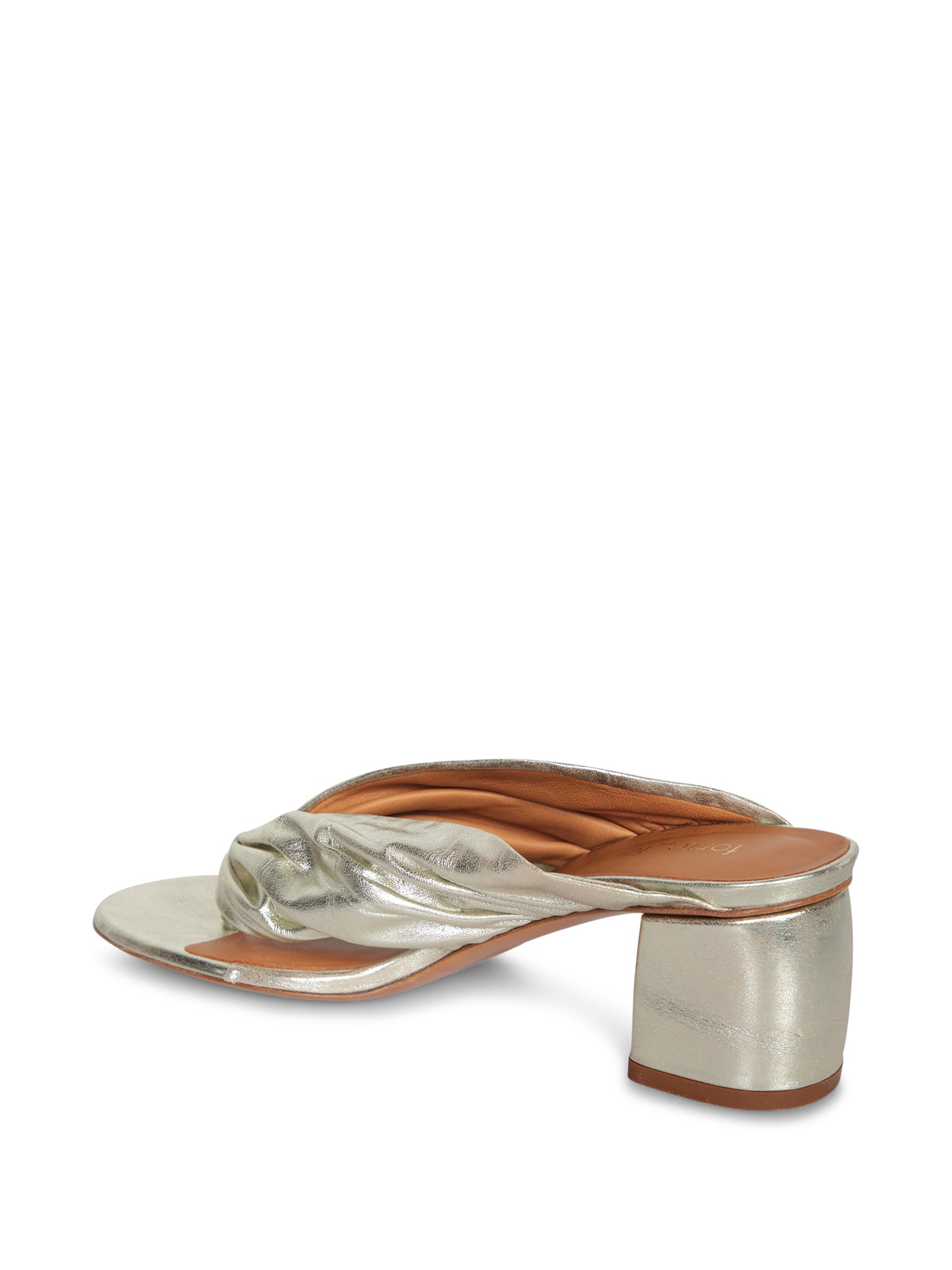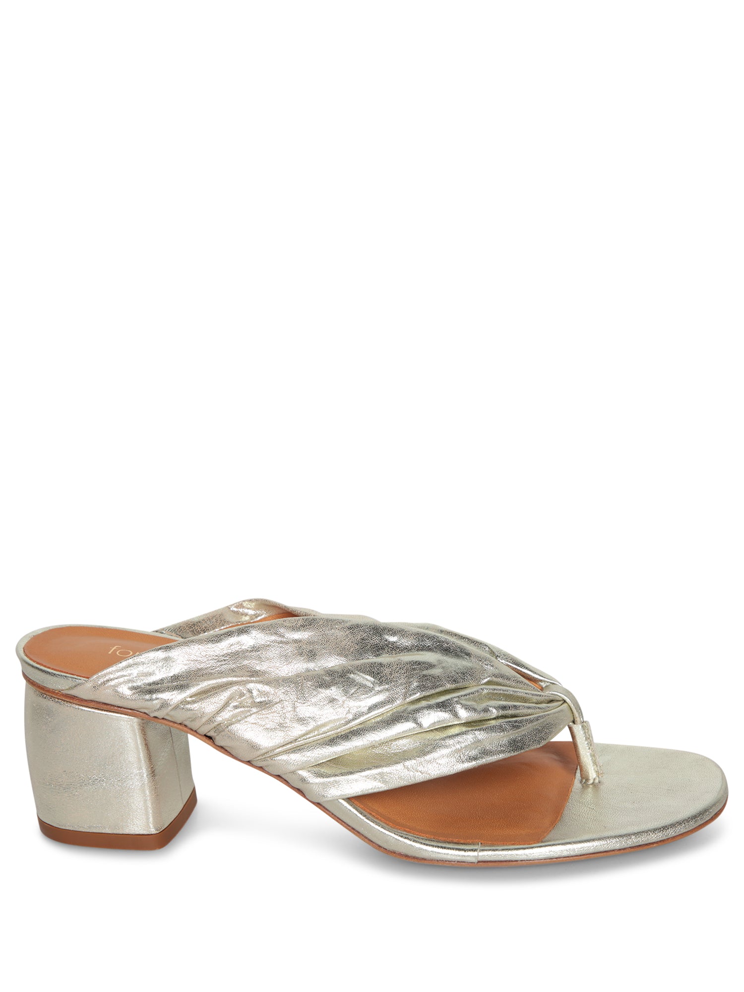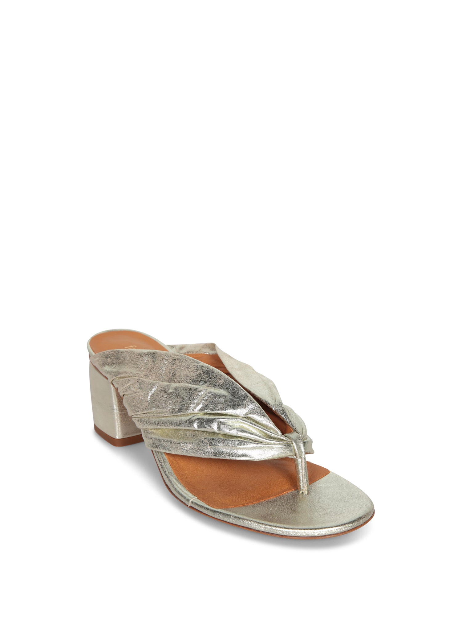 Thong sandals with broad heel. Silver metallic finish. Slip-on design with knot detail.