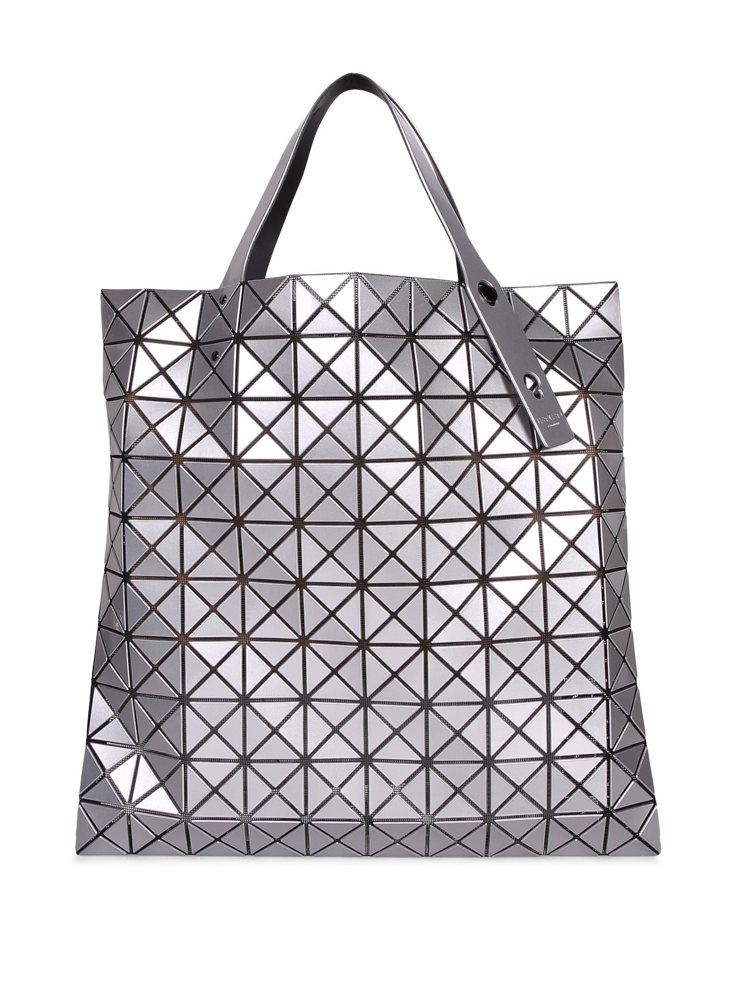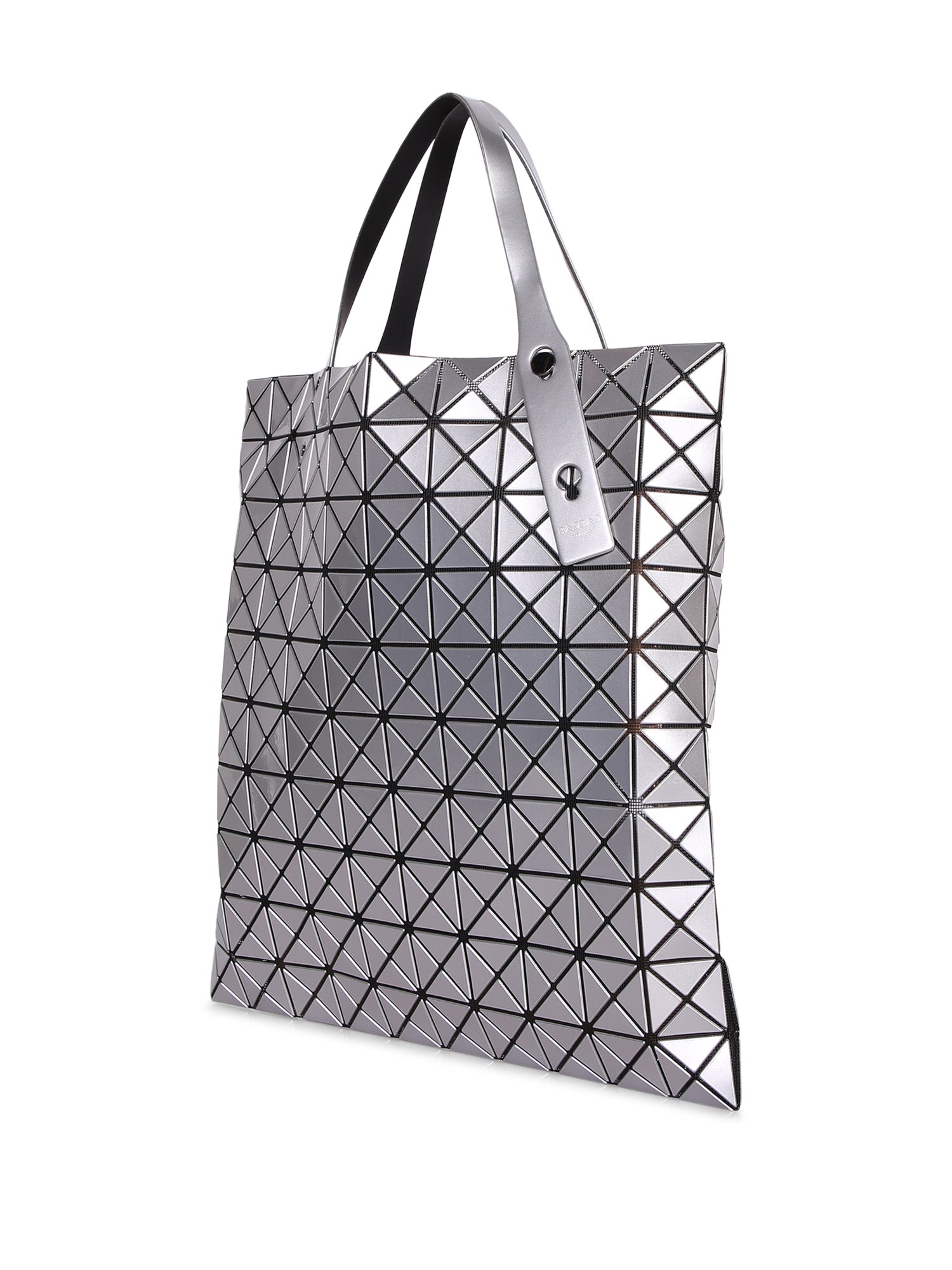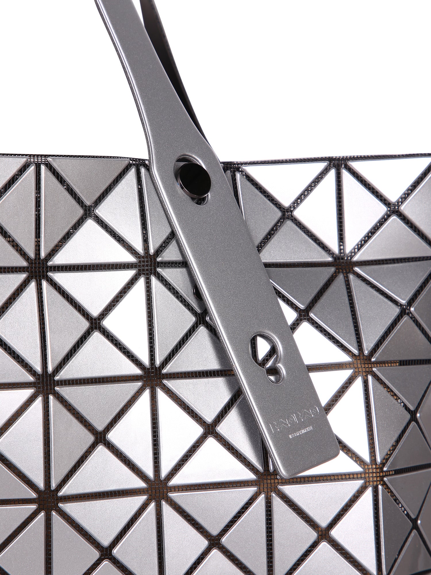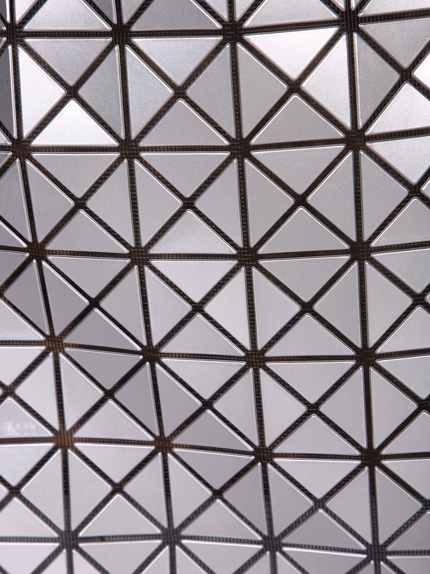 Bag with three-dimensional geometric structure. Reflective material. Leather handles.