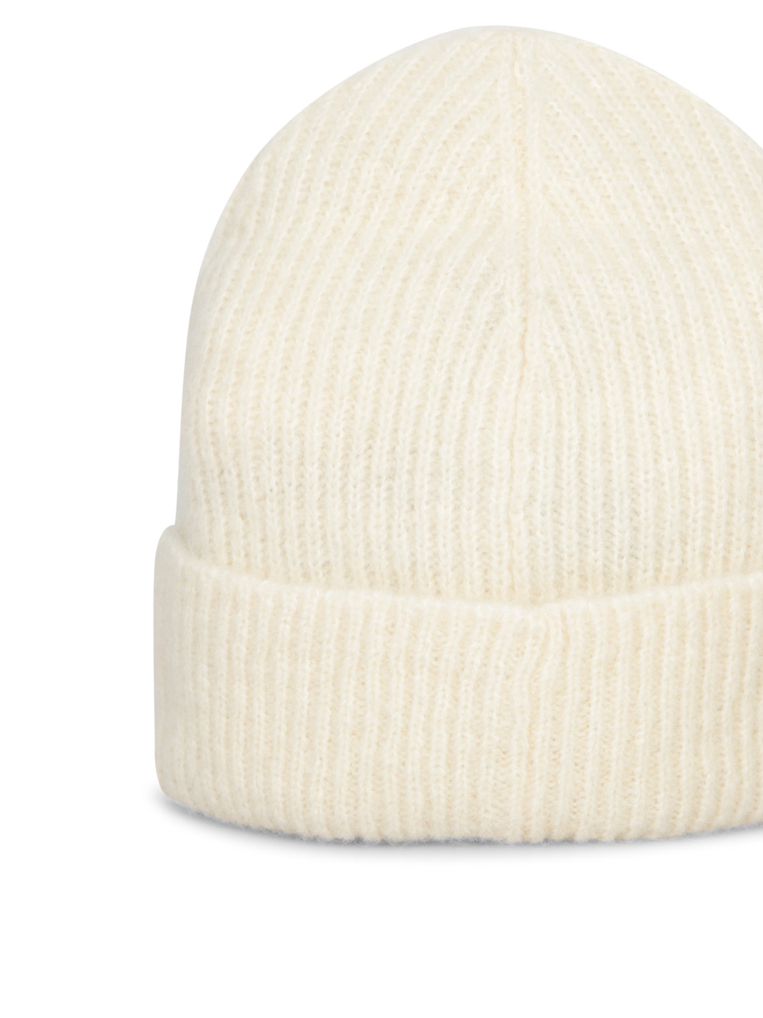 Fine knit beanie hat. Fold-over cuff. Metallic logo detail.