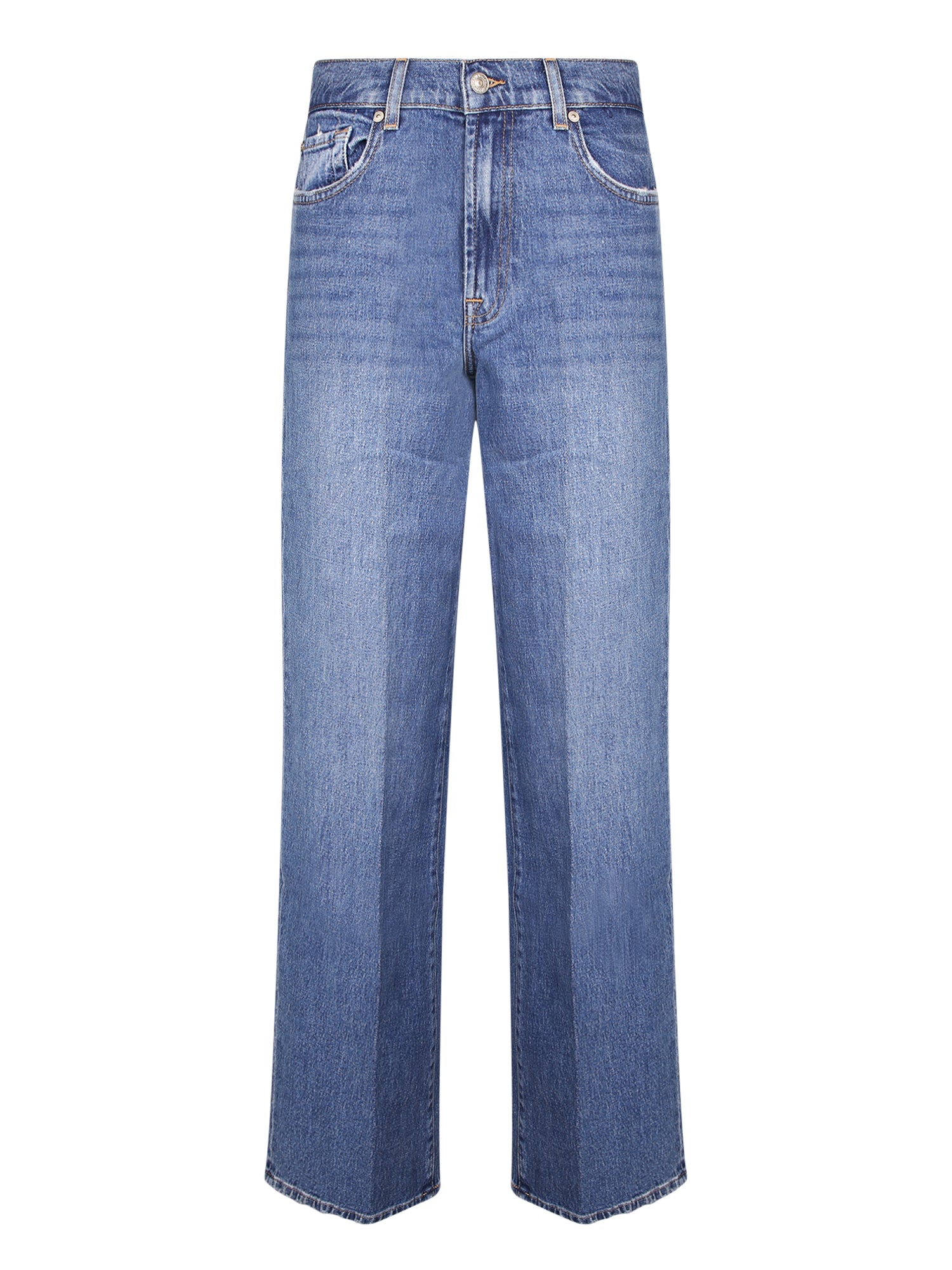 Straight cut, mid-rise, five-pocket design. Zip and button closure.