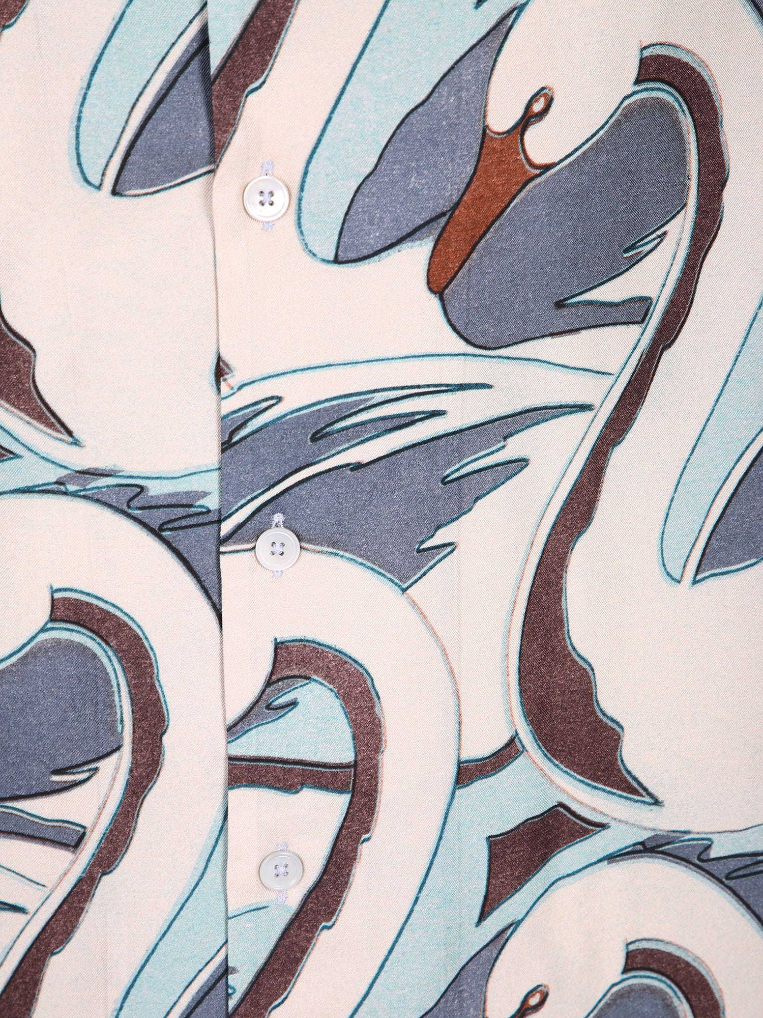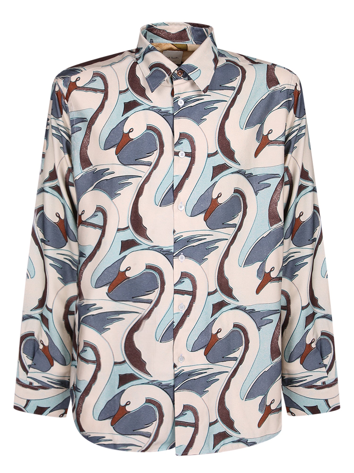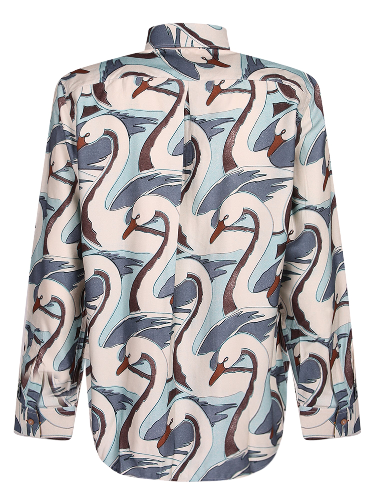 Viscose shirt. All-over swan print. Classic collar, long sleeves.