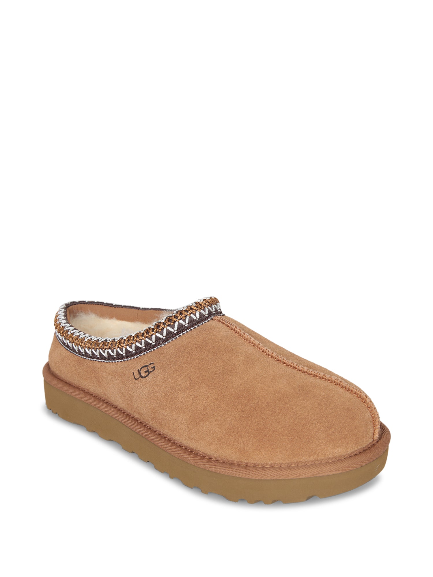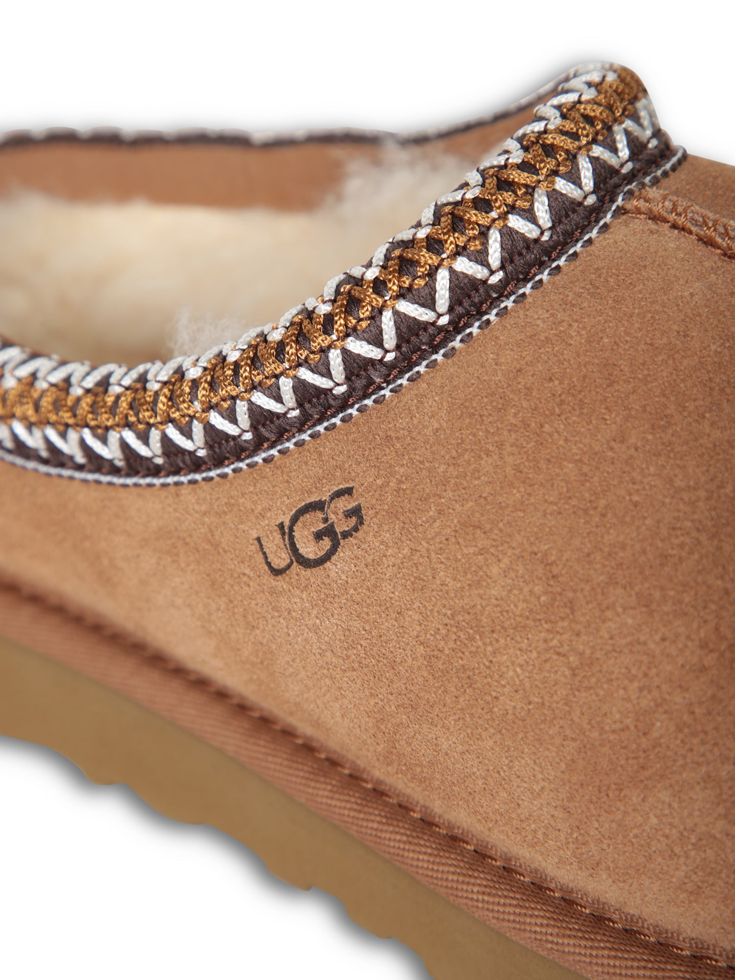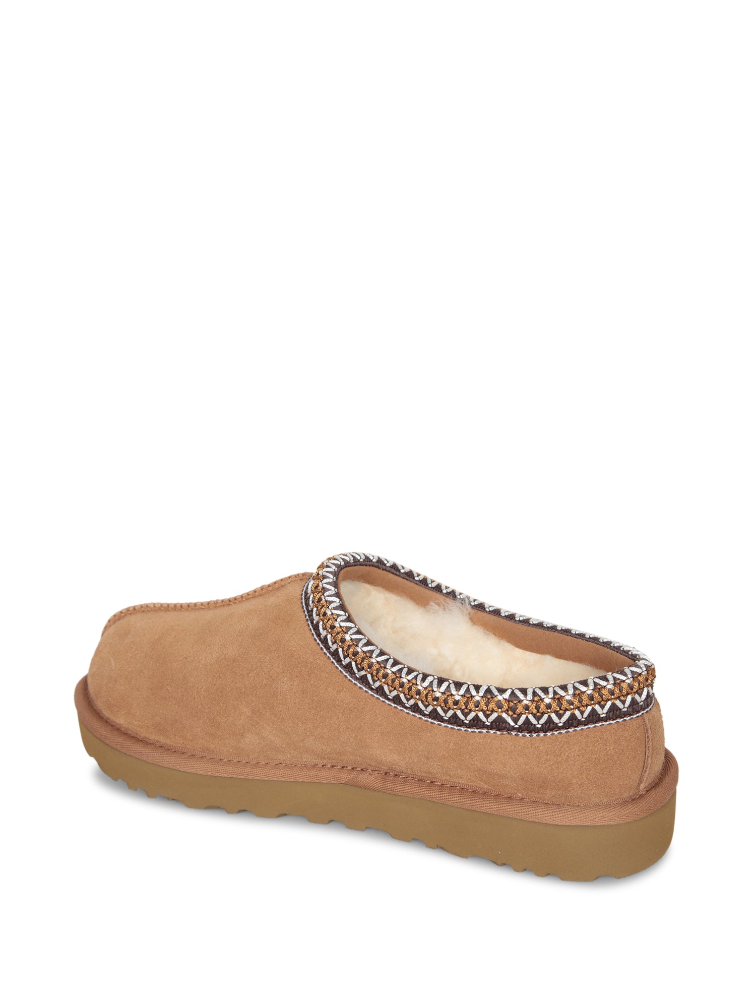 Suede slippers with wool lining. Features visible stitching and a braided edge.