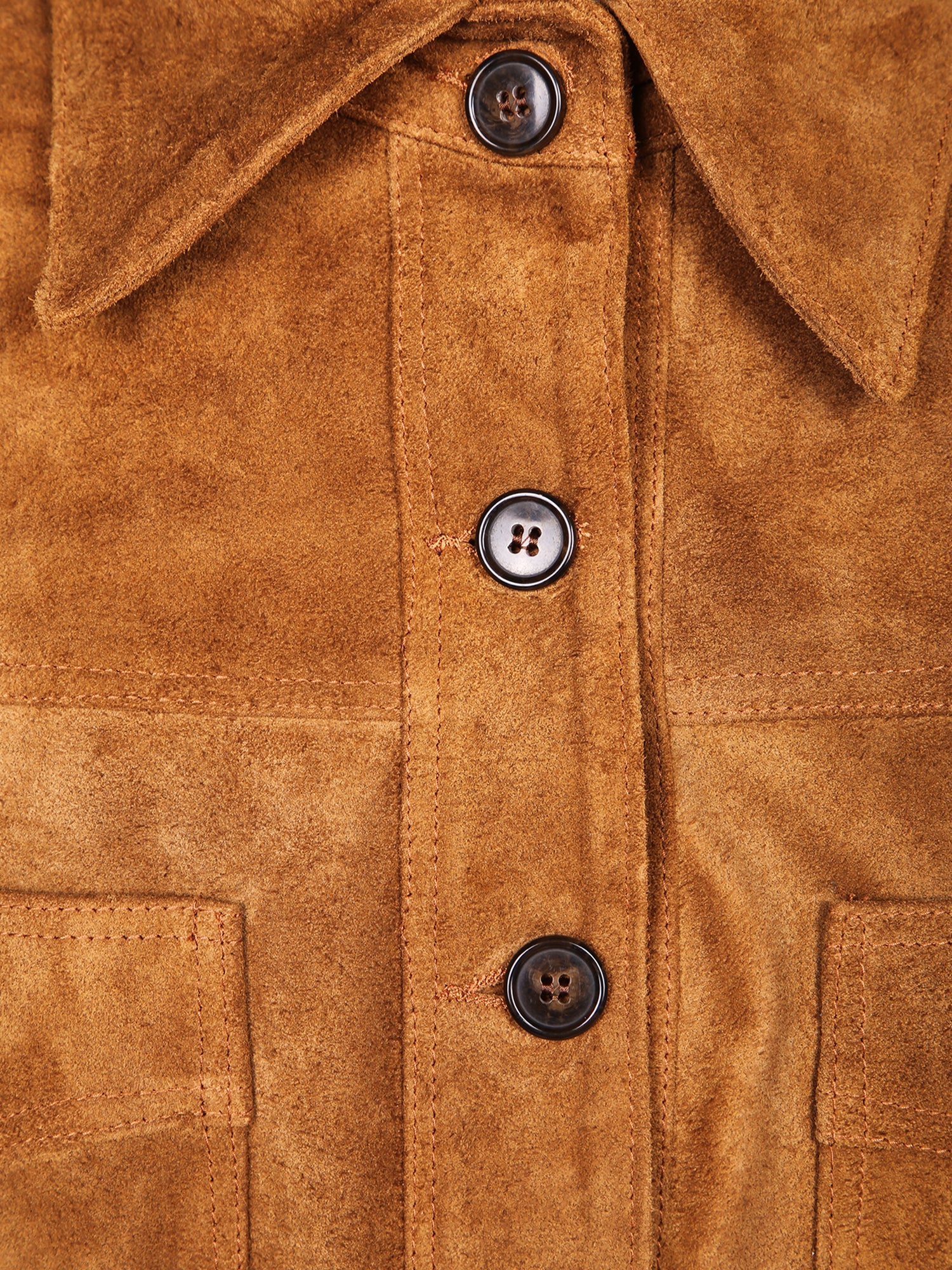 Suede jacket with front button closure. Classic collar, two chest patch pockets.