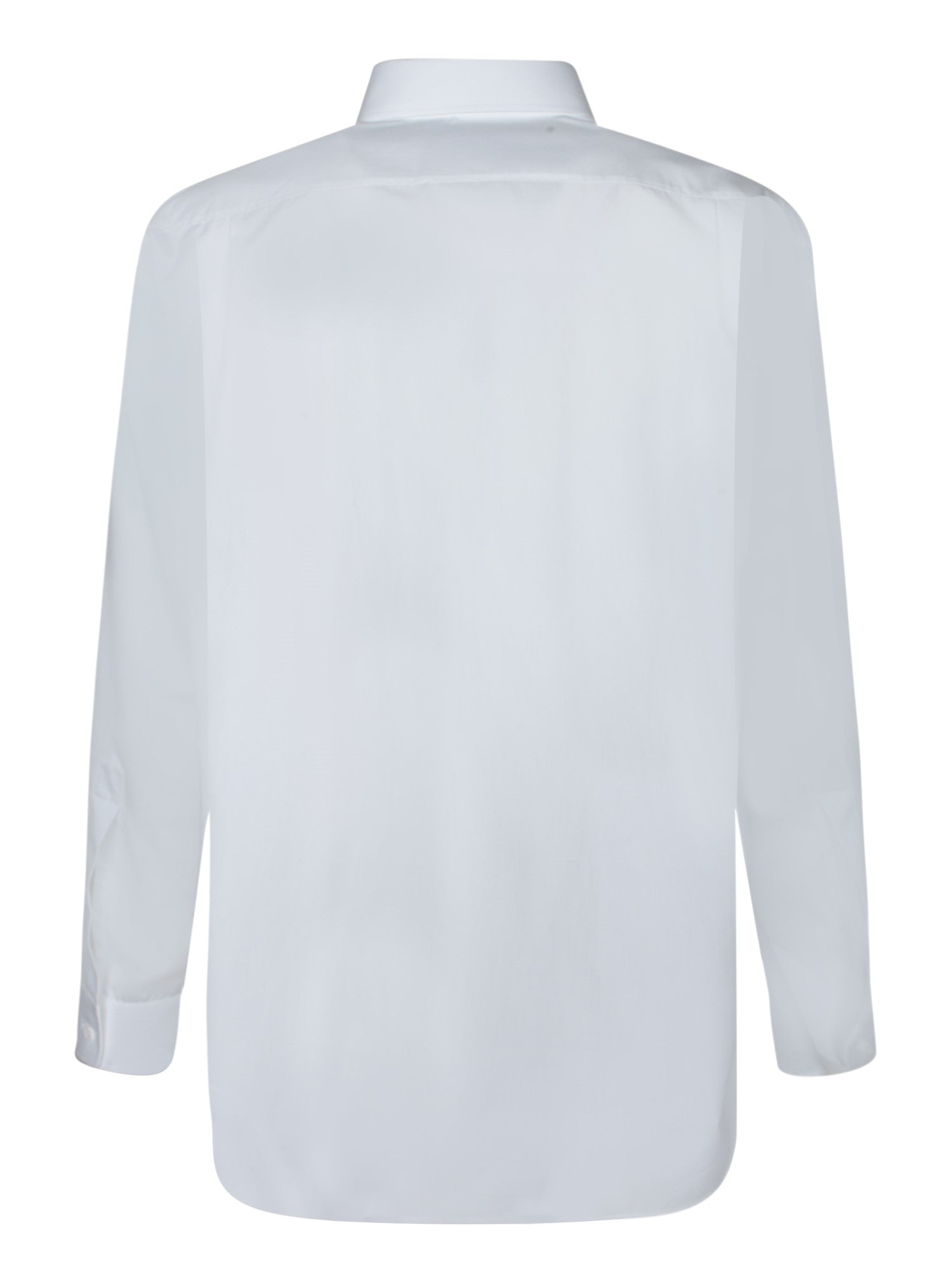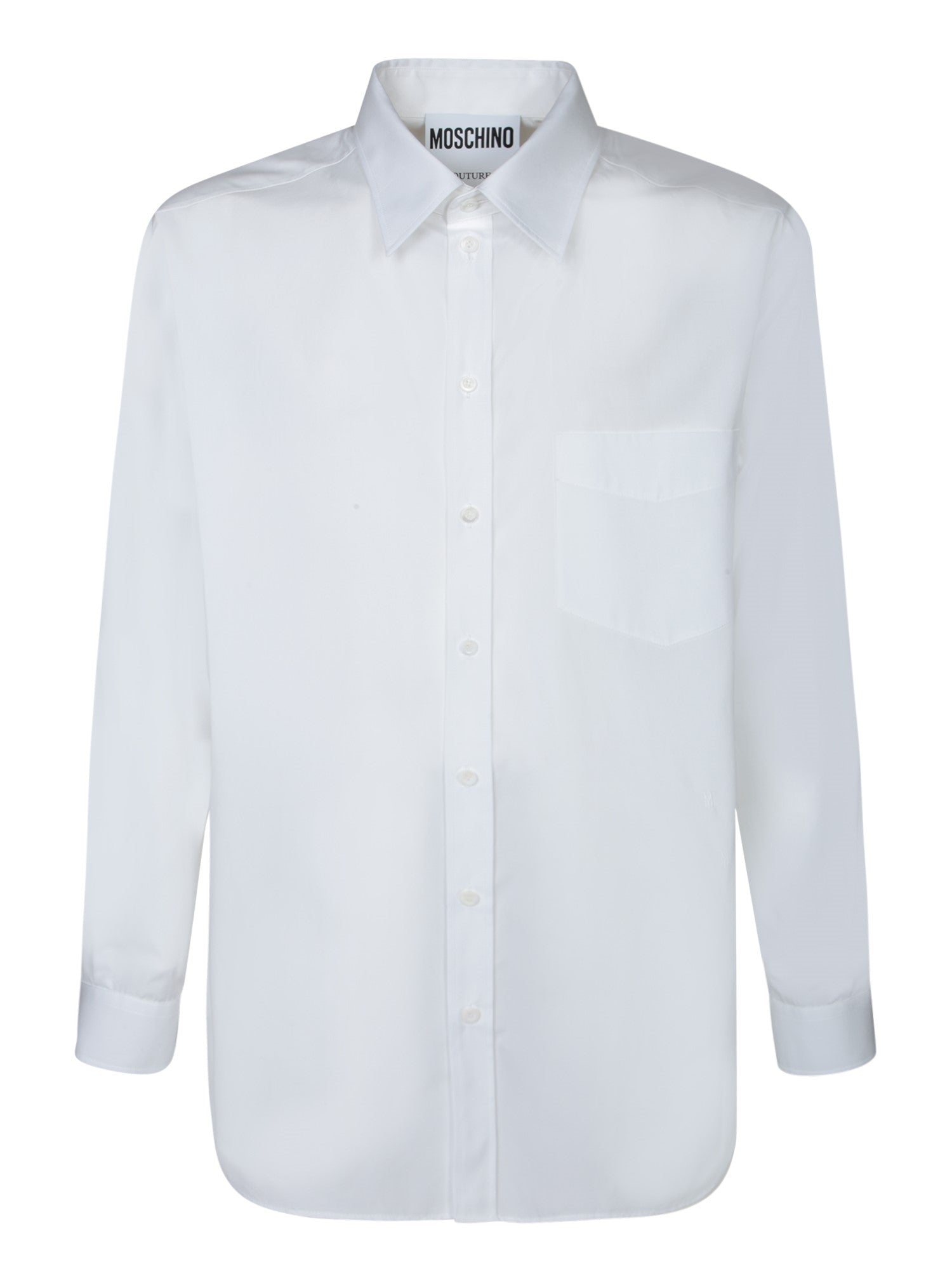 This elegant white Moschino shirt features a tonal logo on the collar, adding a touch of discreet sophistication. Perfect for formal occasions or as part of a business casual outfit.