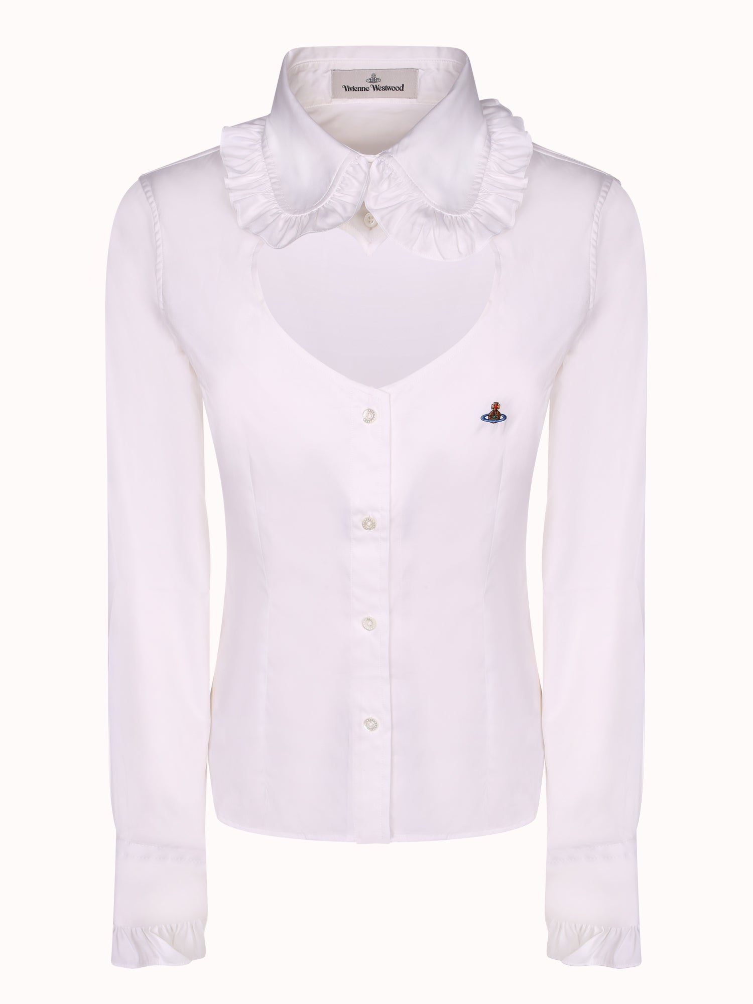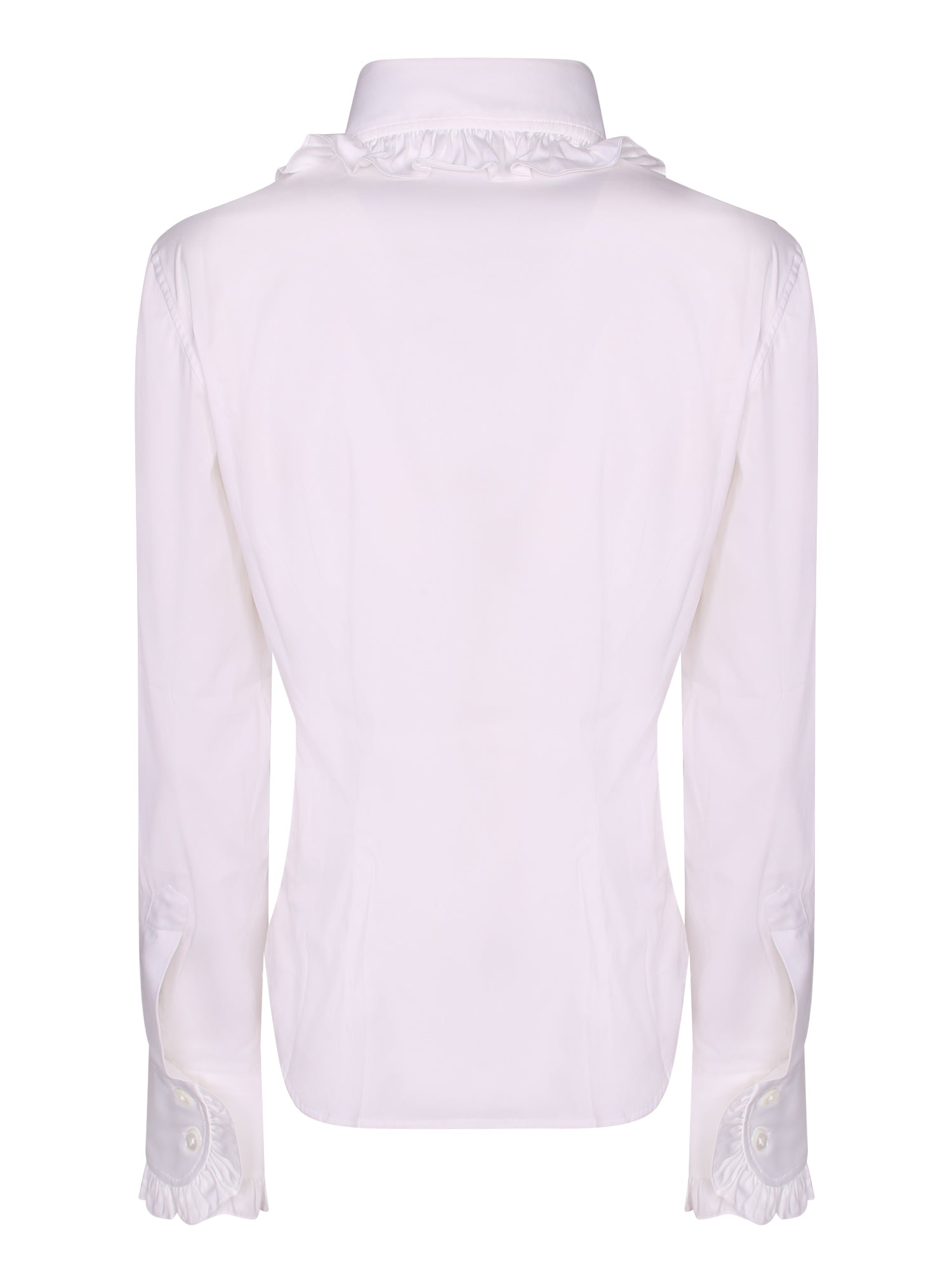 White long-sleeve shirt. Elegant ruffled collar. Front button closure.