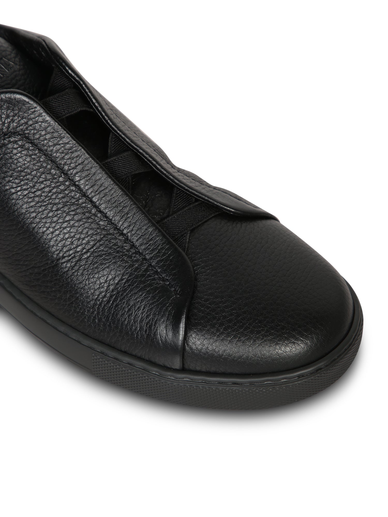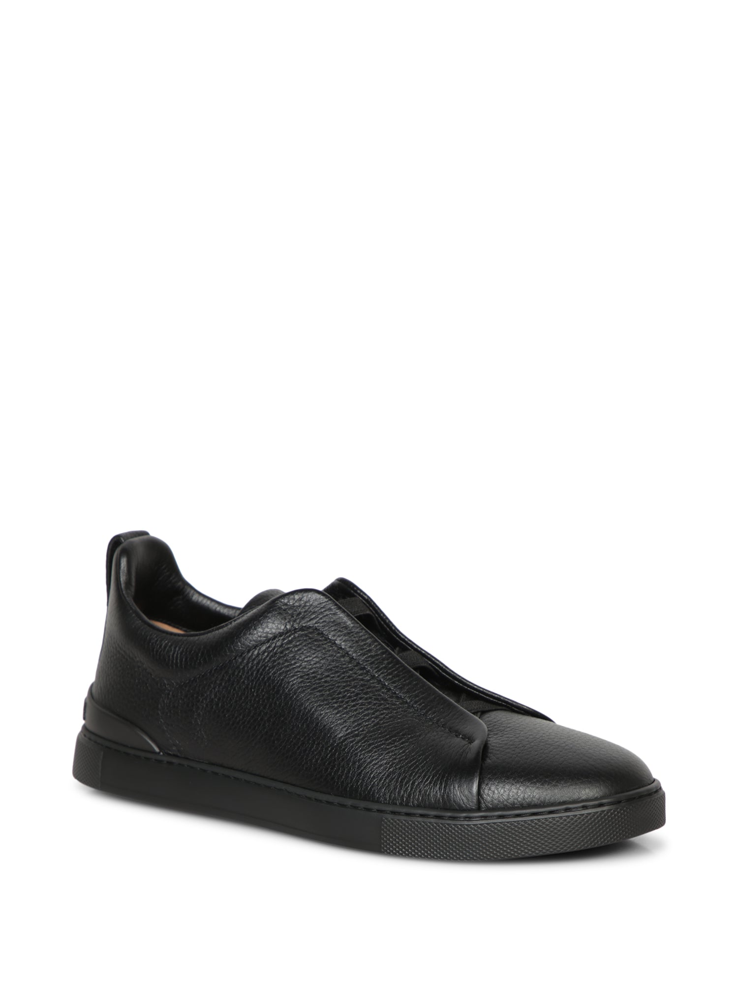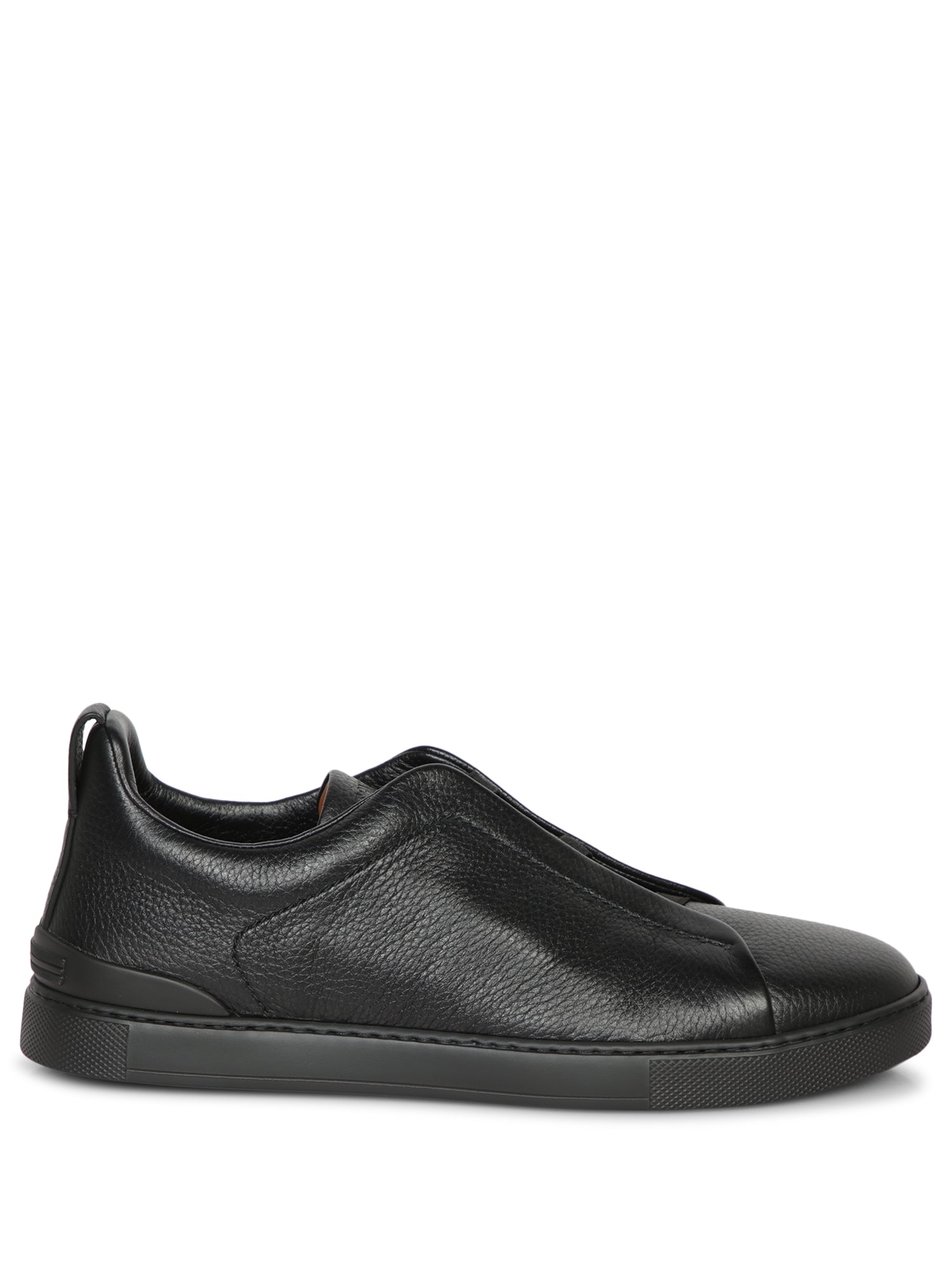Zegna's Triple Stitch Sneakers embody a blend of comfort and contemporary style, featuring sophisticated black leather craftsmanship and a convenient slip-on design.