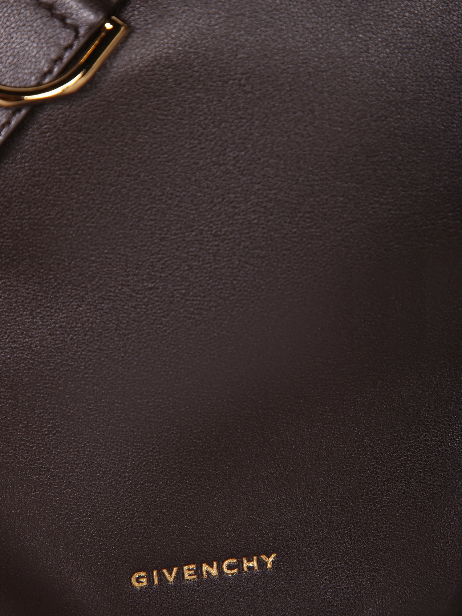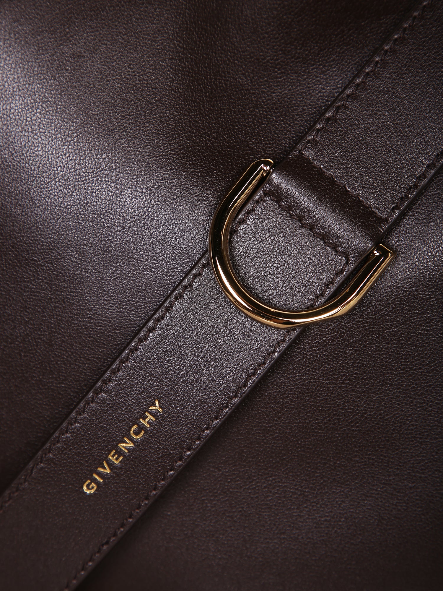 Brown leather bag. Adjustable and removable shoulder strap. Magnetic buckle closure.