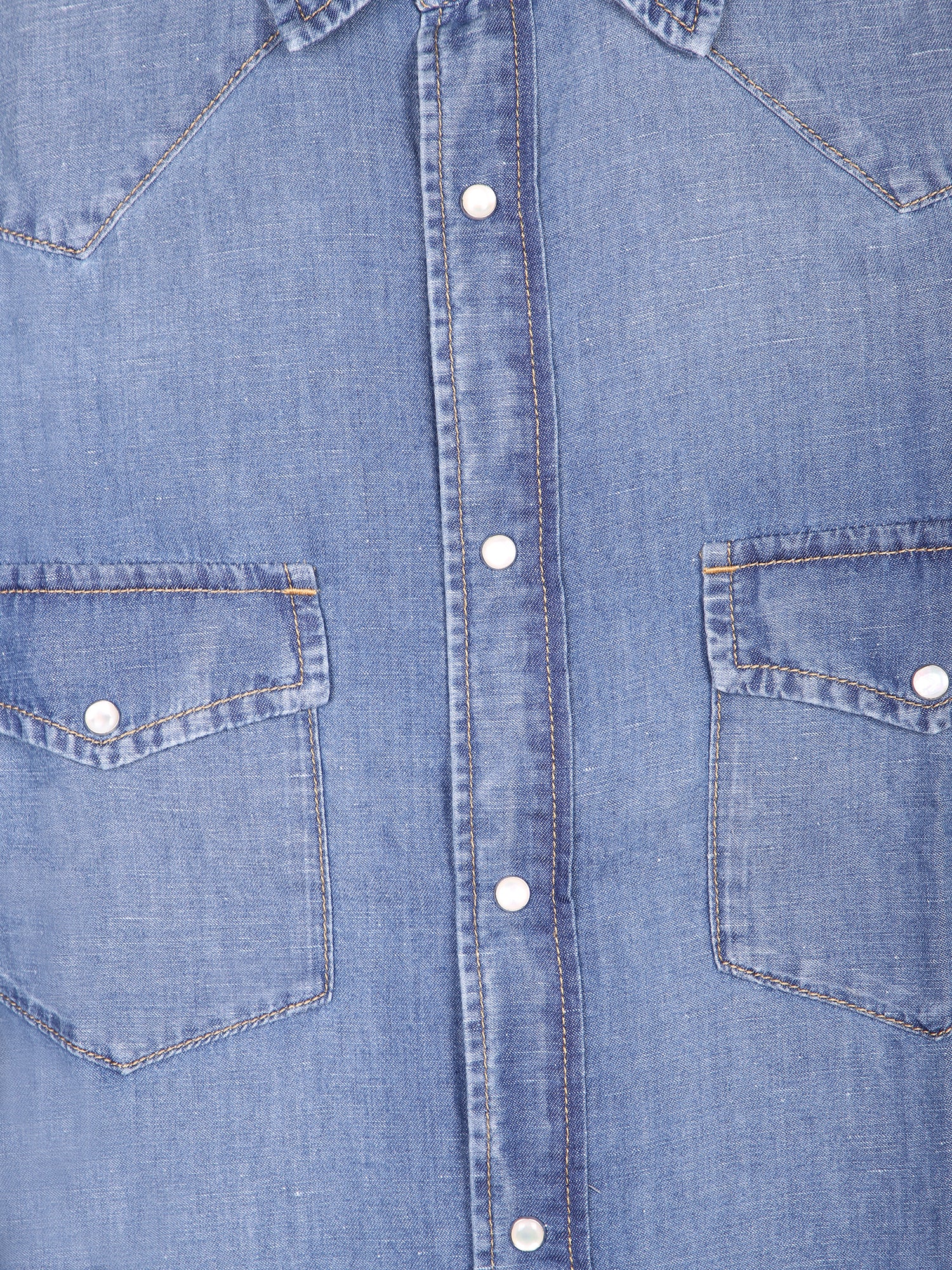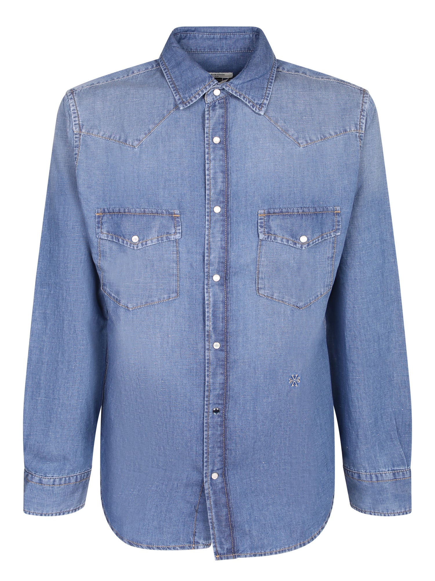 Soft denim. Western cut. Metal snap buttons. Front flap pockets.
