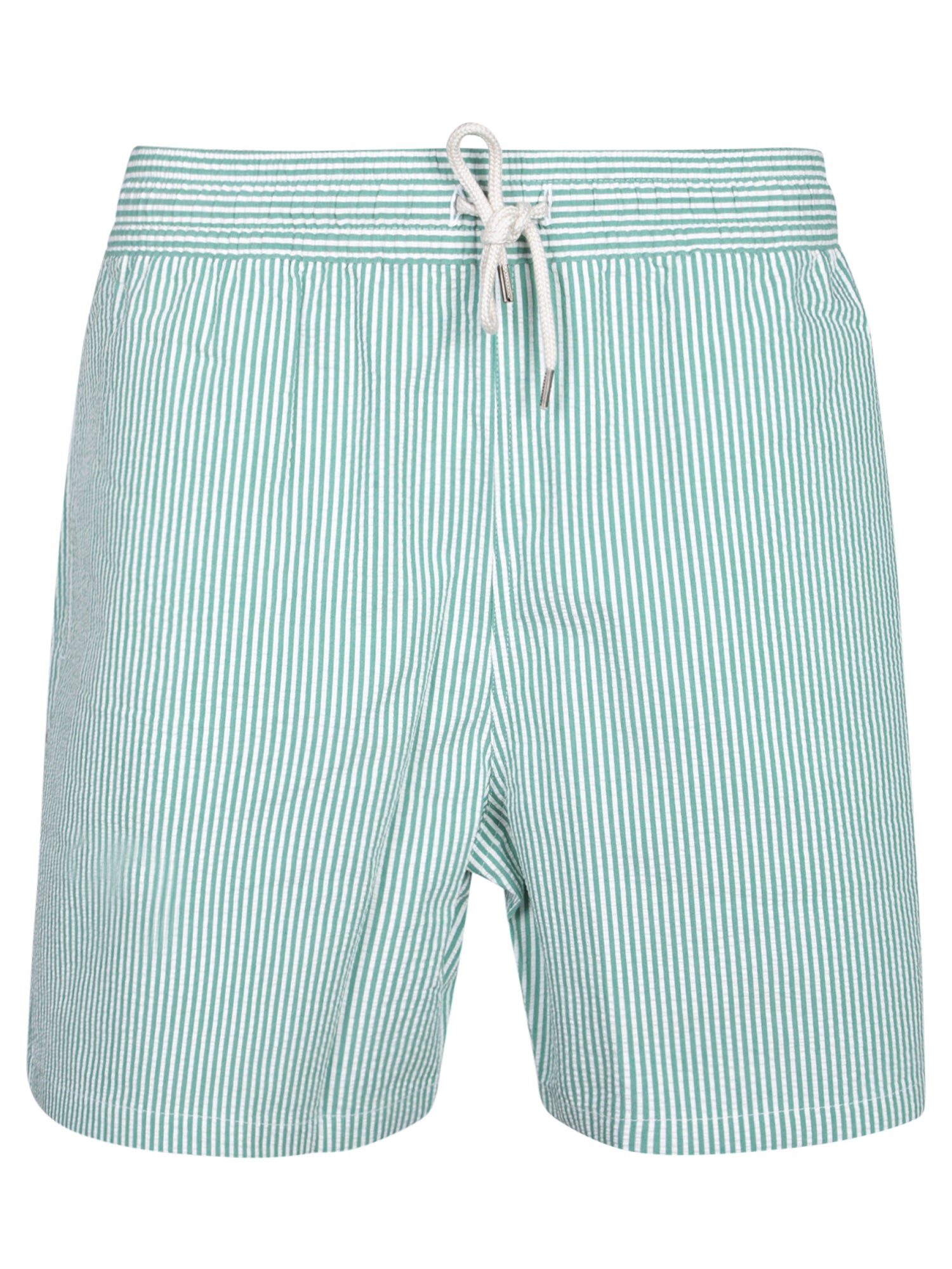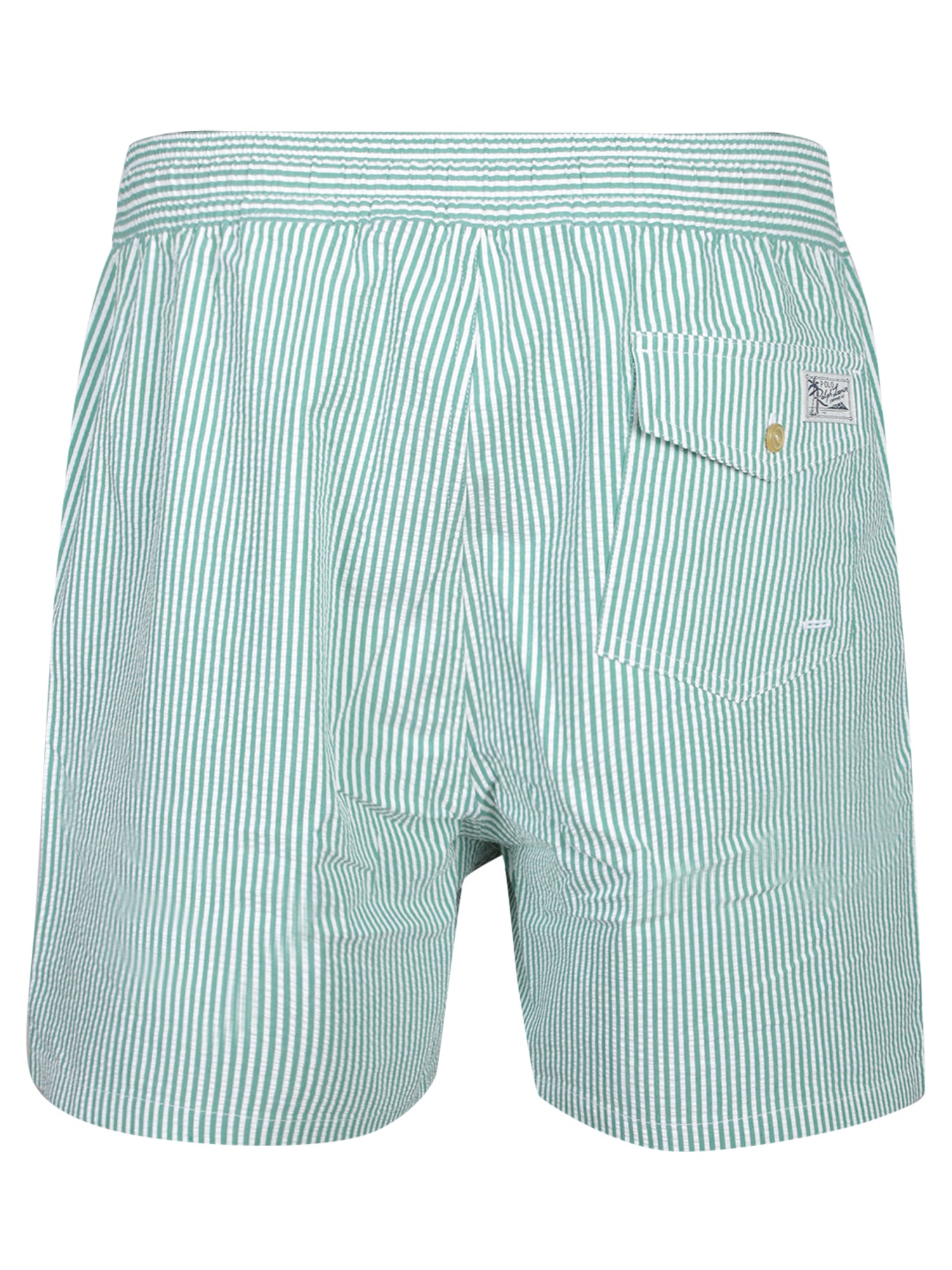 Designed to provide both comfort and style at the beach, this Polo Ralph Lauren swimsuit features lightweight and breathable seersucker fabric, perfect for hot days. The white and green stripes add a touch of nautical elegance.
