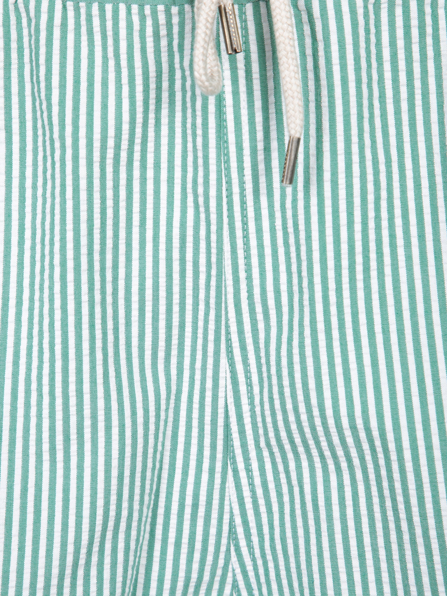 Seersucker fabric swimsuit. White and green striped pattern. Elastic waistband with drawstring.