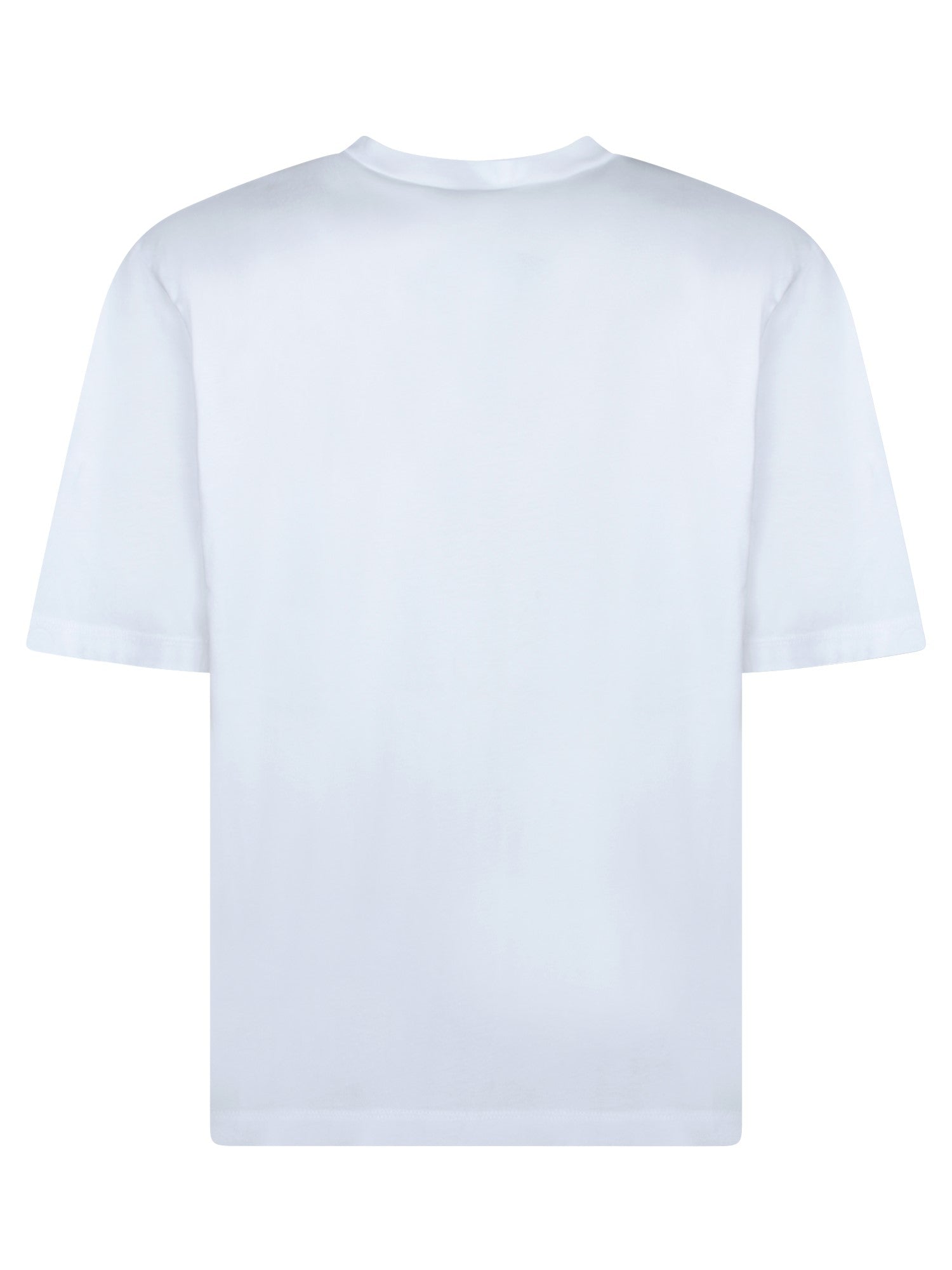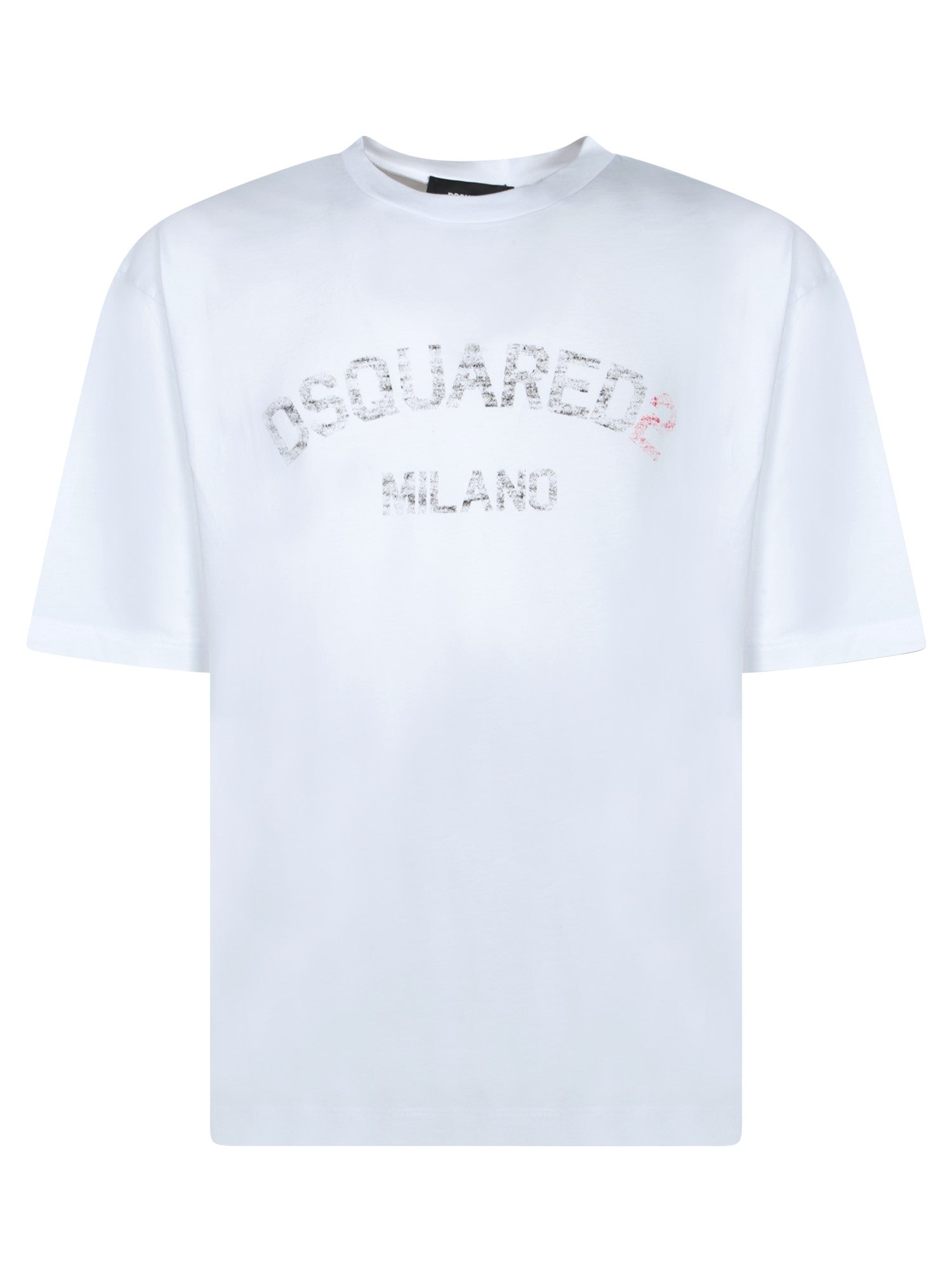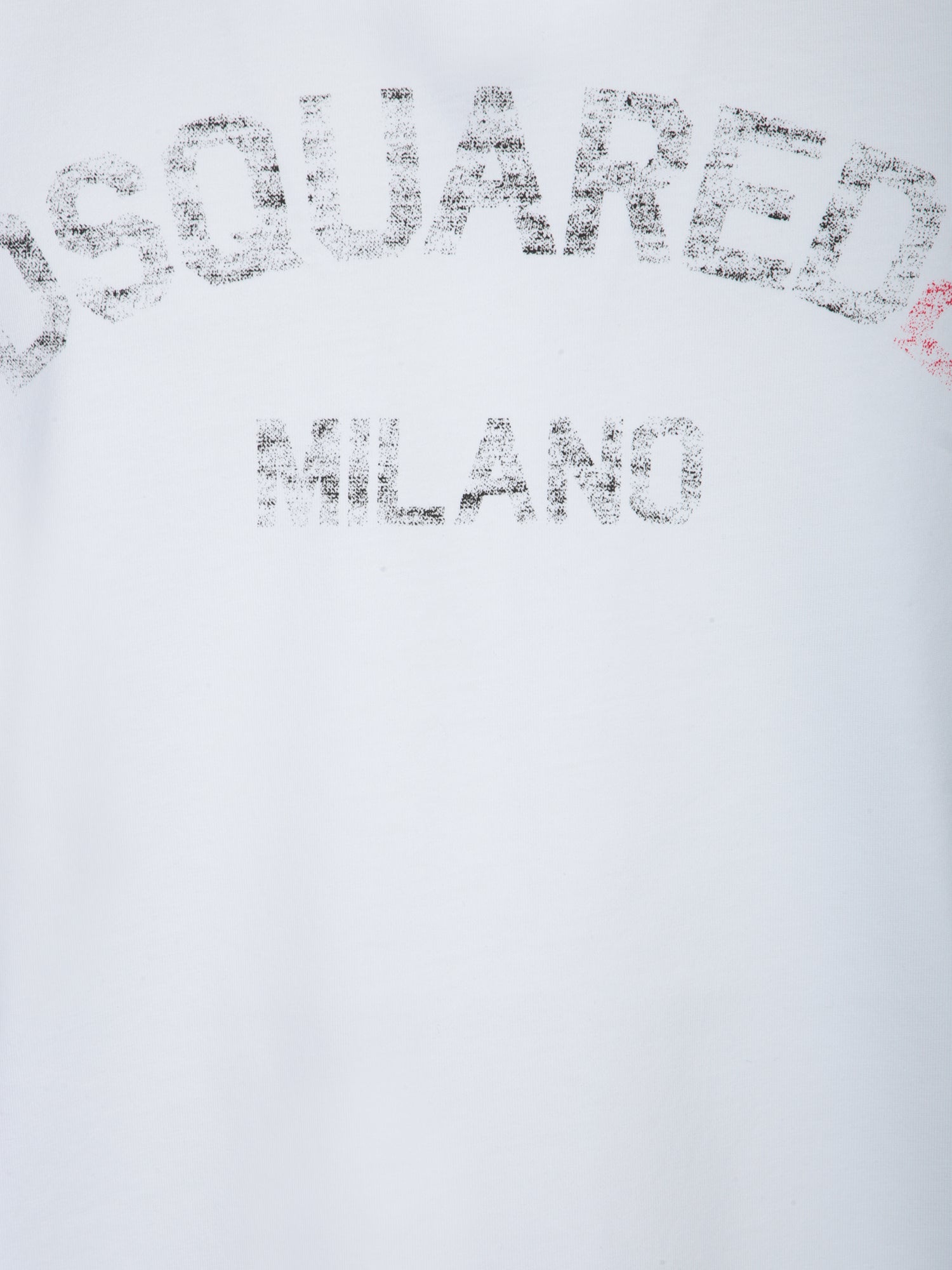 Short-sleeve white cotton t-shirt. 'DSQUARED2 MILANO' logo embellished with faded details on the front.