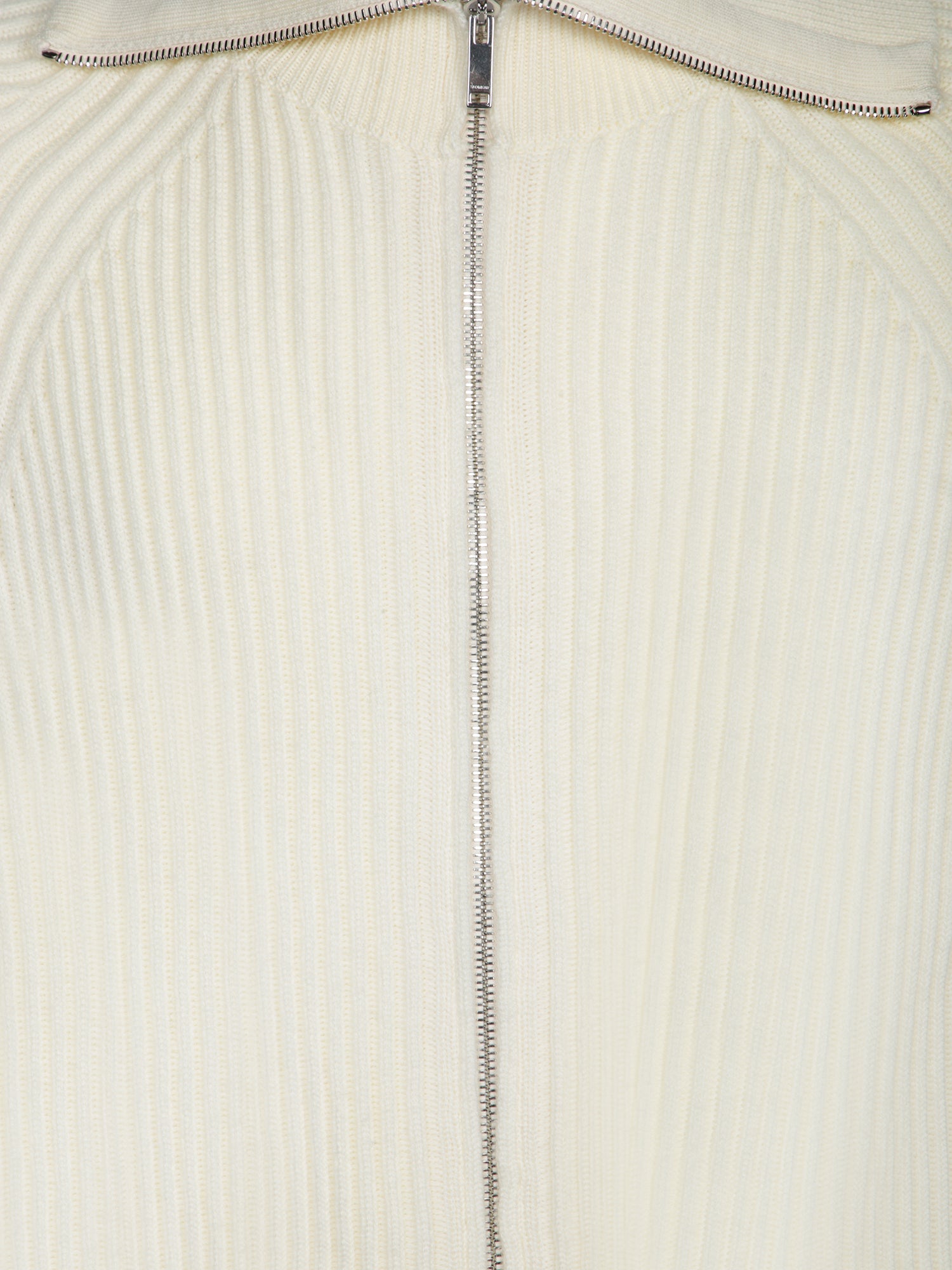Wool sweater, white color. Full-length central zipper closure. High collar.