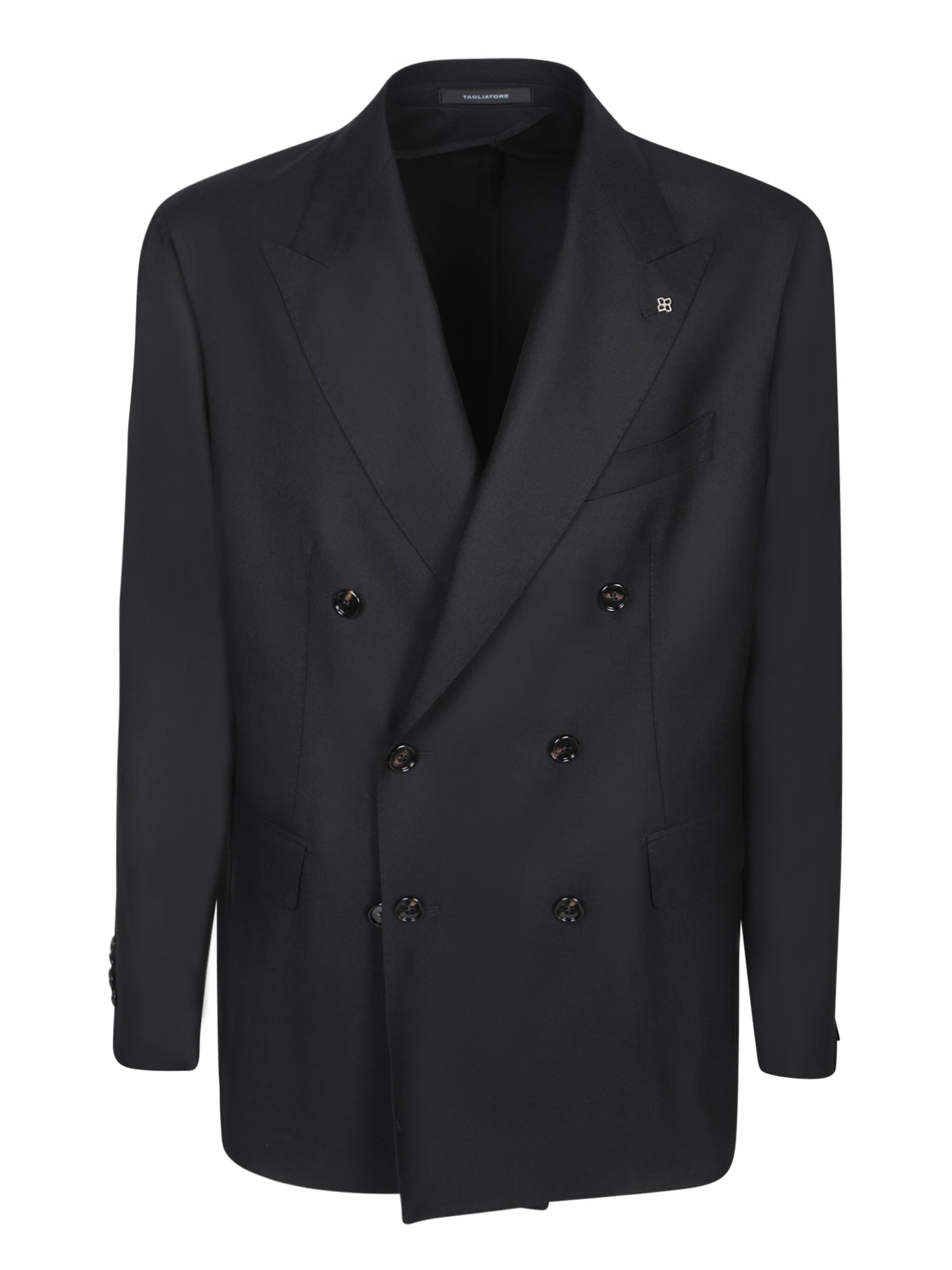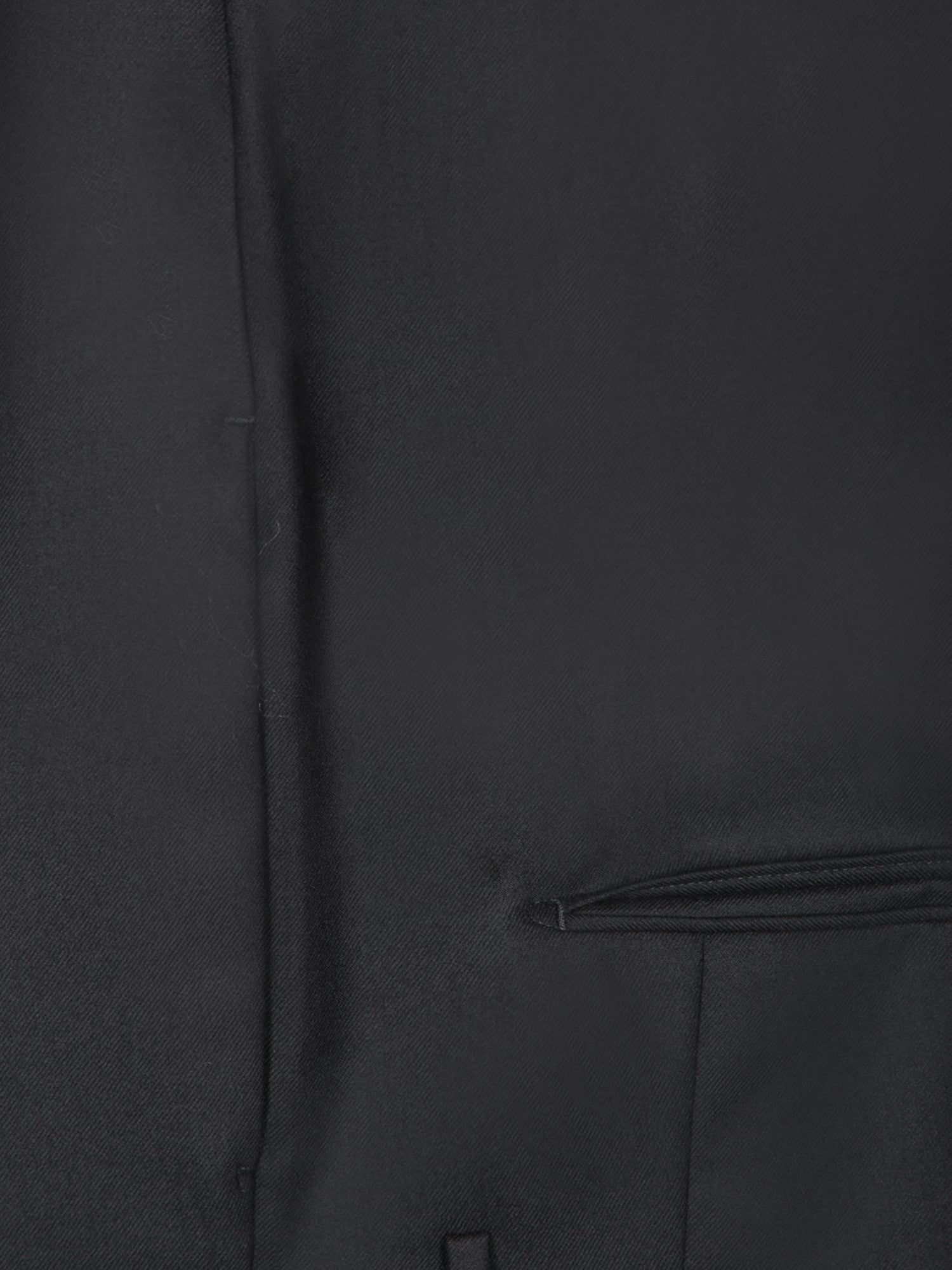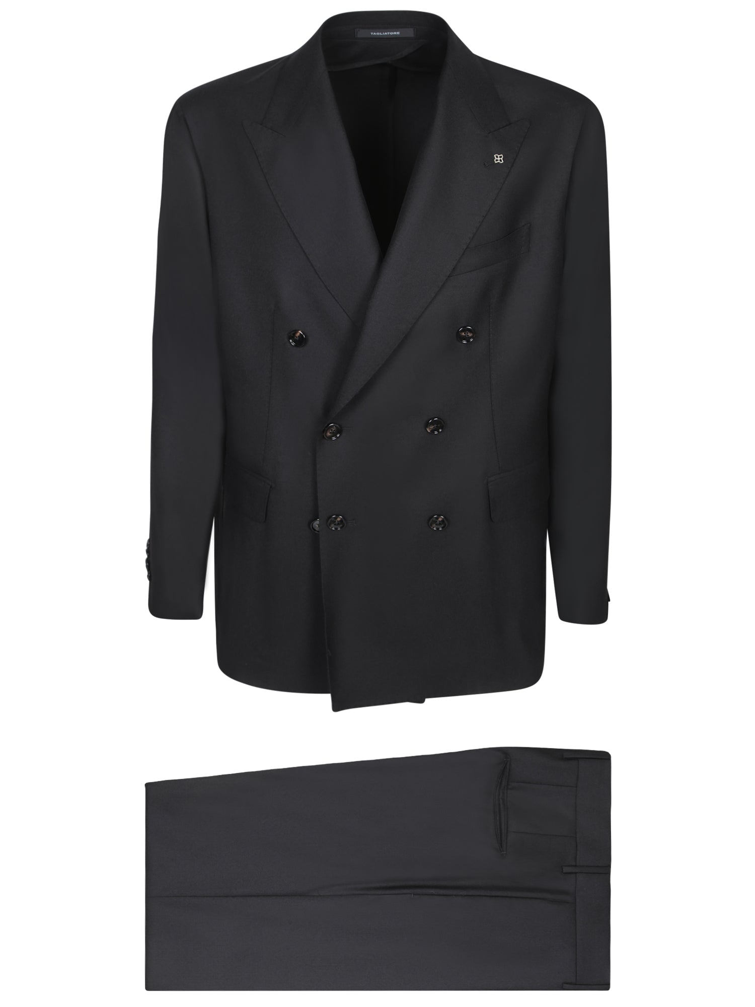 Double-breasted suit with six buttons. Welt pockets at chest and hips. Buttoned cuffs.