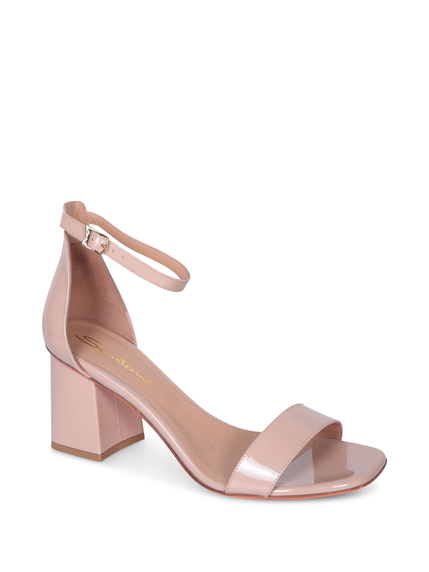 Glossy finish. Open square toe. Logo-embossed leather insole. 75mm high heel. Buckled ankle closure.