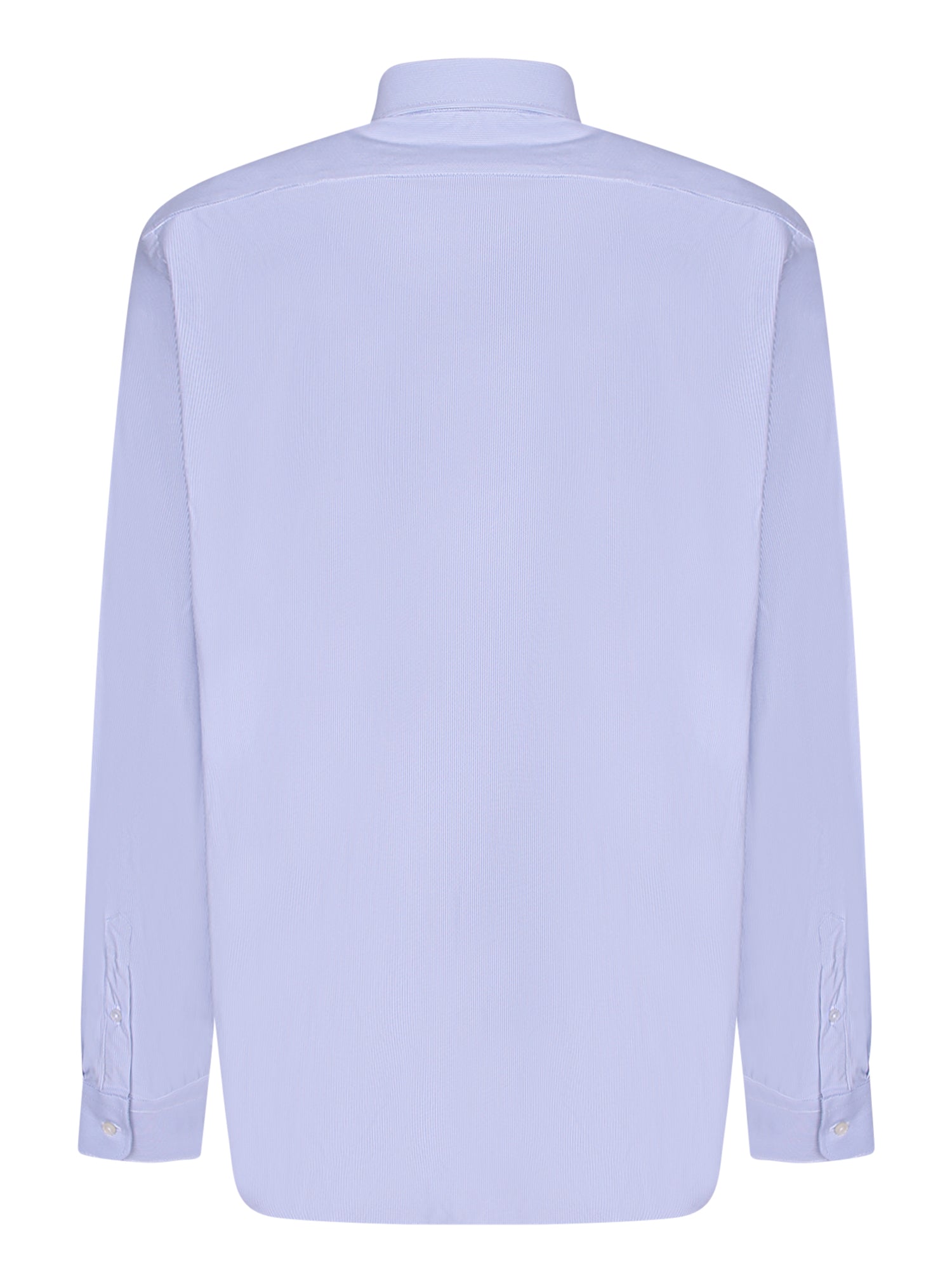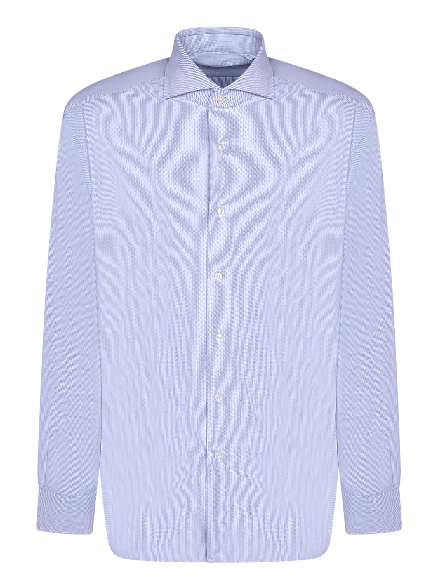 Classic collar, button closure, and long sleeves.