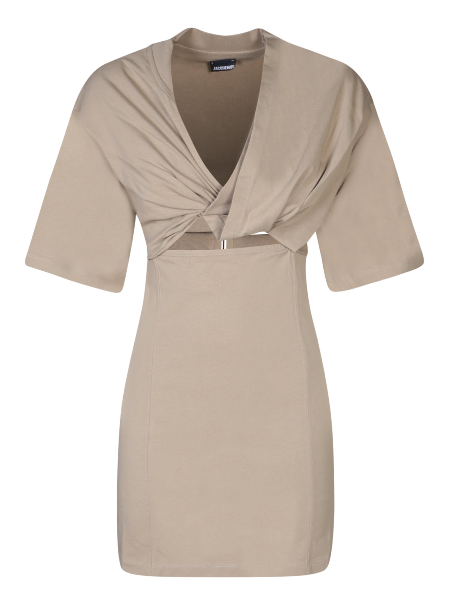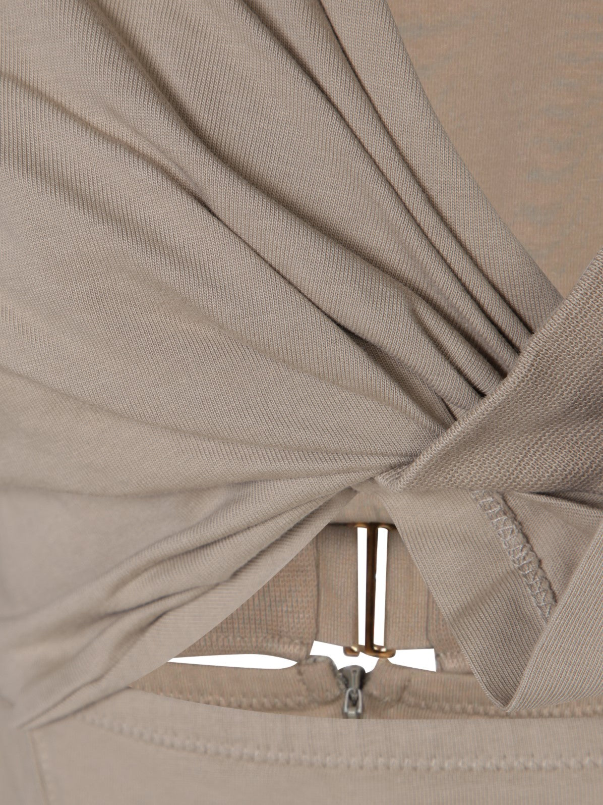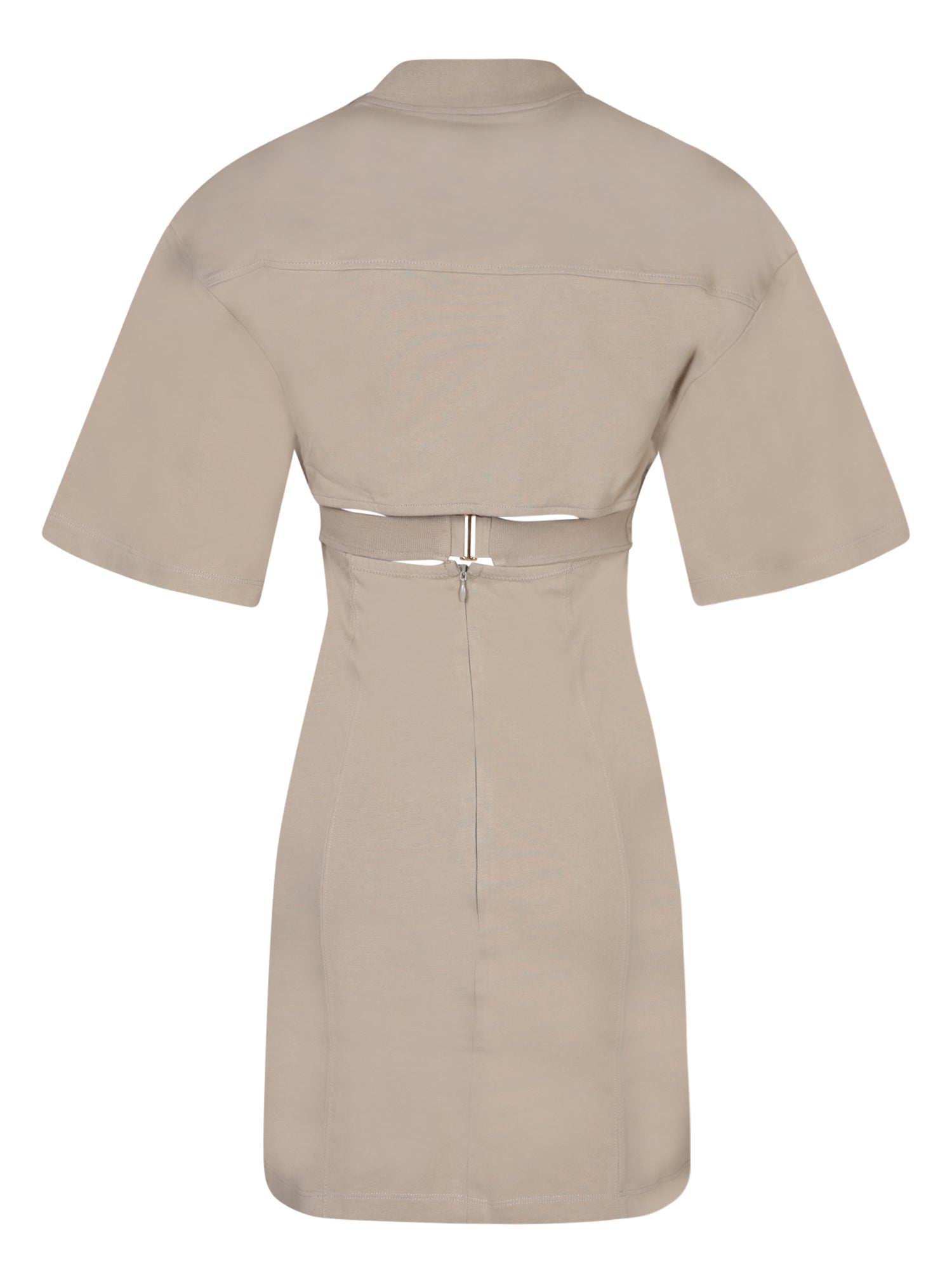 Rear hook-and-eye and concealed zipper fastening. Front cut-out detail. Crisscross at breast. Short sleeve.