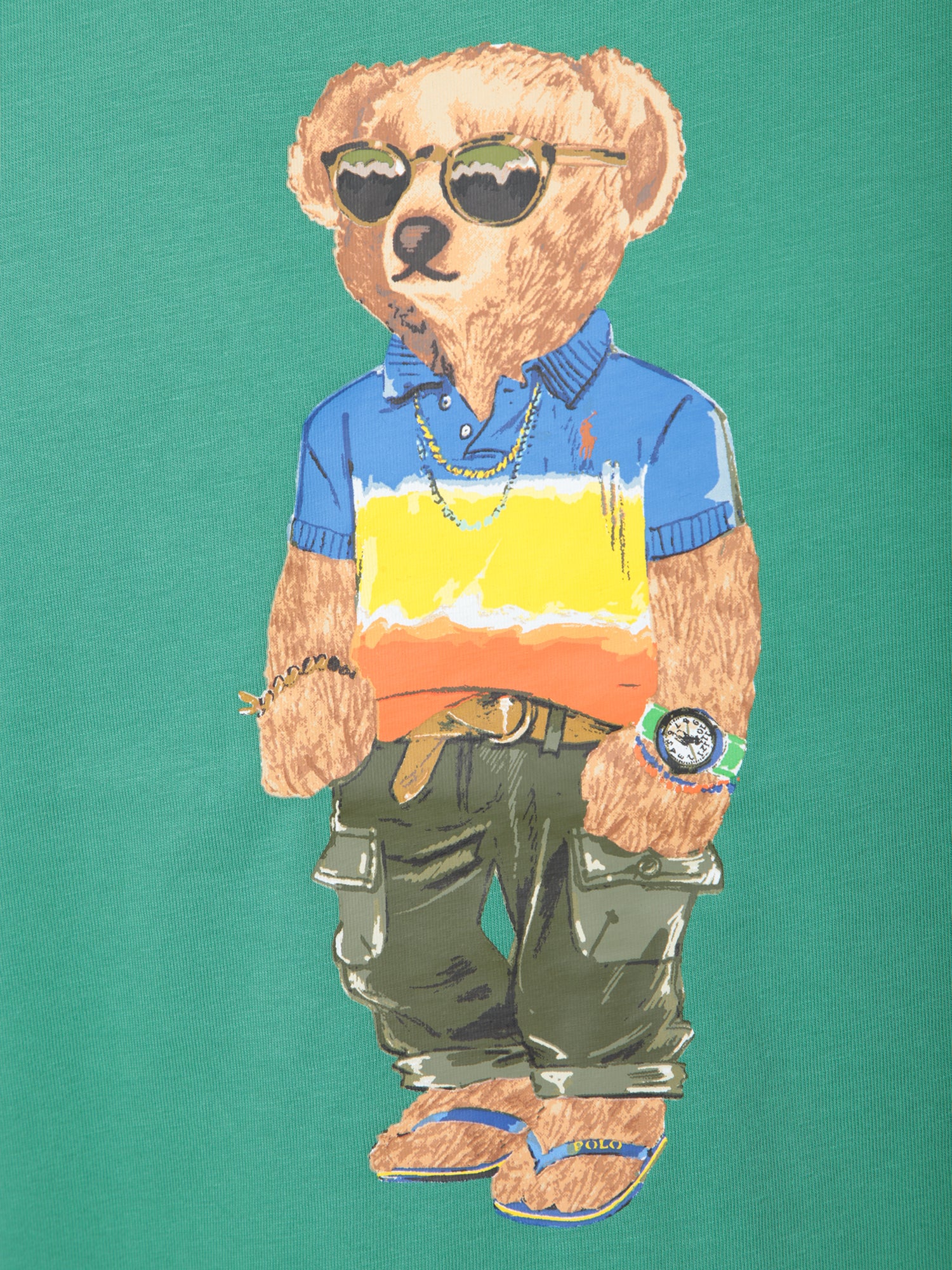 Discover Polo Ralph Lauren's iconic preppy style with this green T-shirt, featuring a vibrant graphic of the mascot bear in a casual outfit.