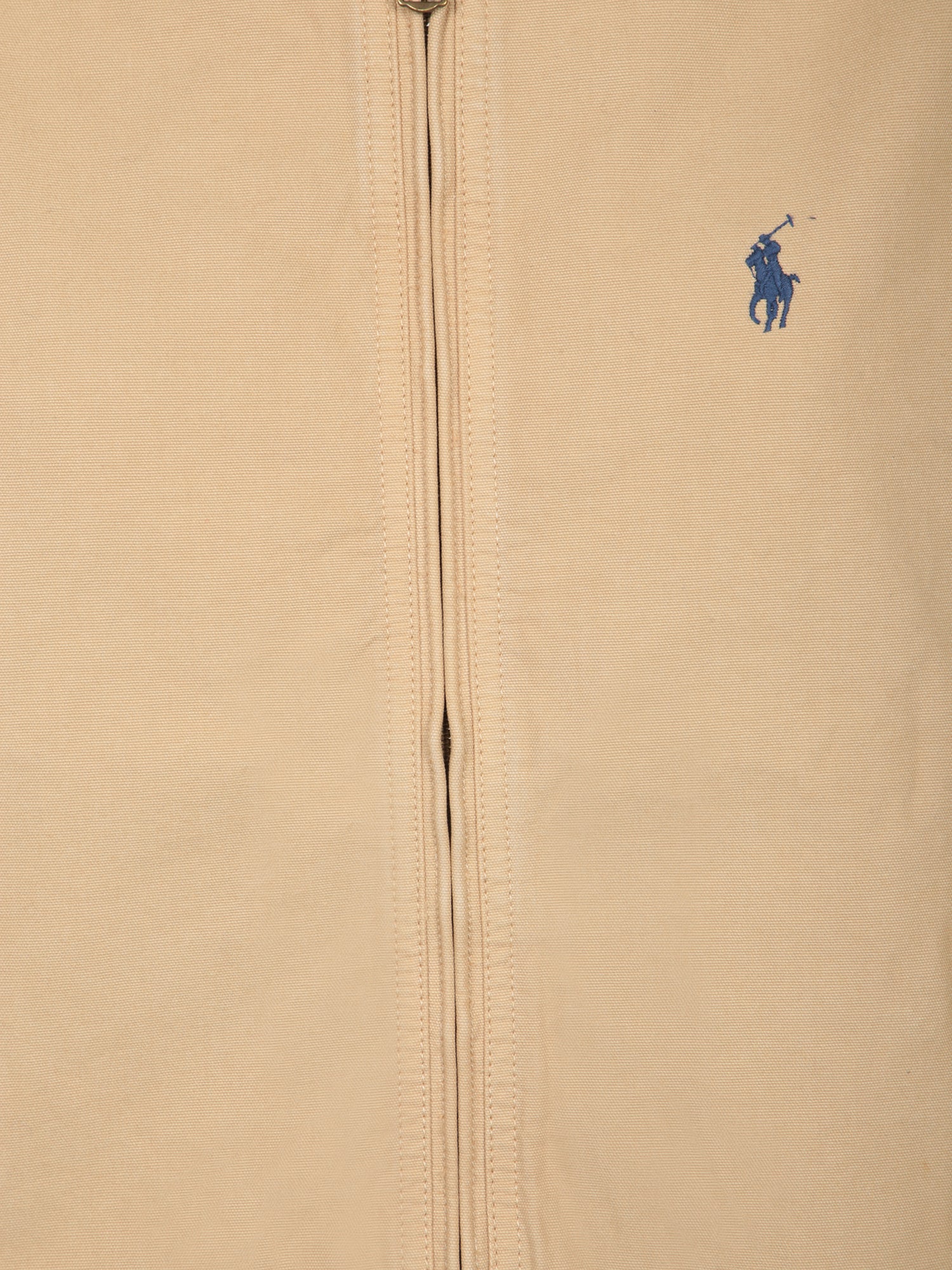 Canvas jacket with high collar, front zip closure, flap pockets, and embroidered logo on the chest.