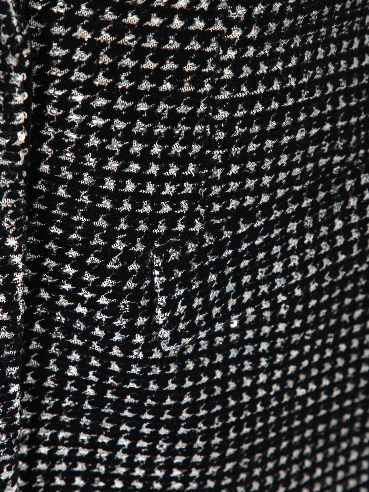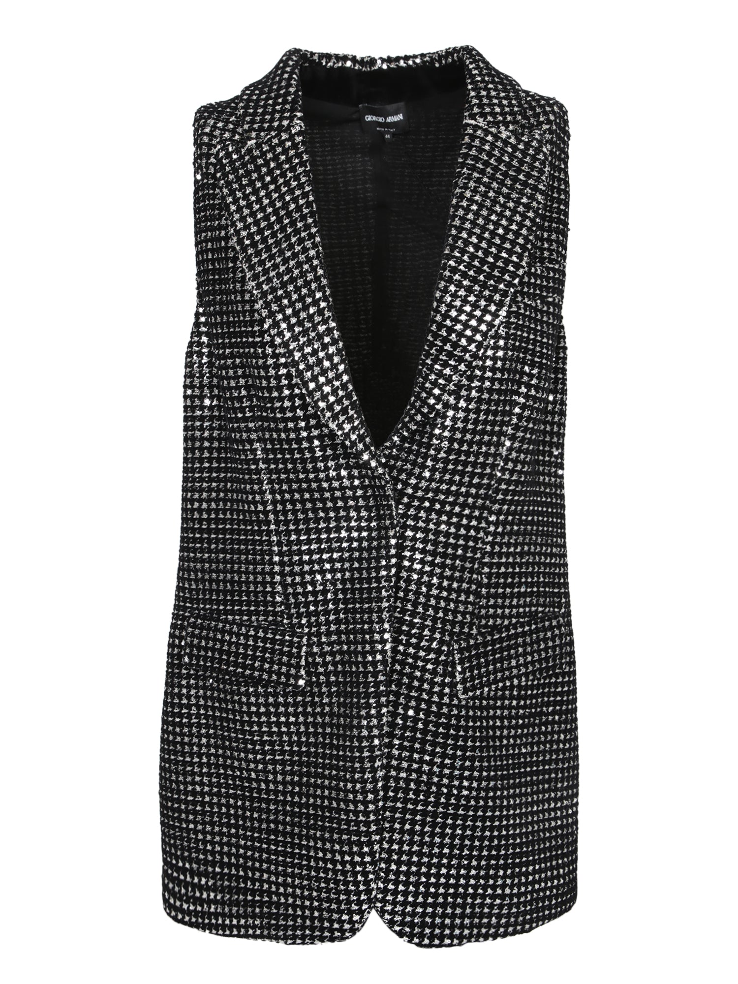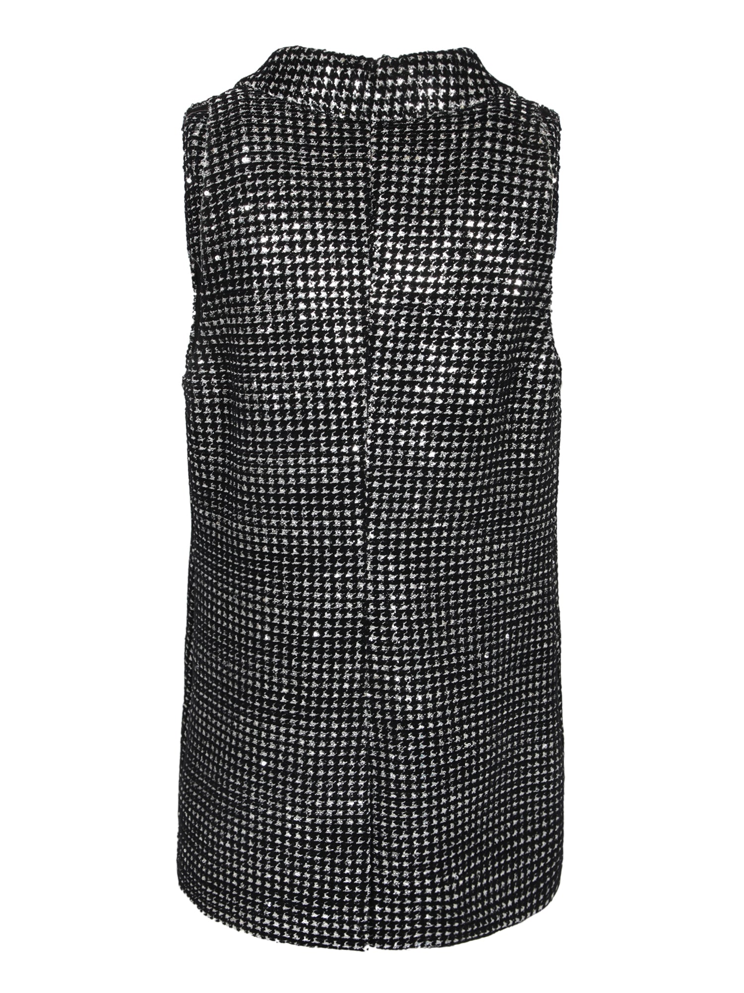 Sleeveless wool jersey vest. Black and white checked design. Deep V-neckline.