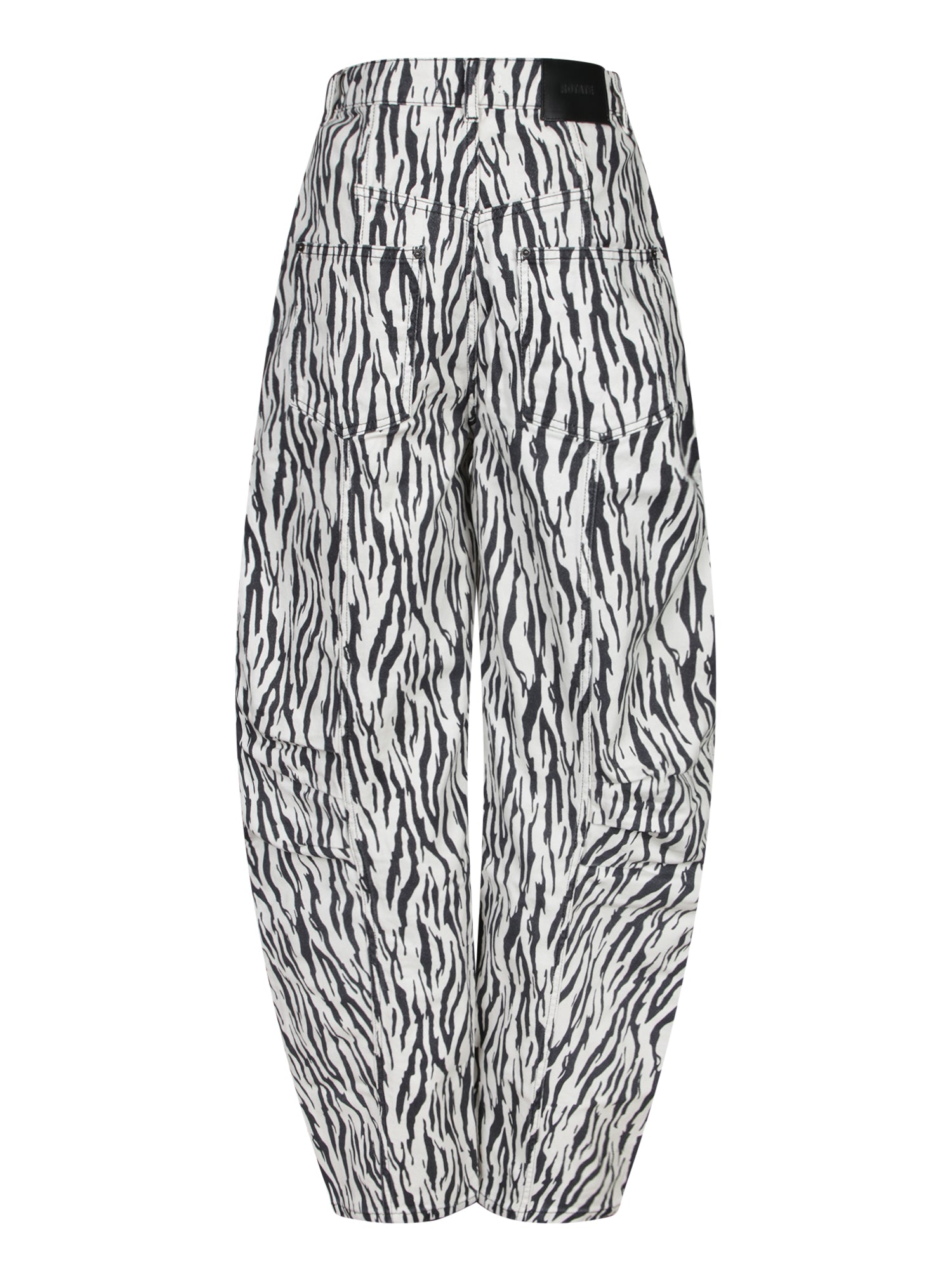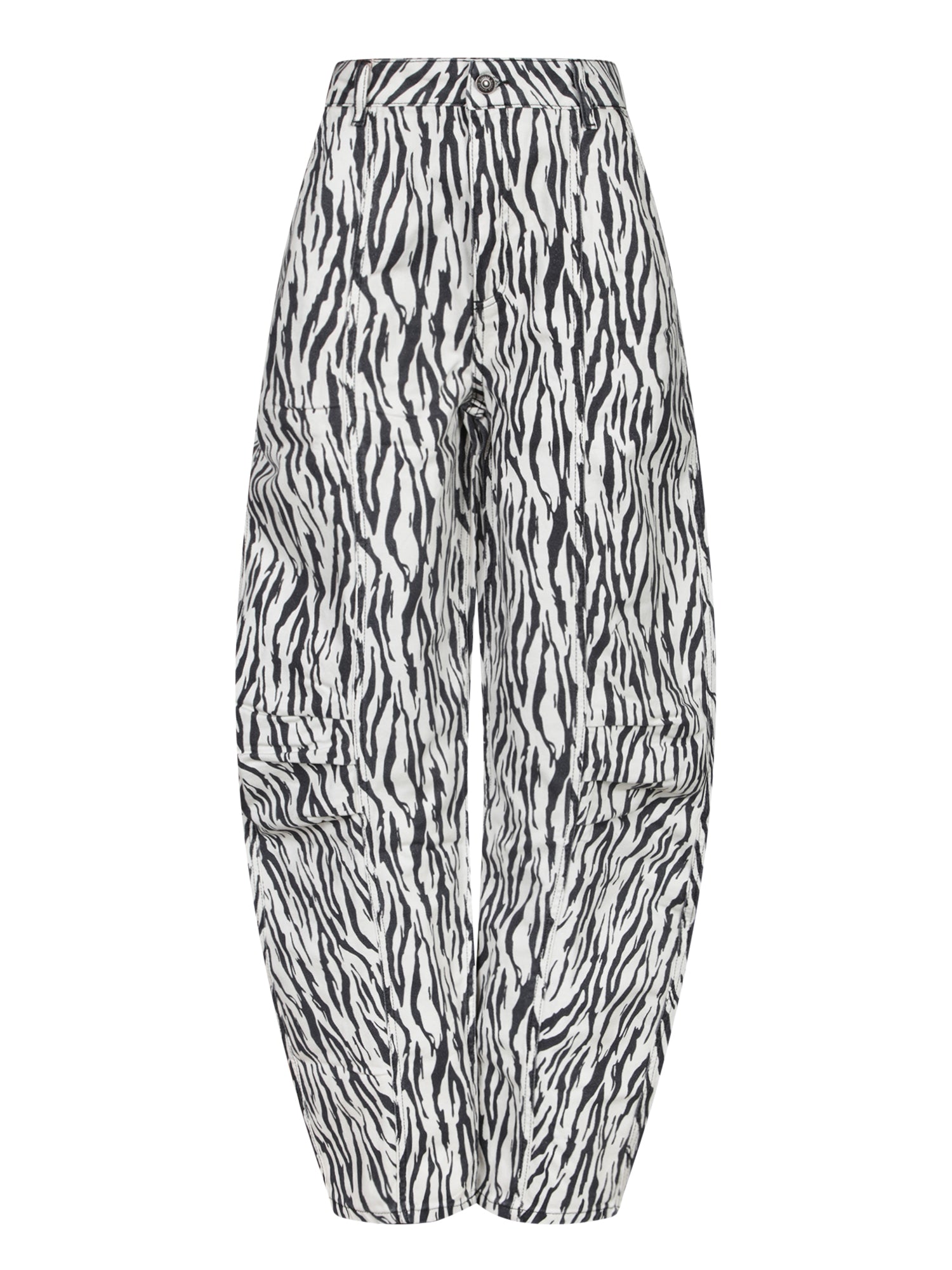 Wide-leg cargo pants with zebra print. Equipped with side pockets and zip closure.