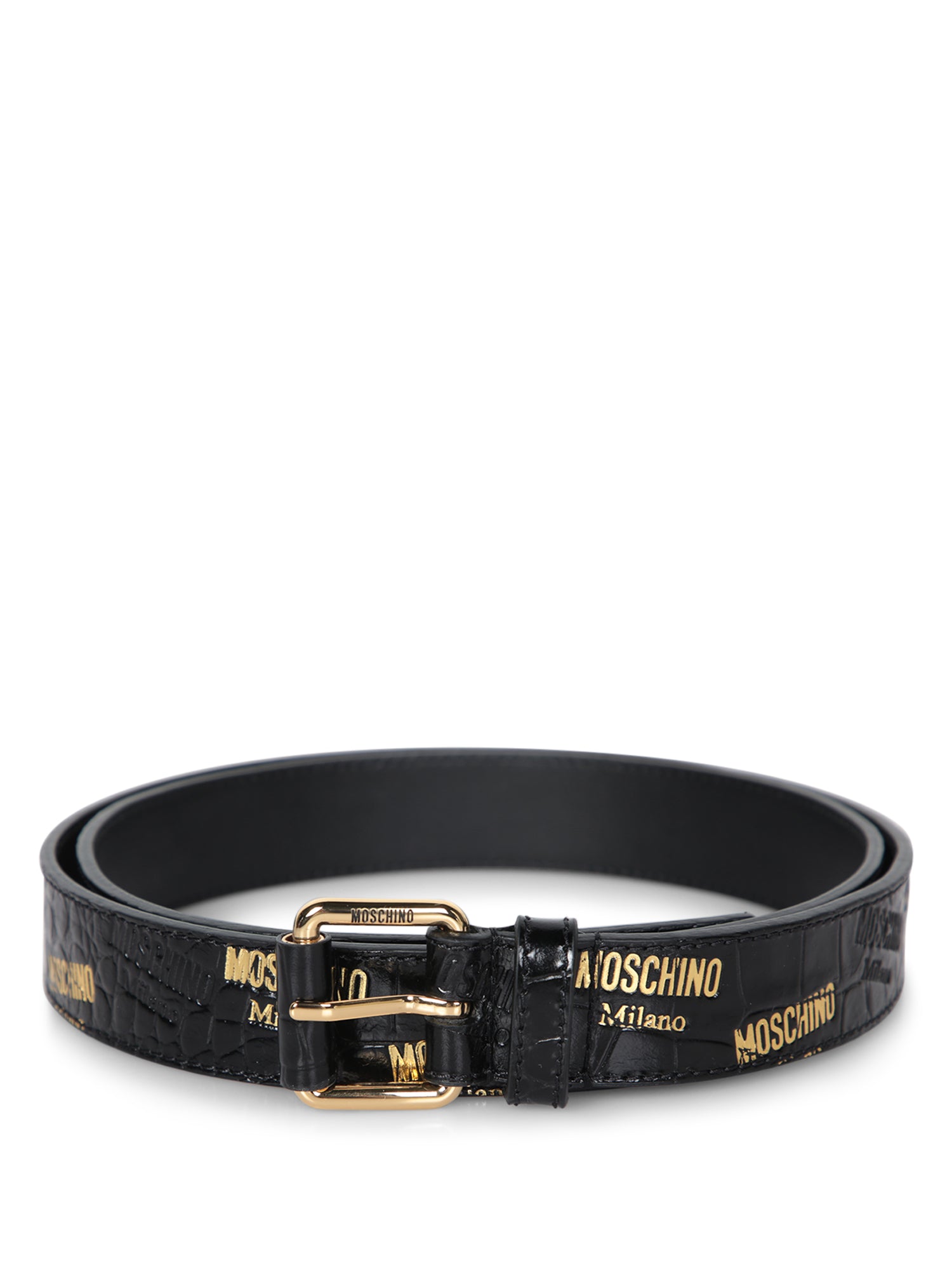 Crocodile-effect leather belt. Gold-tone buckle with logo. All-over logo print.