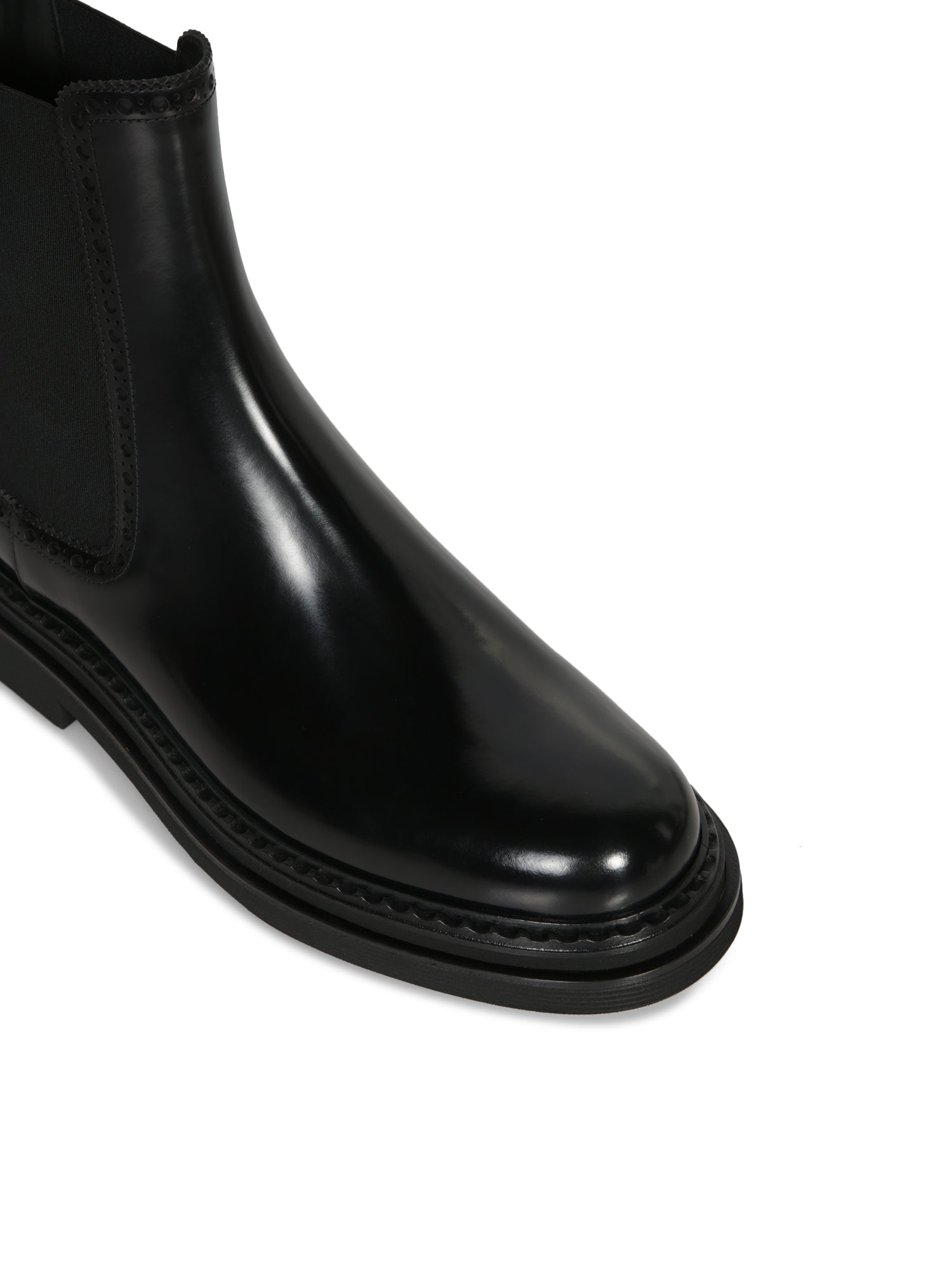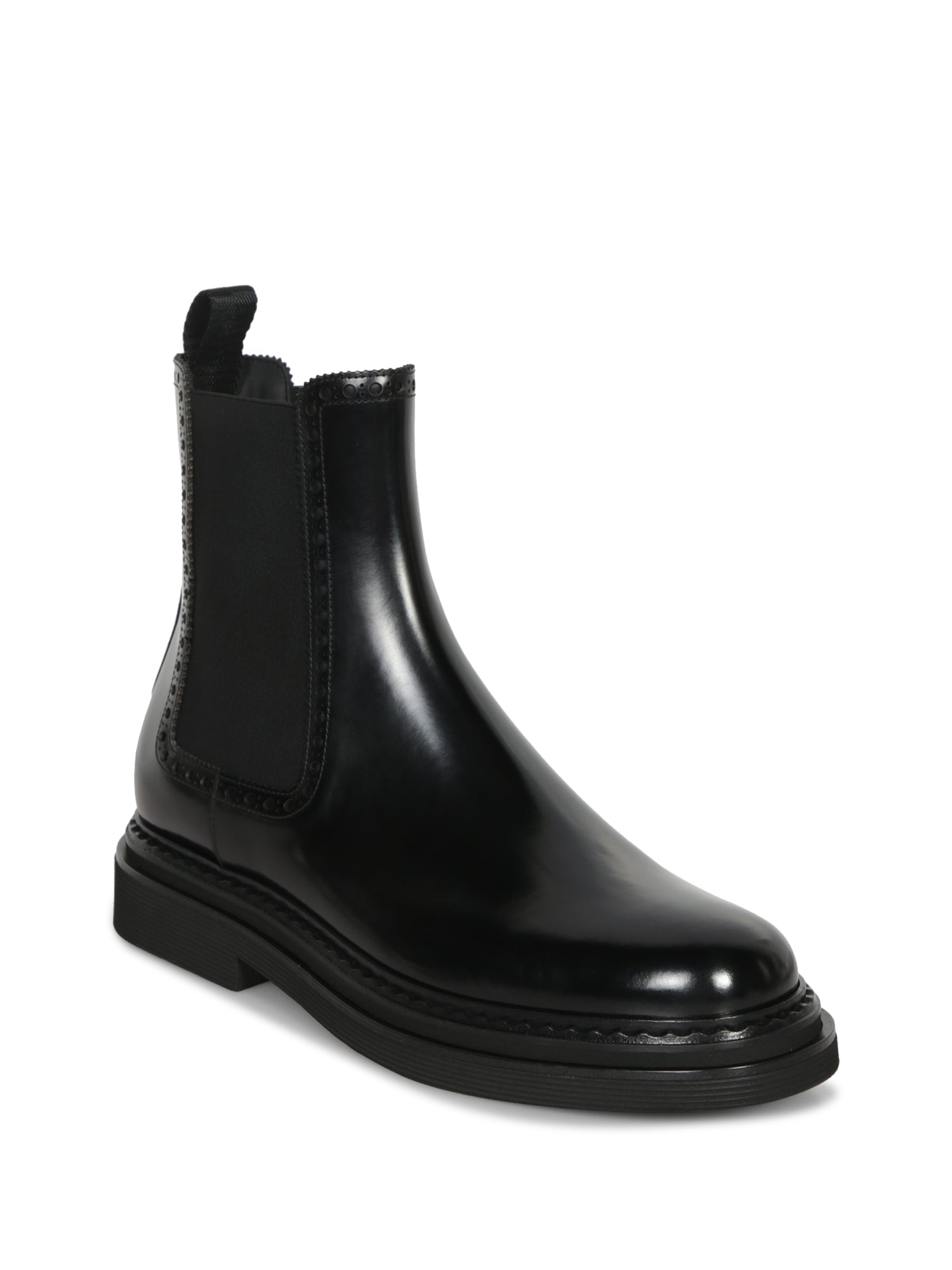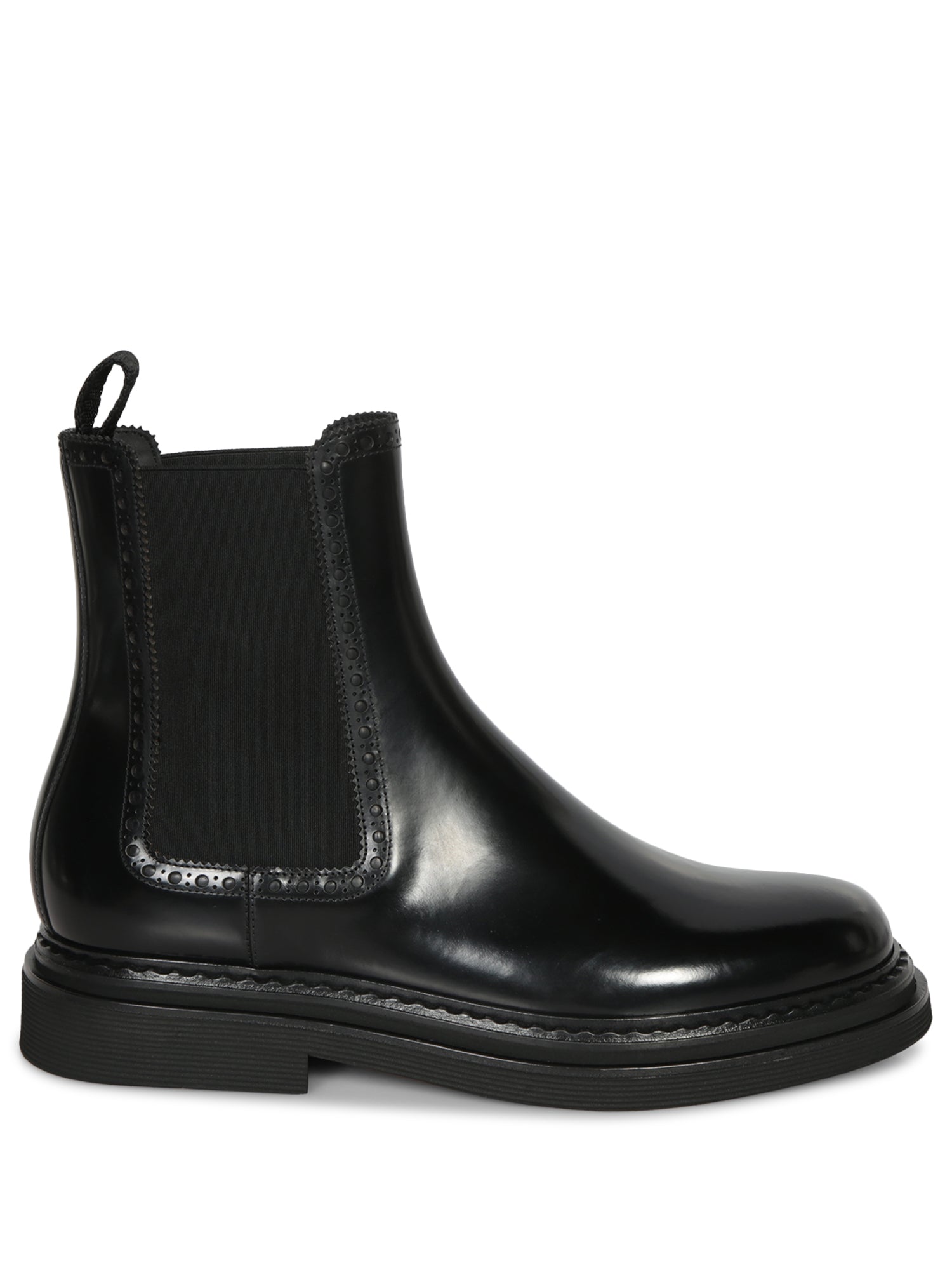 Defined by a classic silhouette and timeless elegance, this black leather ankle boot from Dolce & Gabbana features elastic inserts for comfortable wear and a sturdy outsole for optimal grip.