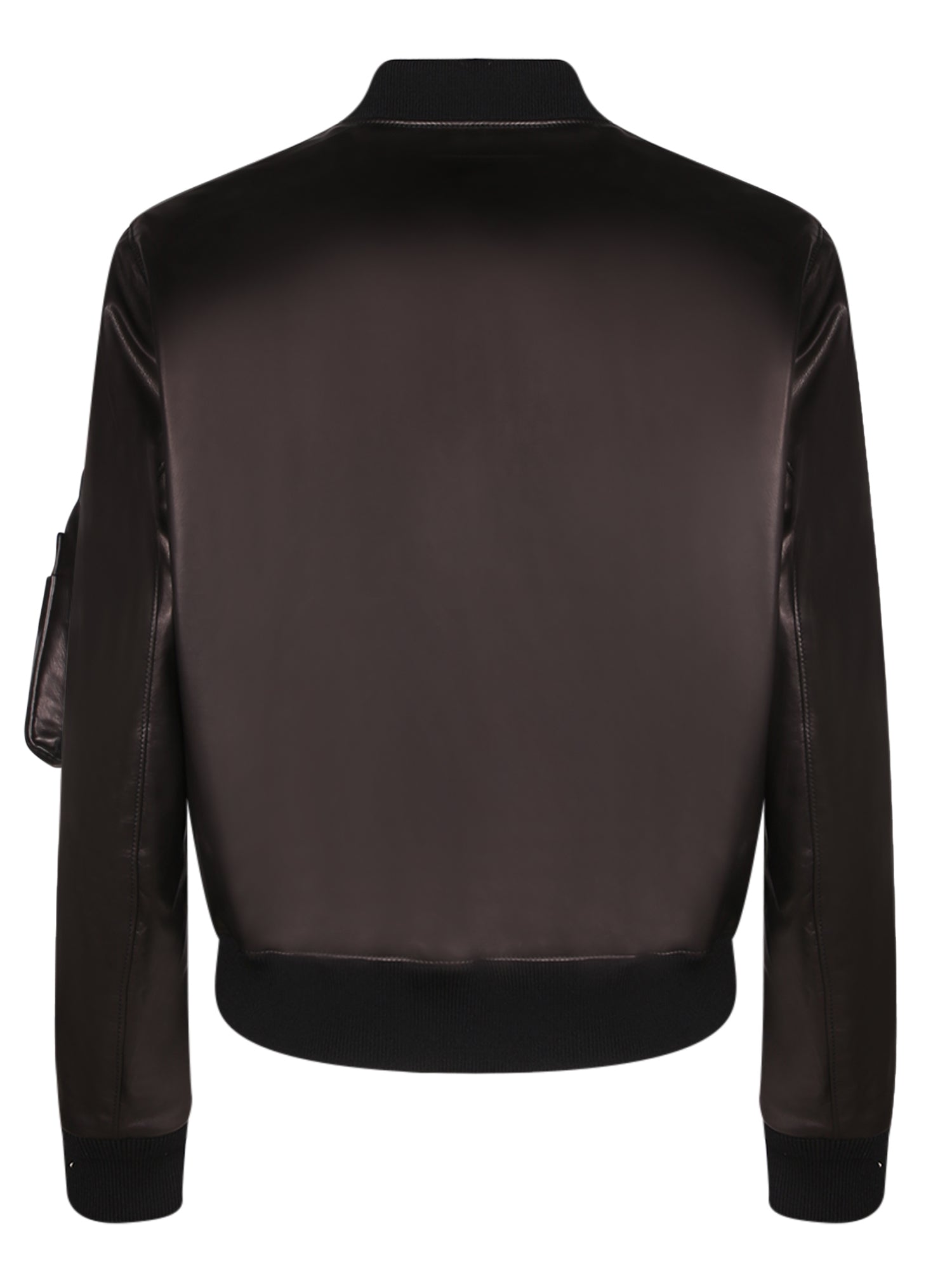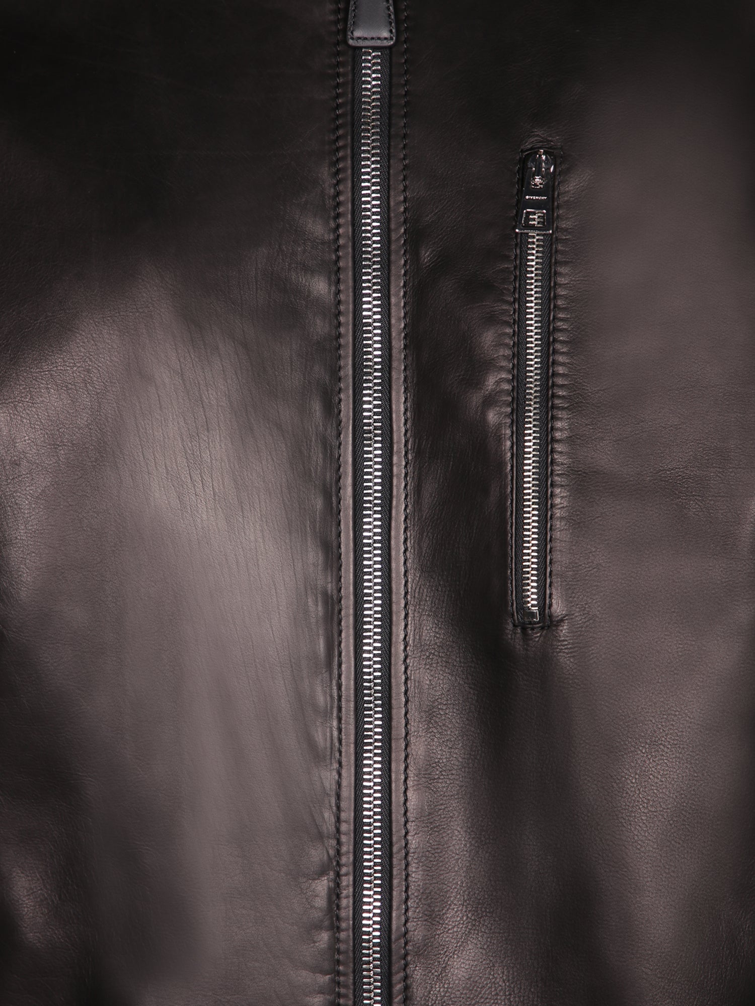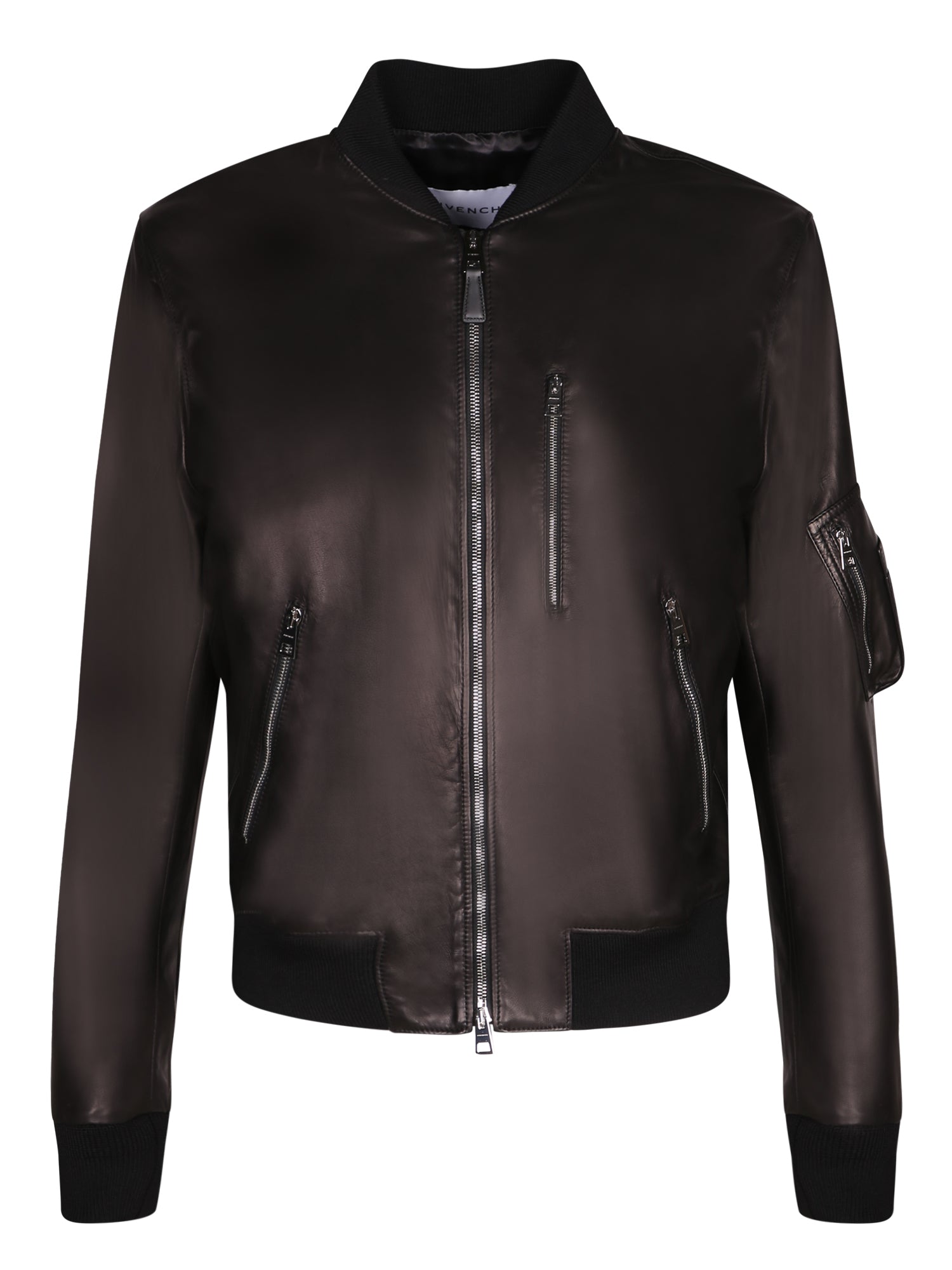 Smooth leather jacket with central zip closure. Side zip pockets and left sleeve zip pocket. Ribbed cuffs and hem.