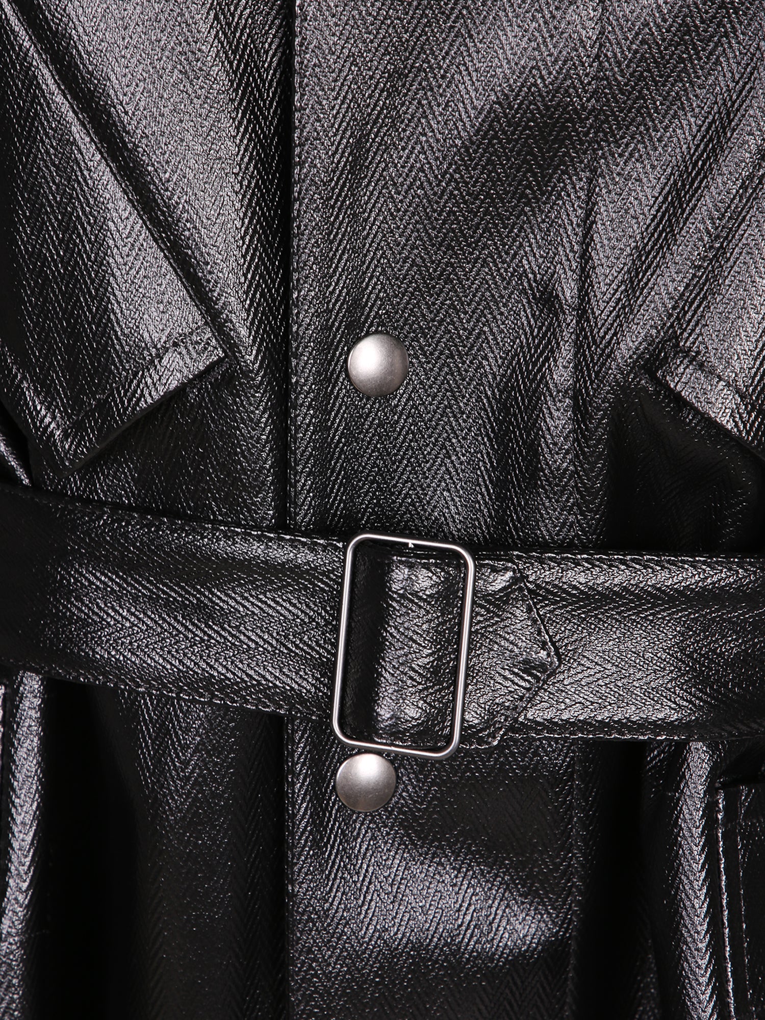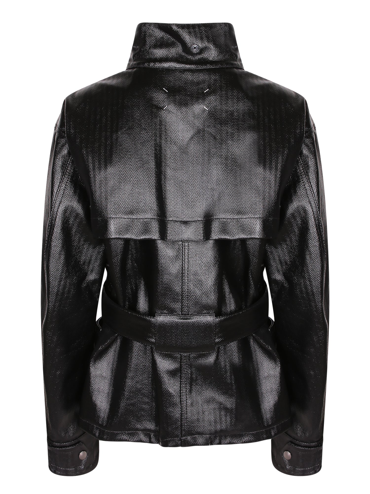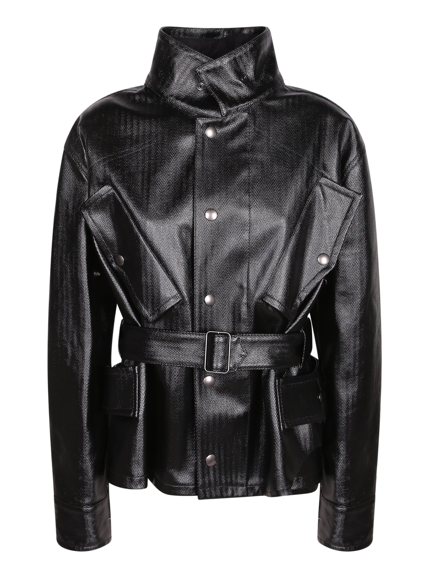 Black leather jacket with a glossy finish and herringbone pattern. Features an adjustable belt, snap button closure and high collar.
