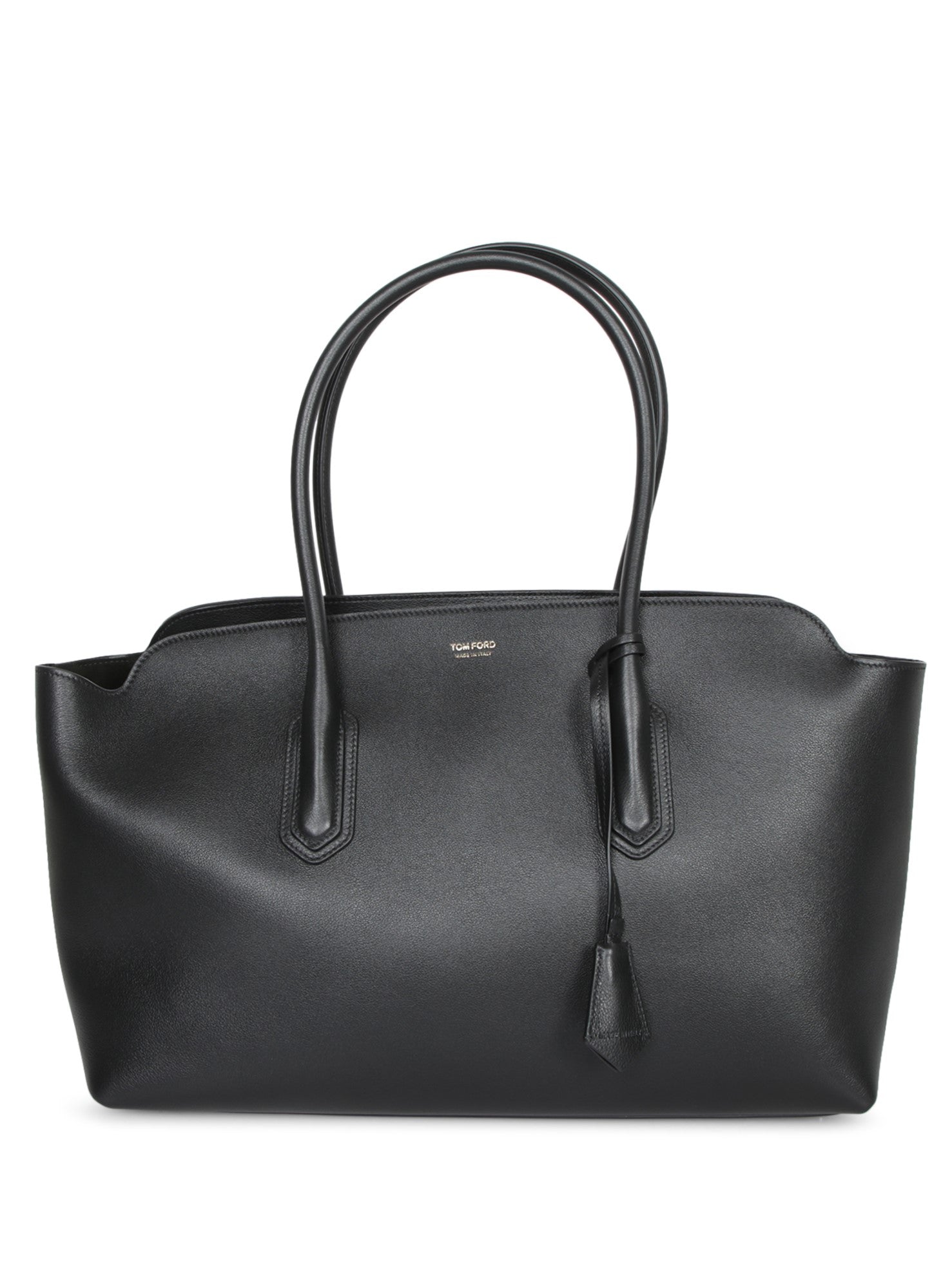 Crafted from premium black leather, this TOM FORD shoulder bag blends elegance and functionality. Featuring a roomy internal zip pocket, it offers minimalist detailing and sturdy handles for a timeless touch of class.