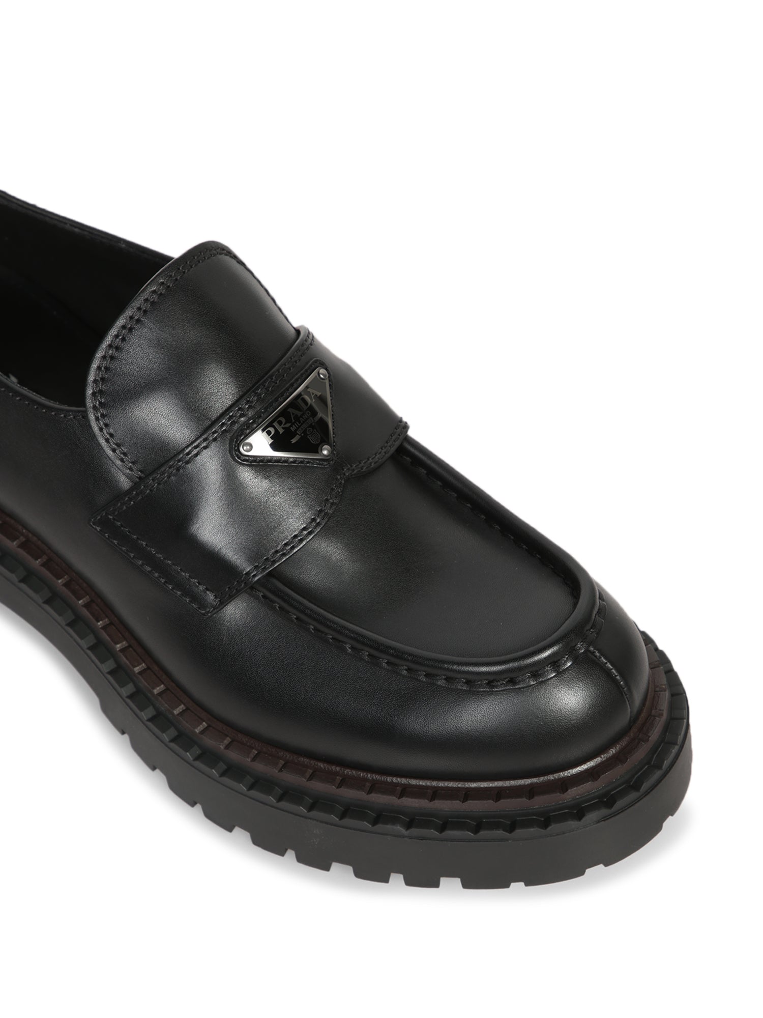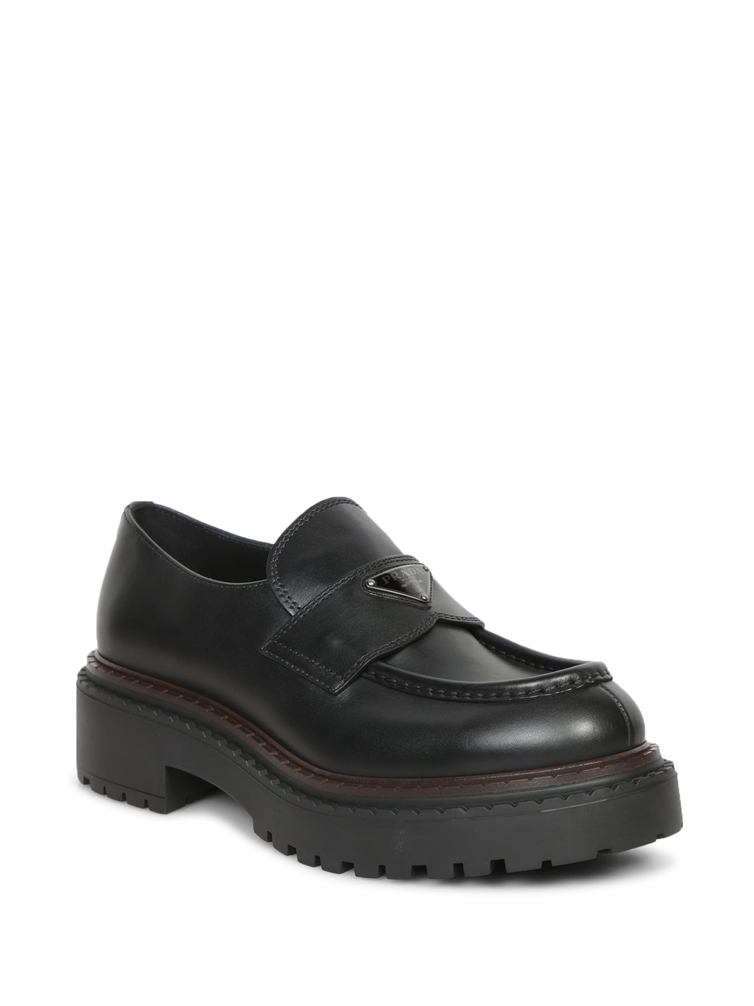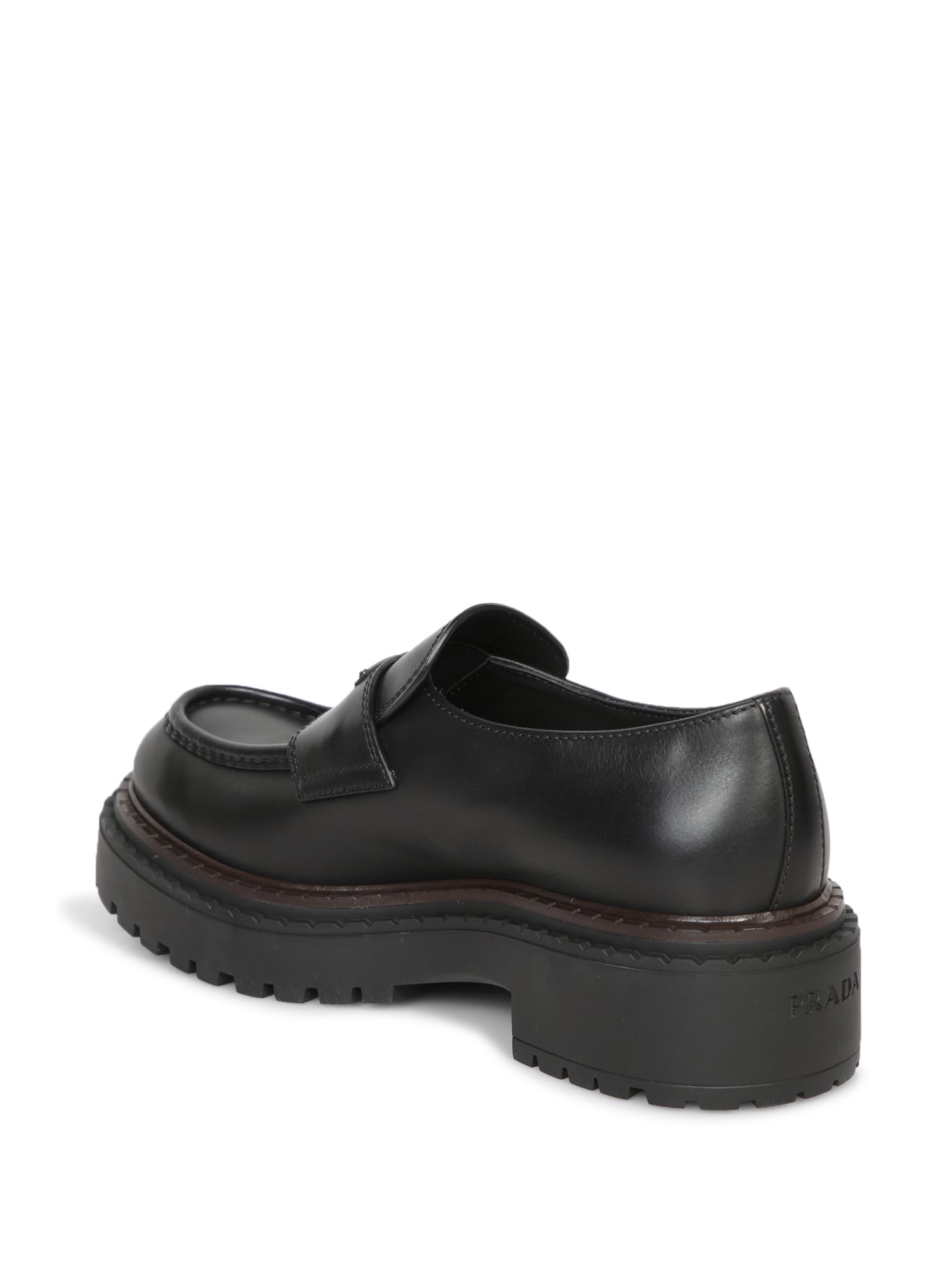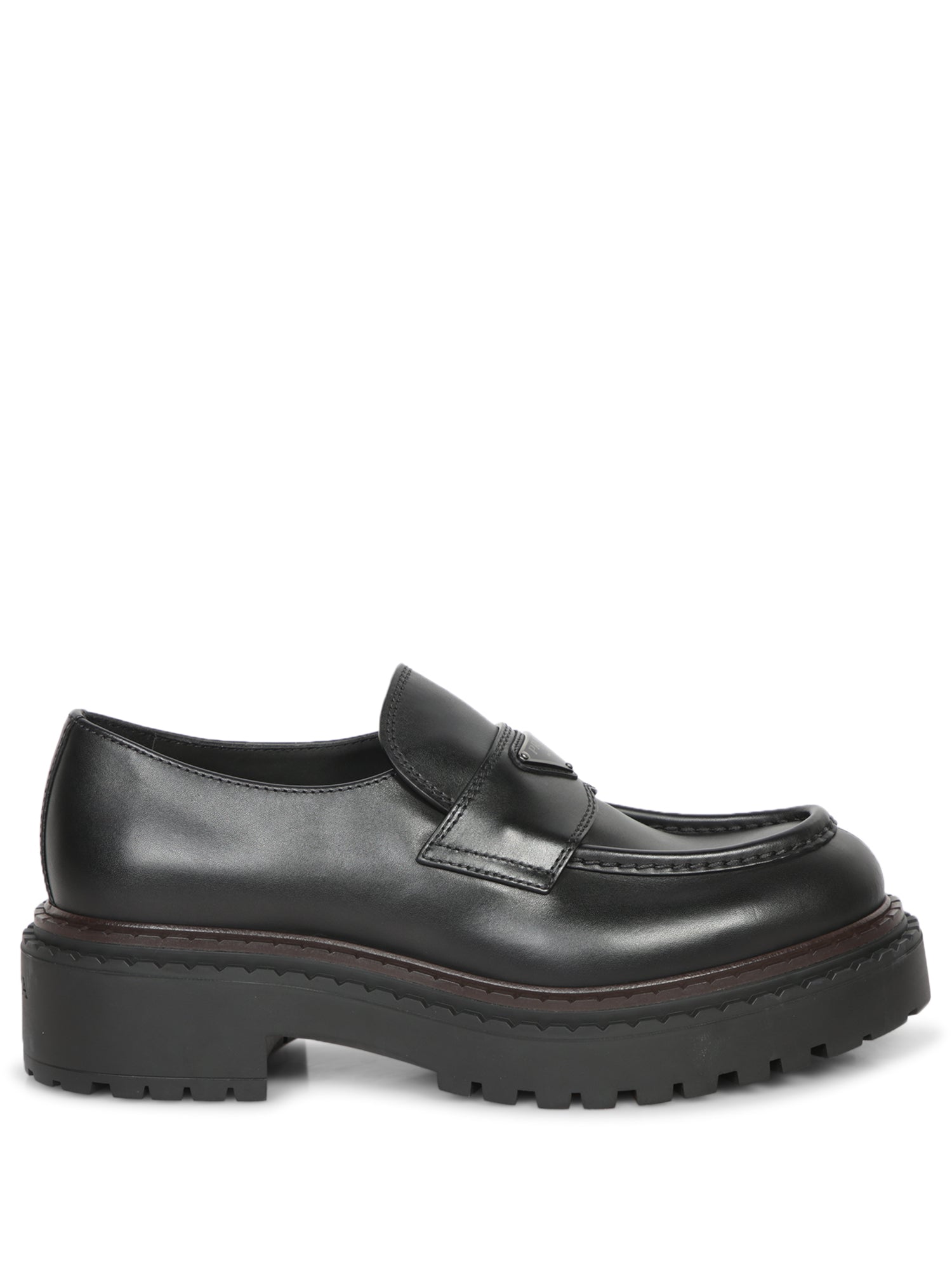 Iconic Prada loafer, crafted in high-quality black leather with a bold modern twist through its elevated rubber sole and classic penny strap detail, offering a timeless yet contemporary style.