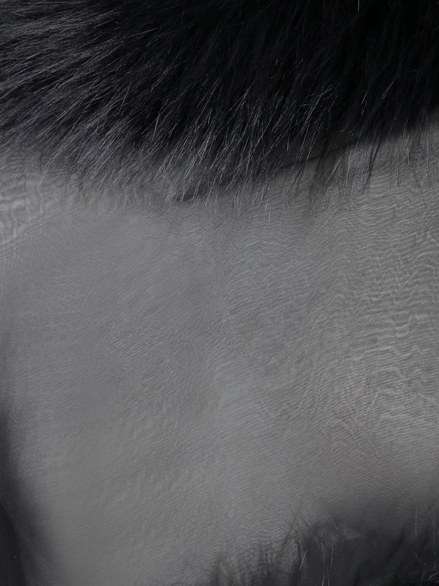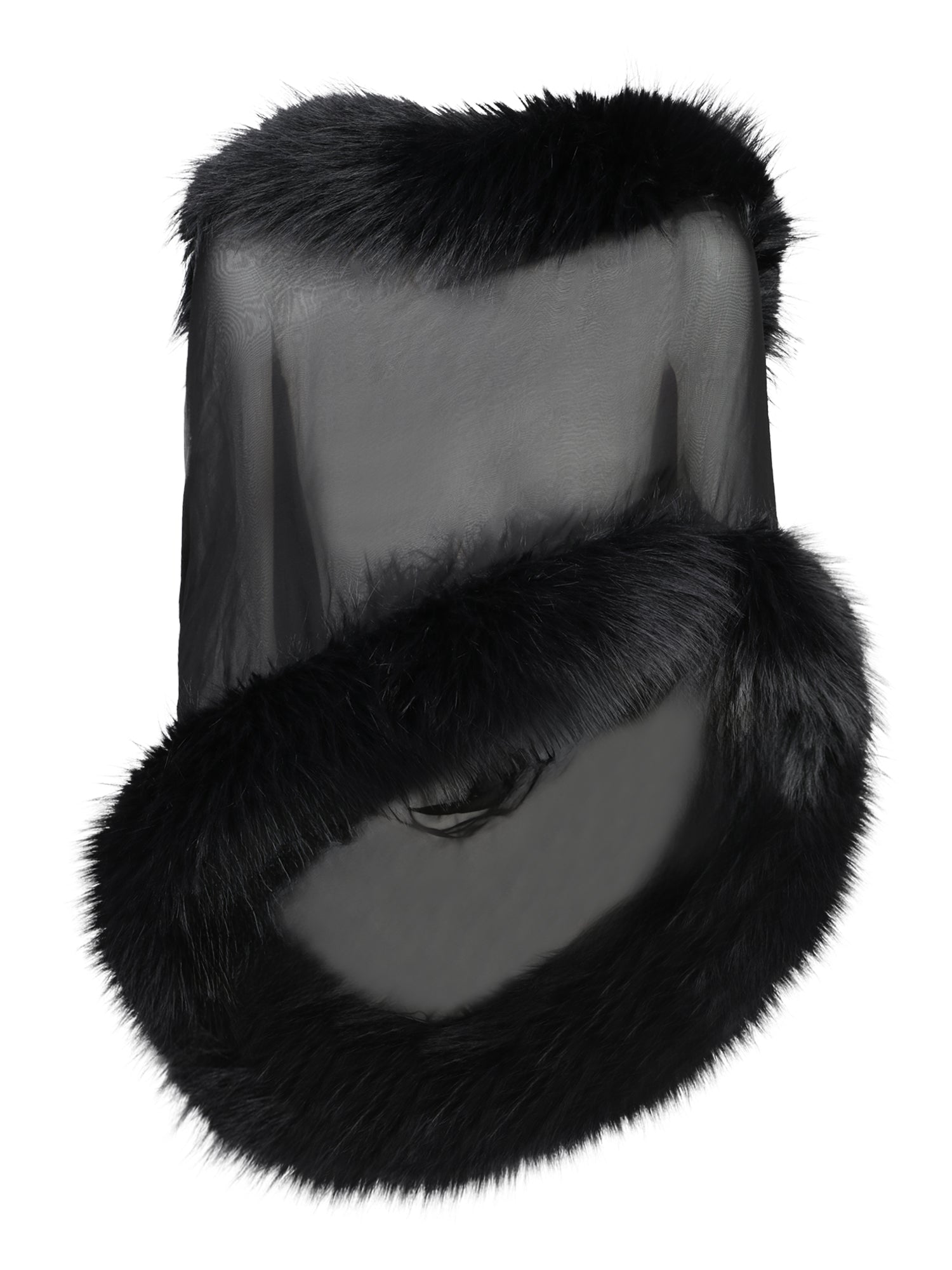 Black silk scarf with fur trim. Glossy finish and soft texture.