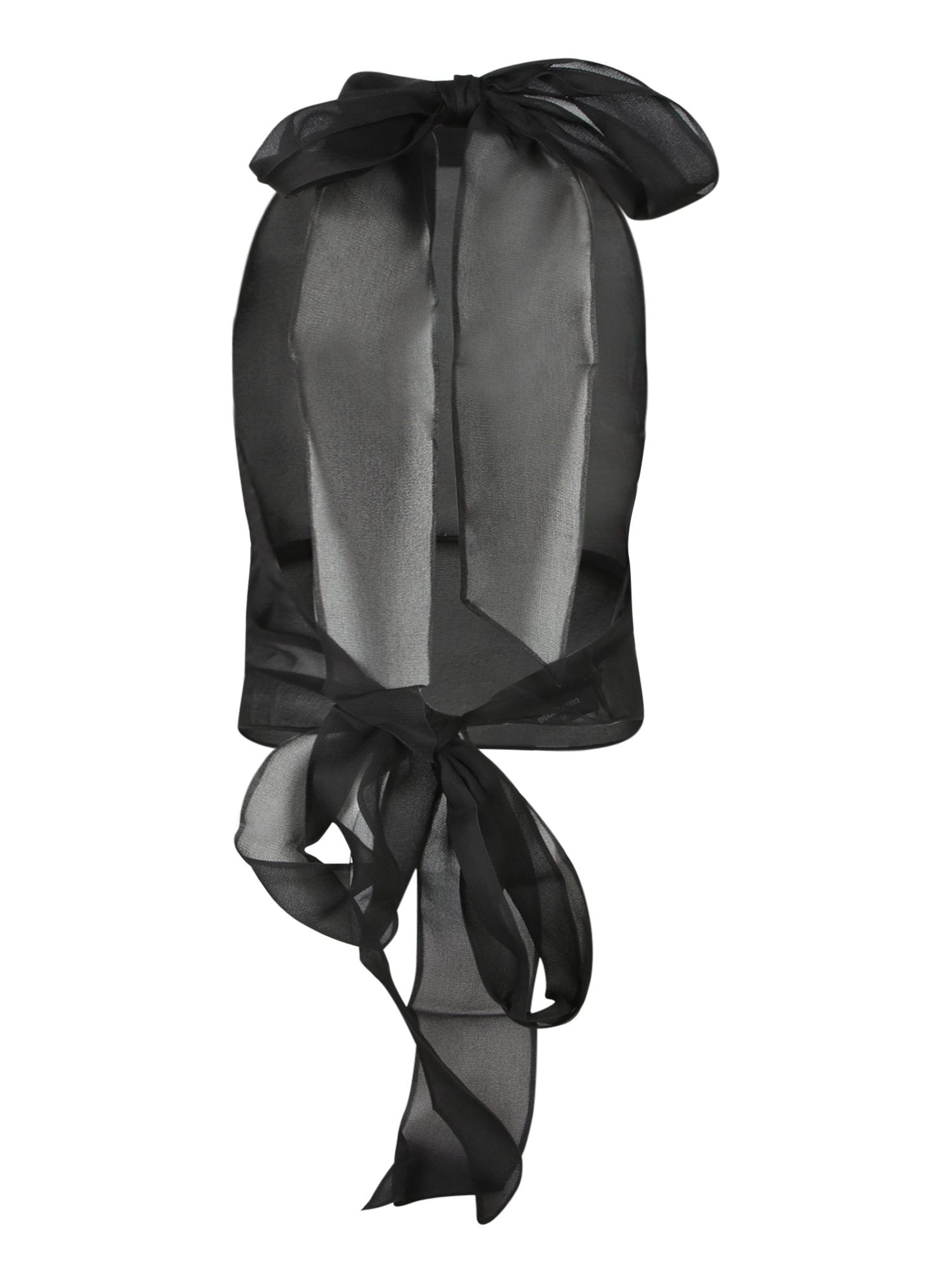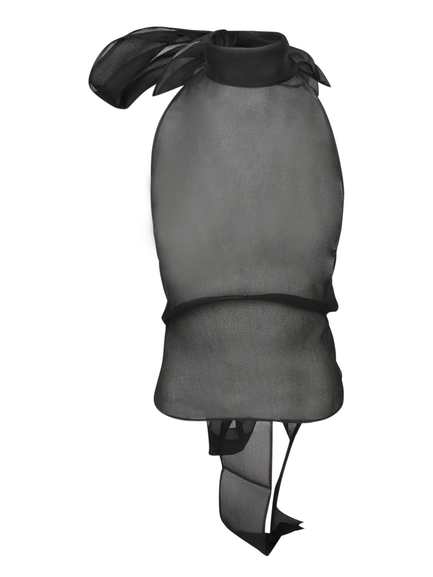 Sleeveless top. High neck with bow. Ribbon closure at the back.