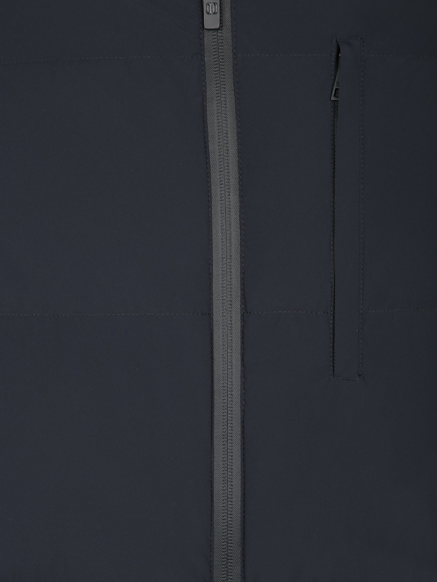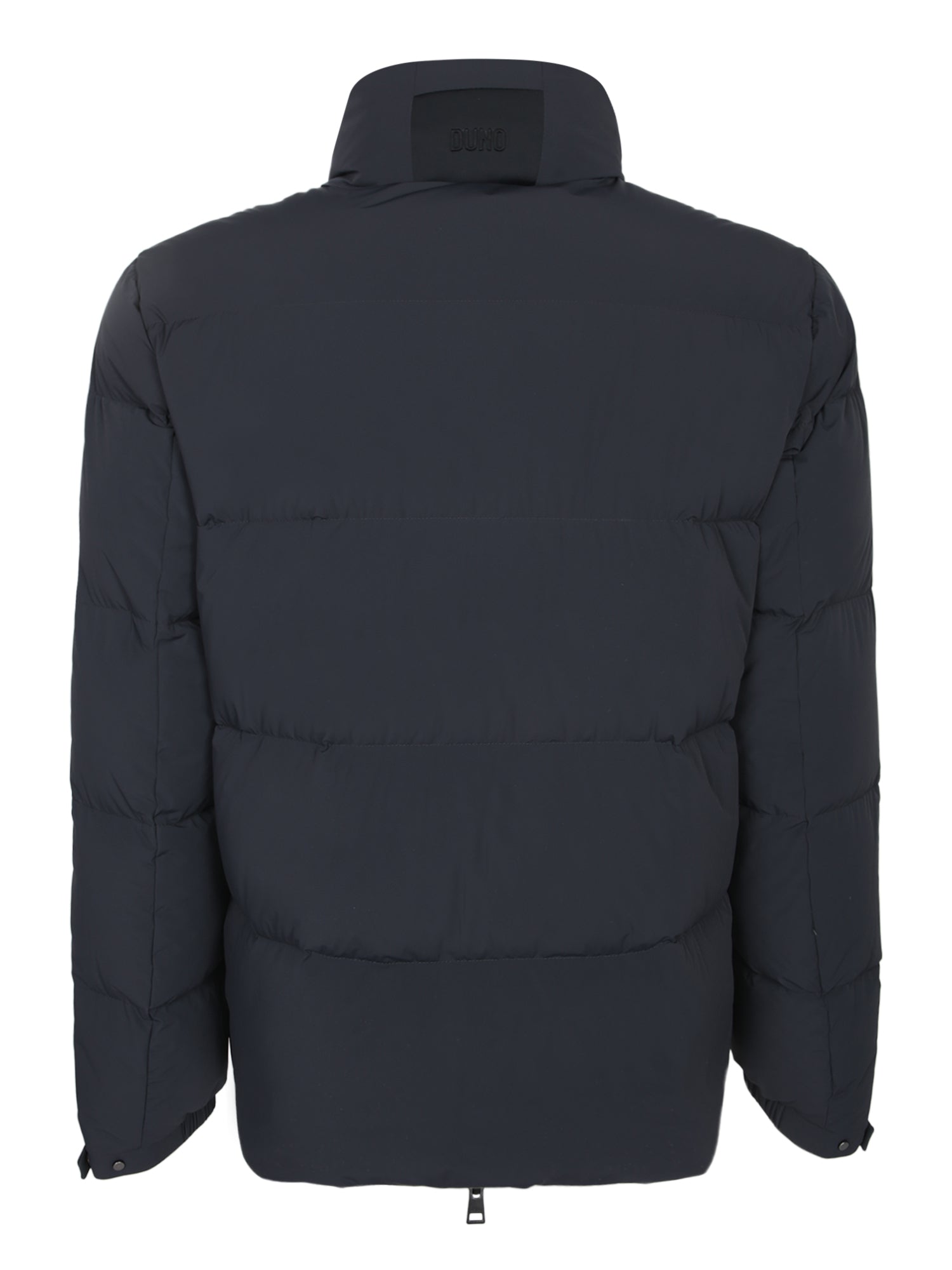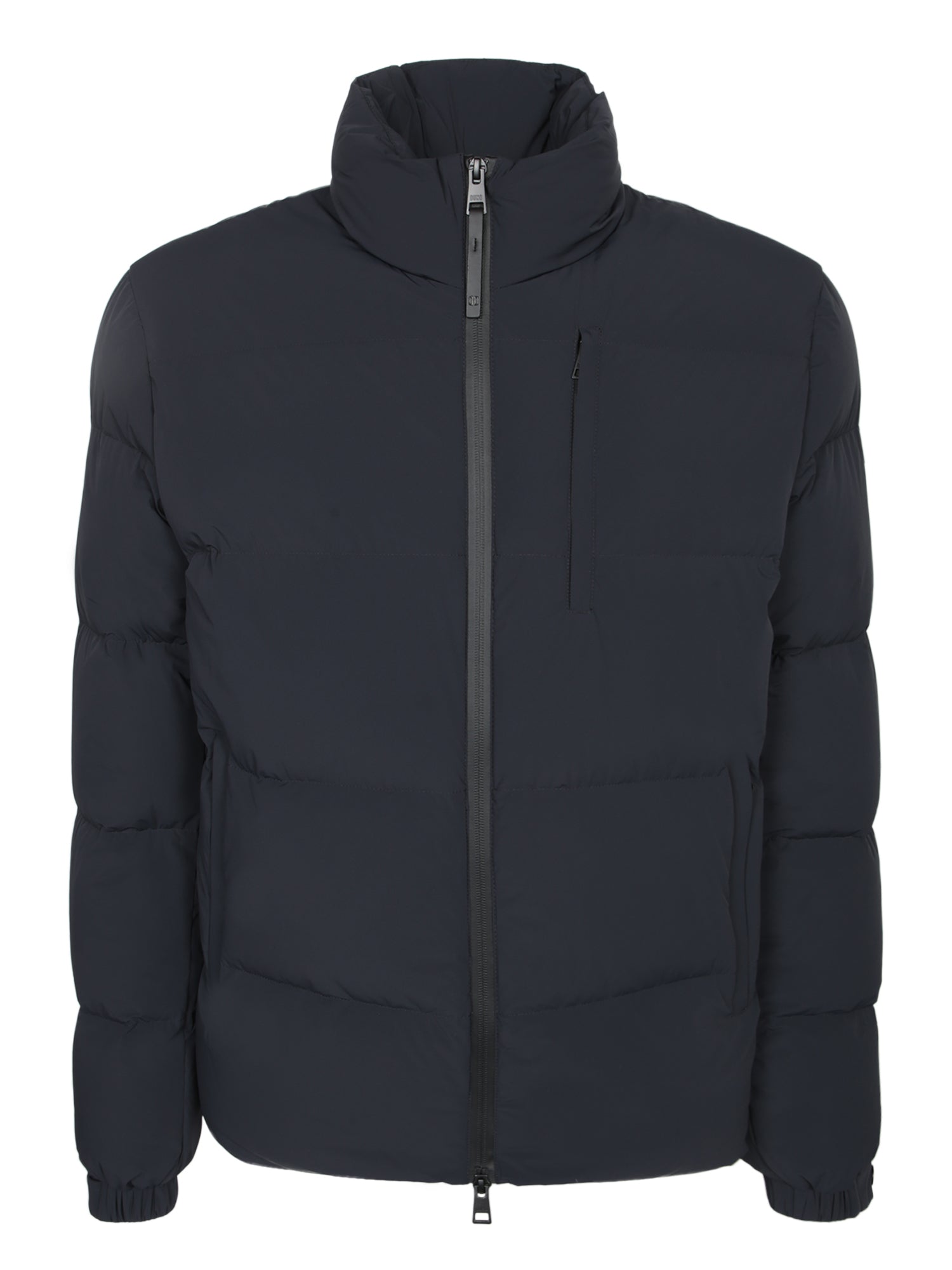 Padded down jacket, bi-directional stretch fabric, full zip closure, high collar.