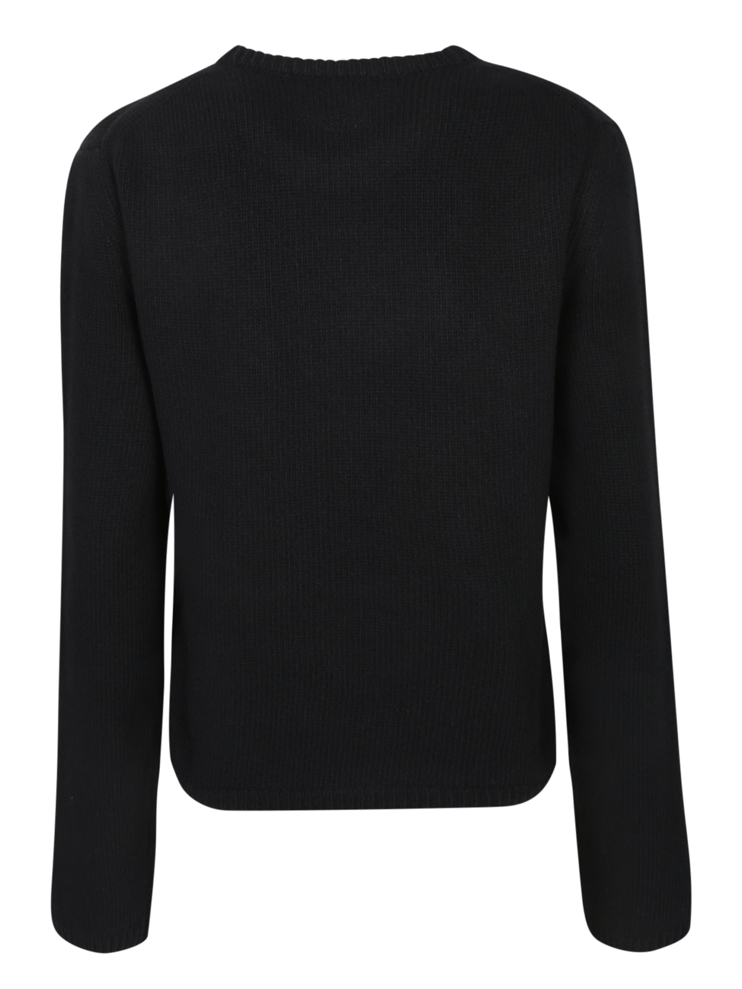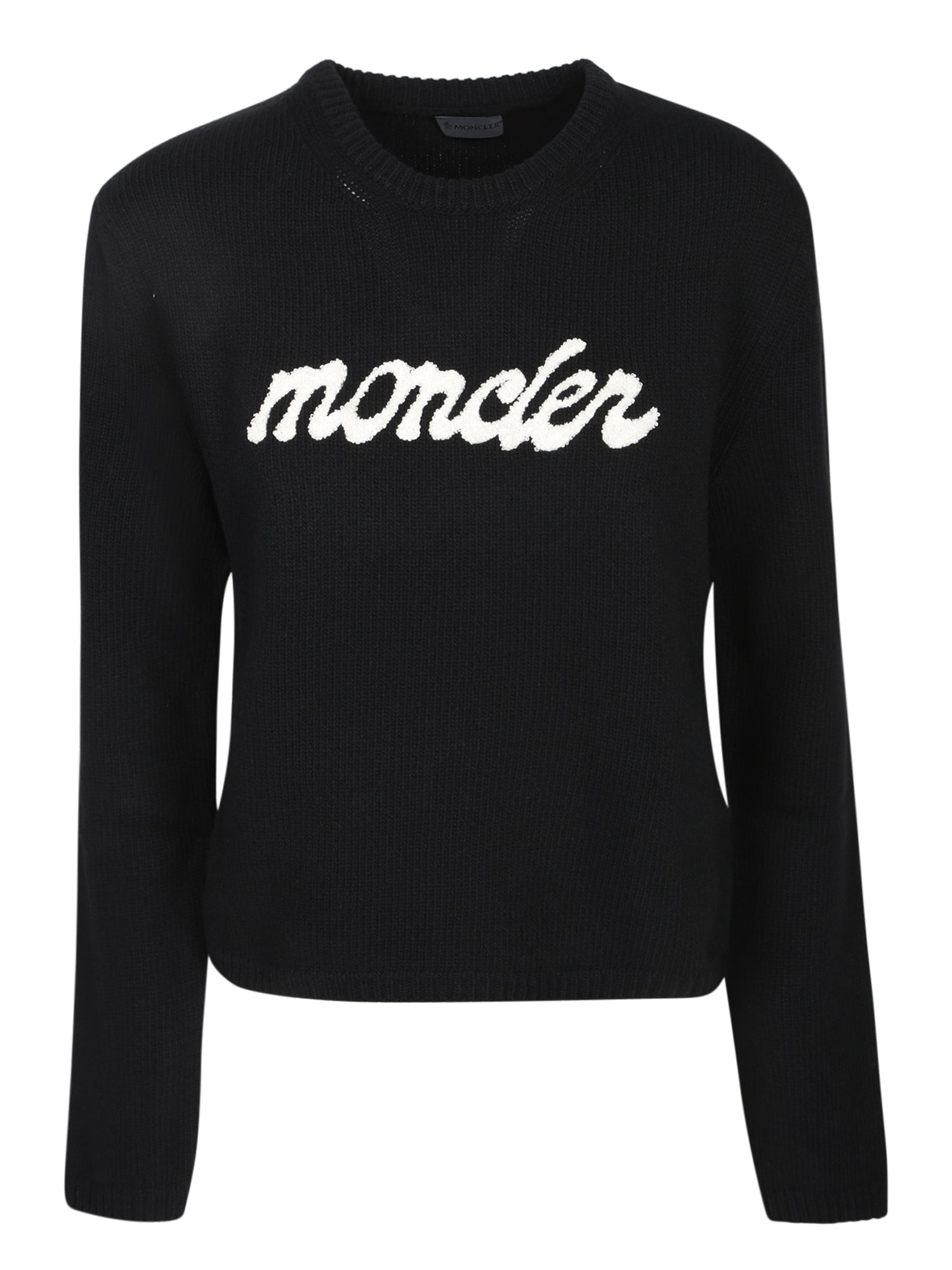 Long sleeve black knit sweater. White Moncler logo on the front. Crew neck.