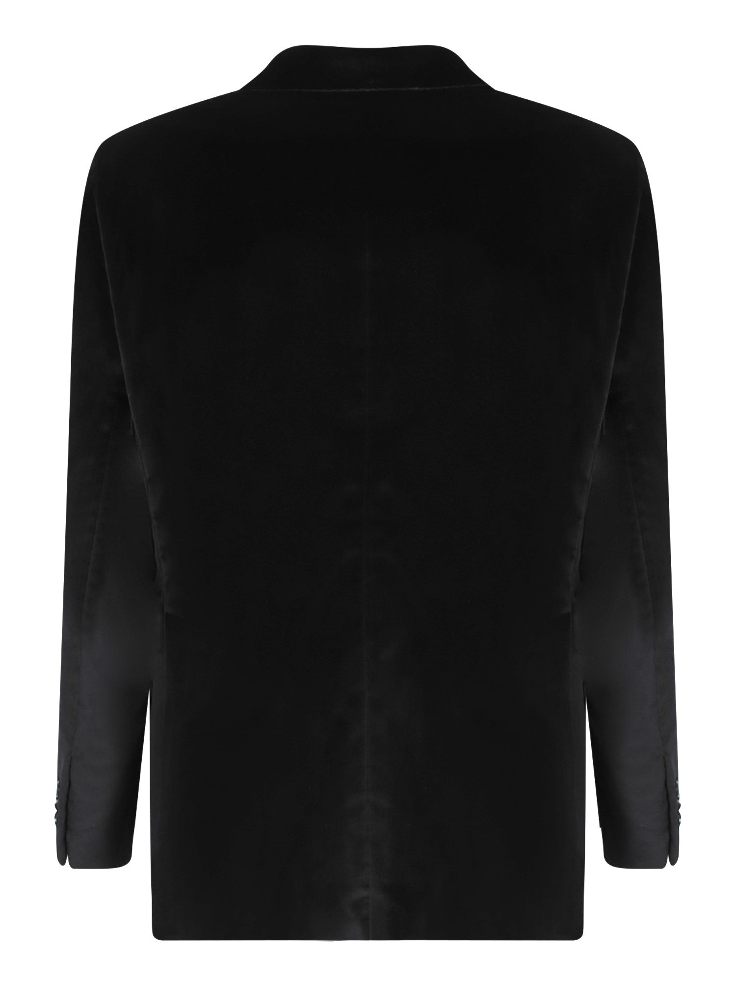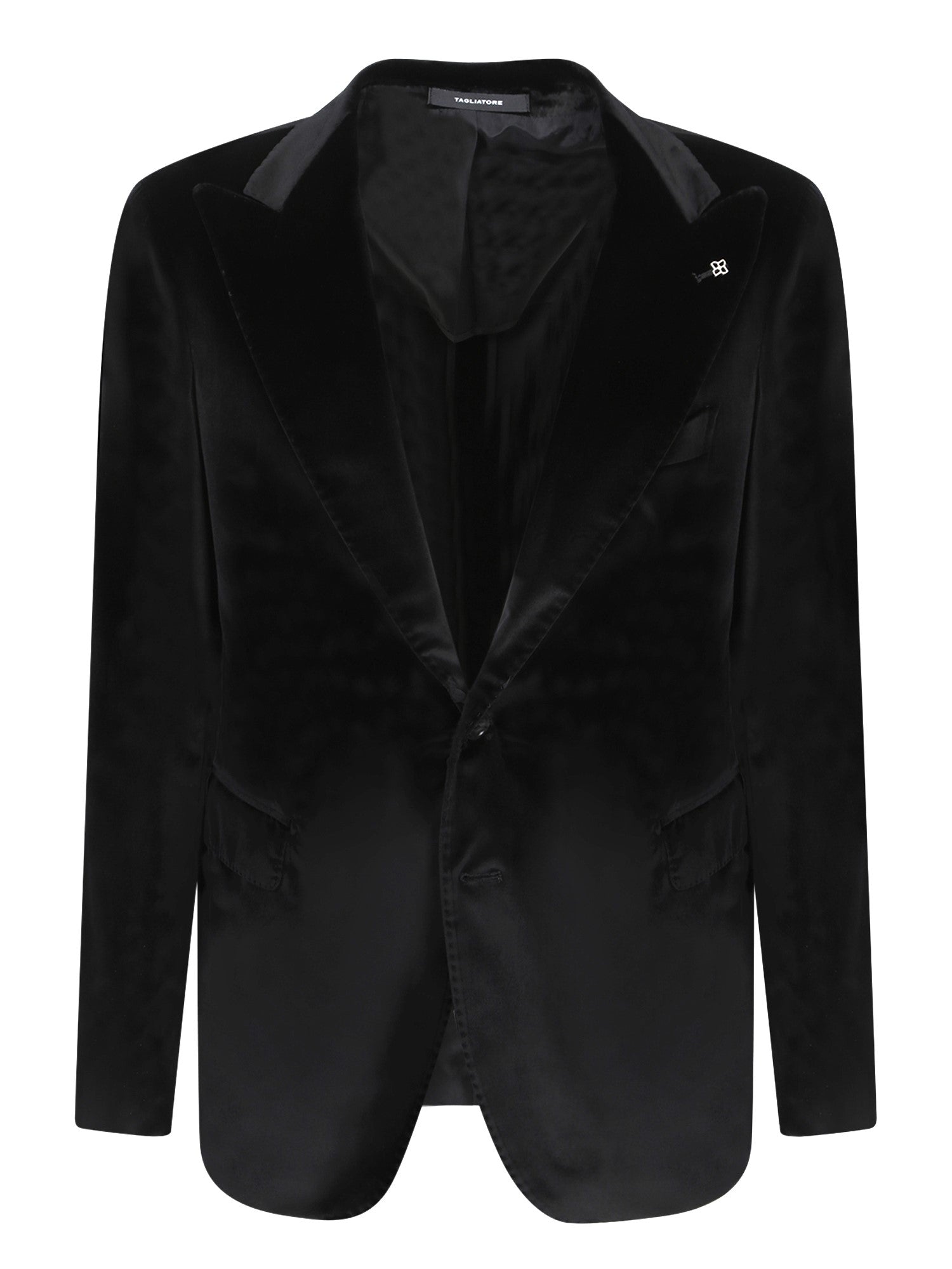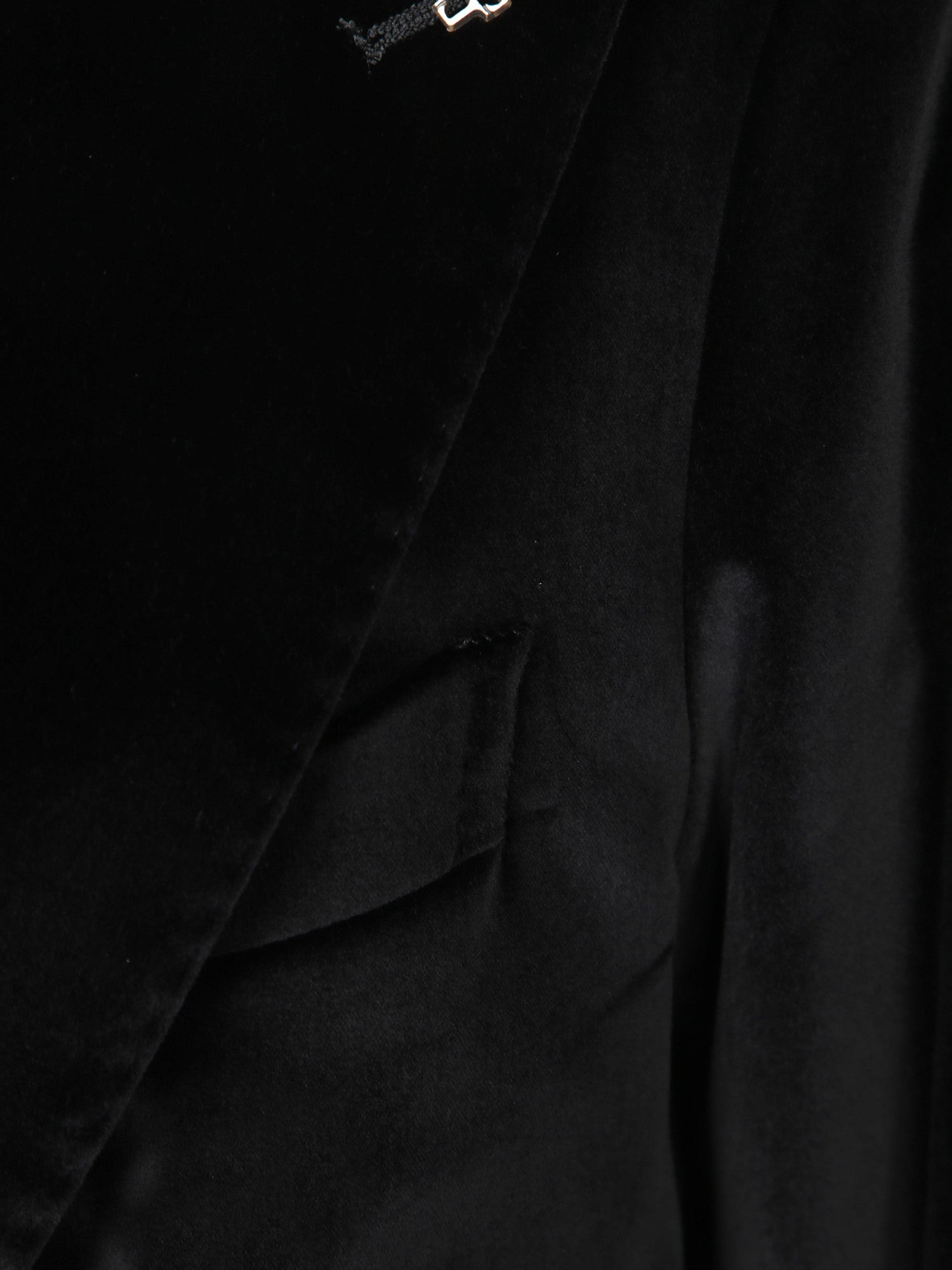 Velvet jacket with single button closure. Notch lapels and welt pockets.
