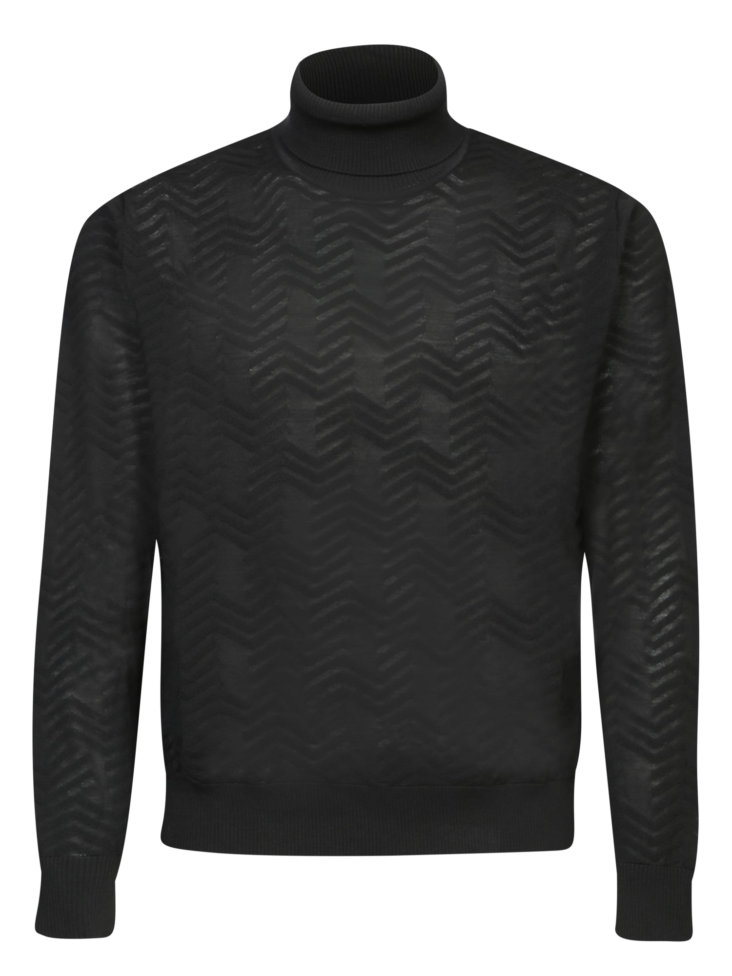 High neck sweater with a zigzag pattern. Made from a blend of wool and viscose. Ribbed cuffs and hem.