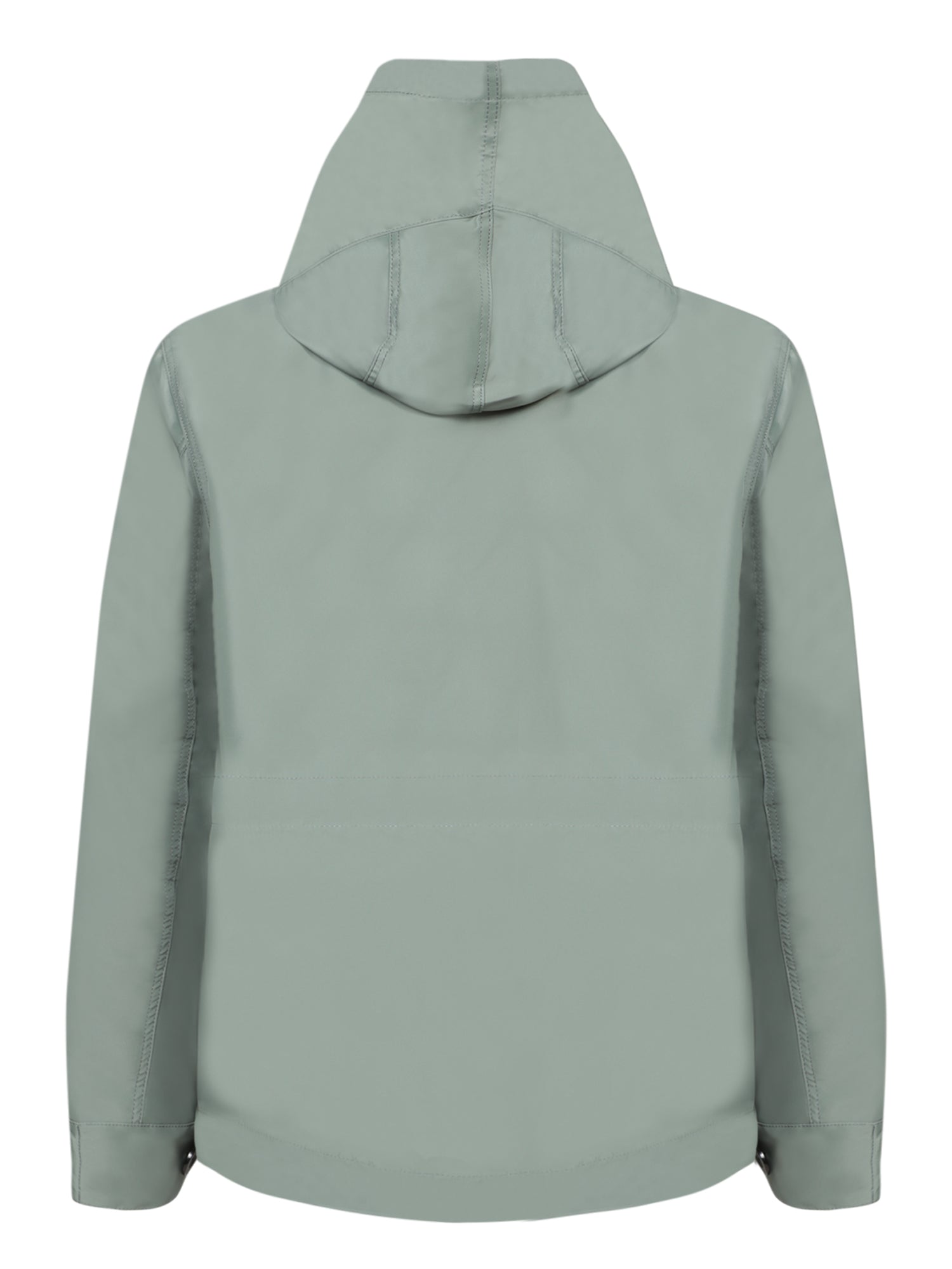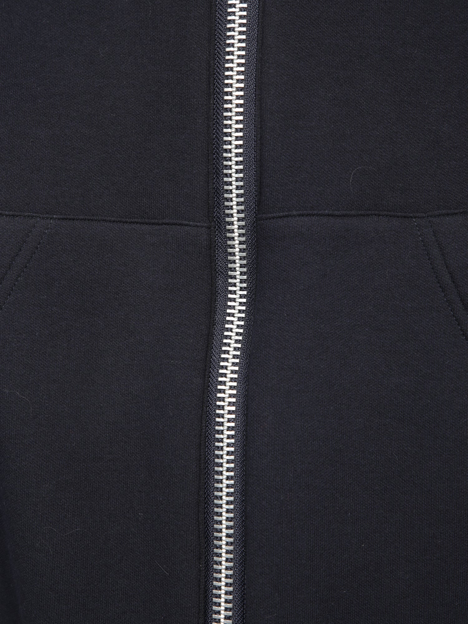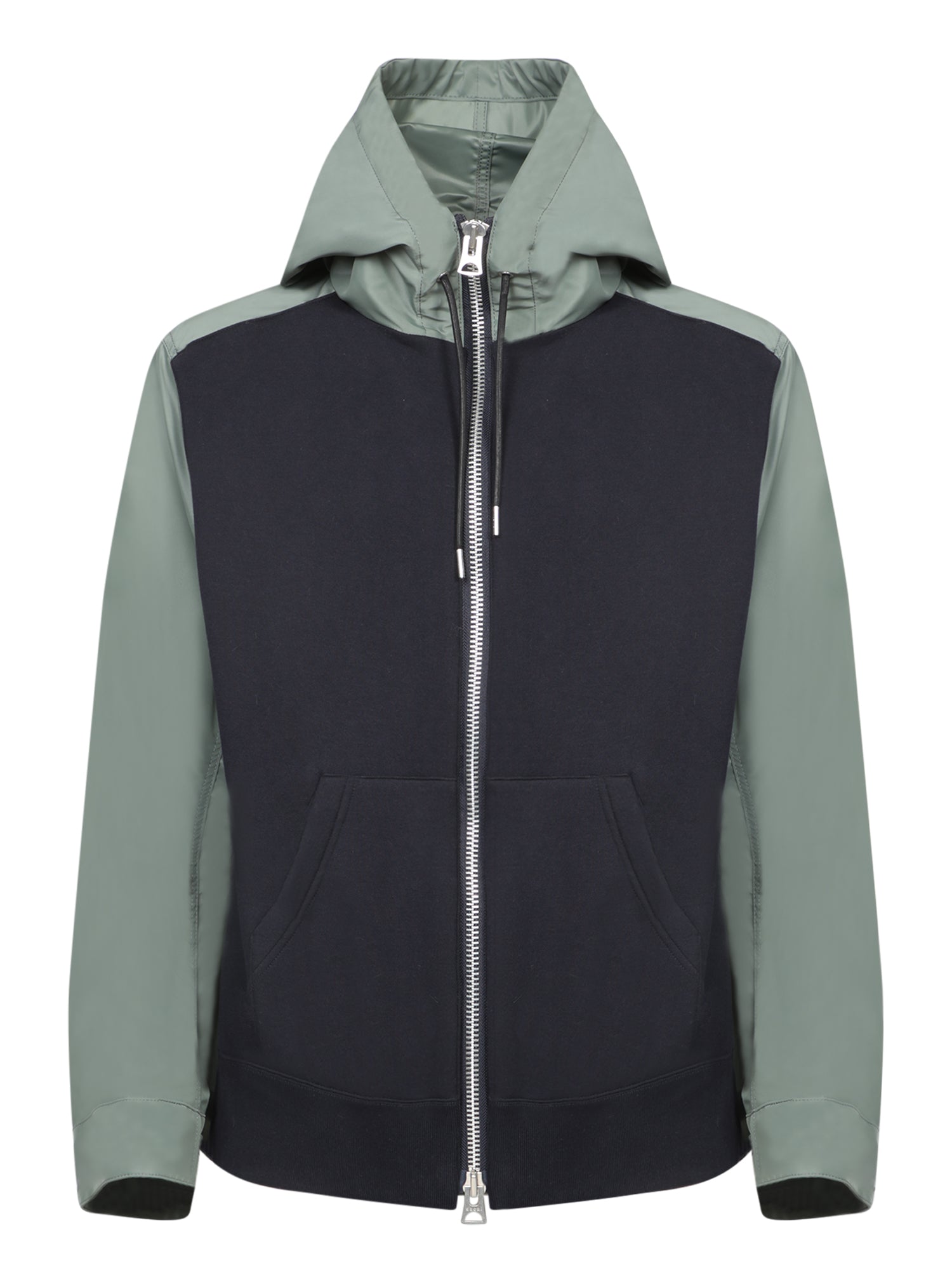 The Sacai sweatshirt models high fashion with a practical, modern aesthetic. It combines nylon twill with dark blue fabric inserts for a dynamic look.