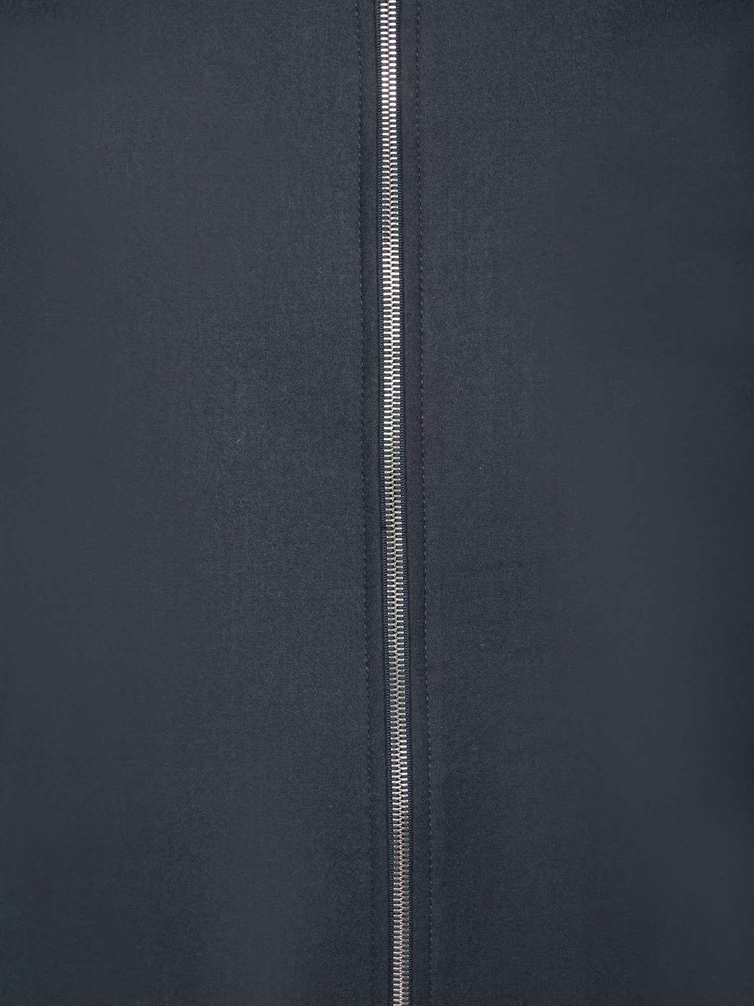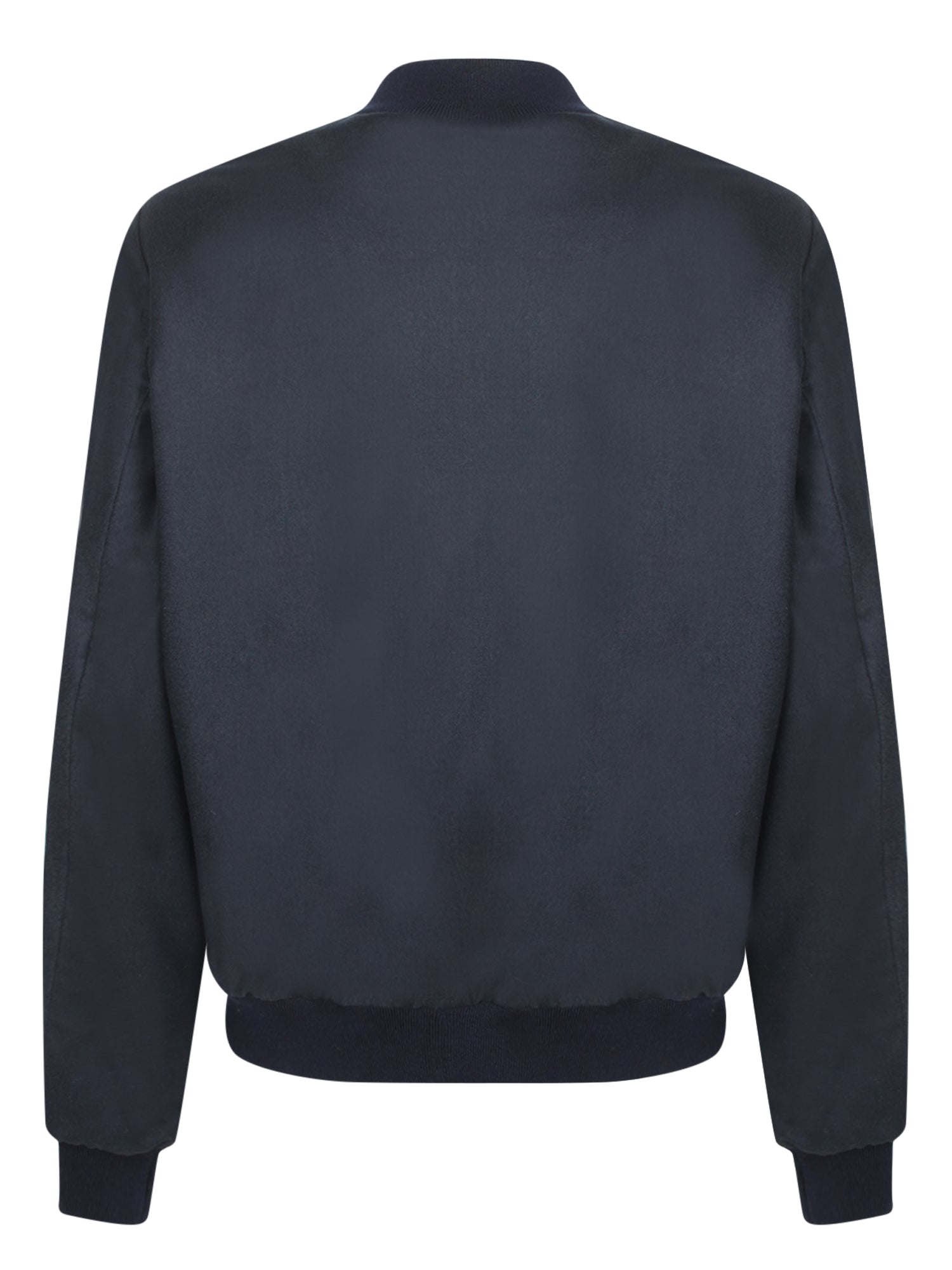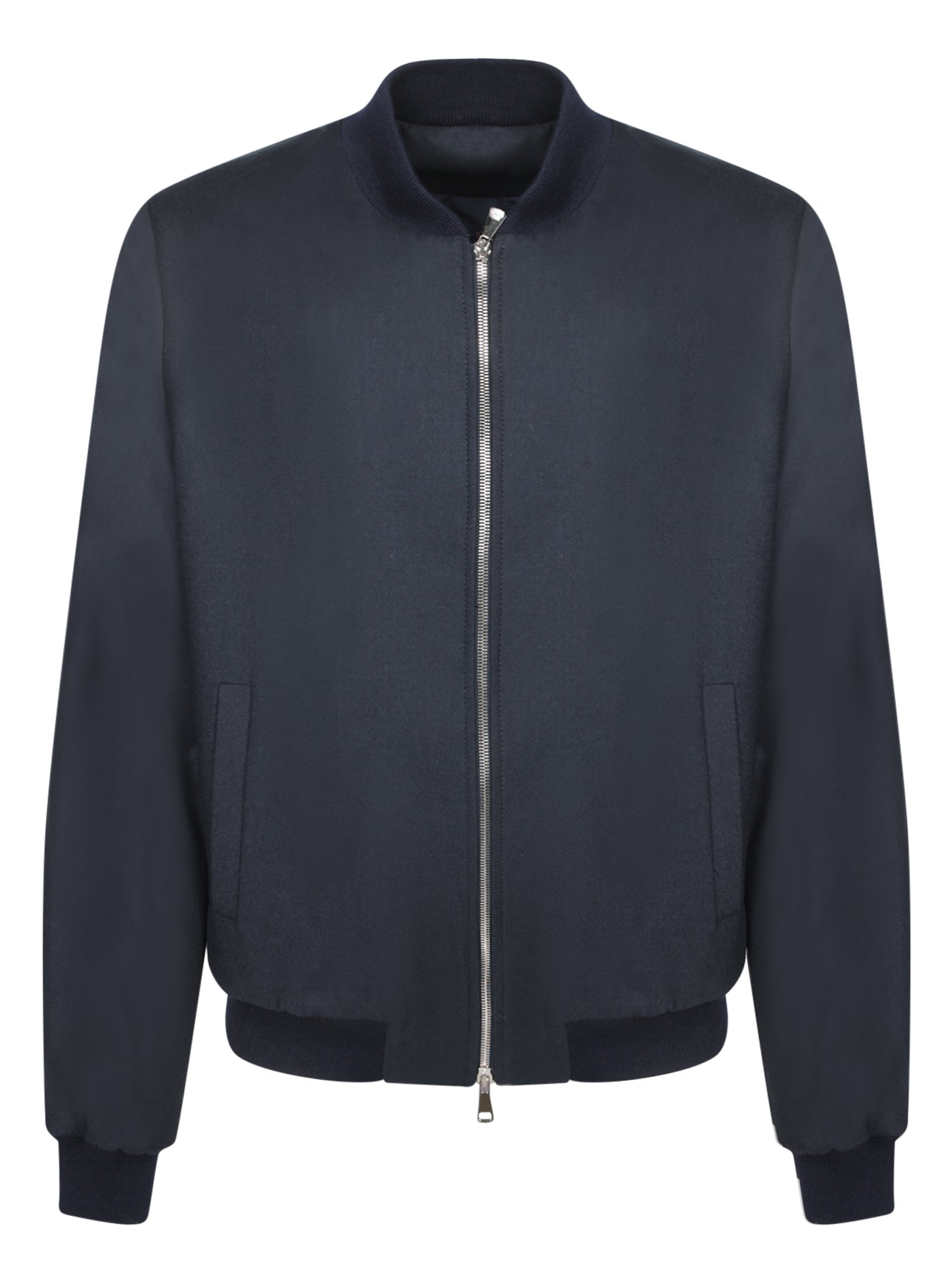 Dark blue flannel bomber jacket. Front zip closure. Welt side pockets. Ribbed cuffs and hem.