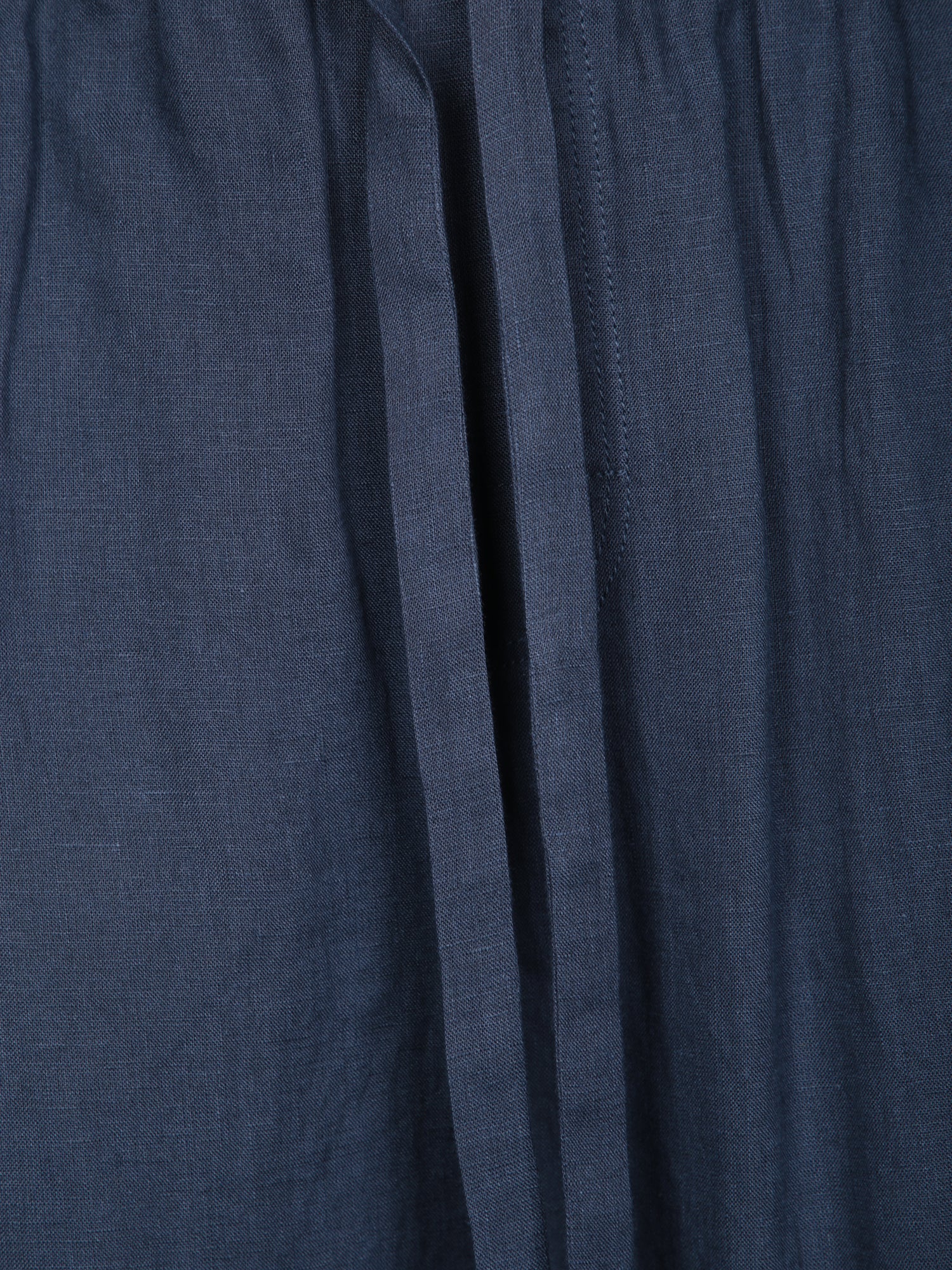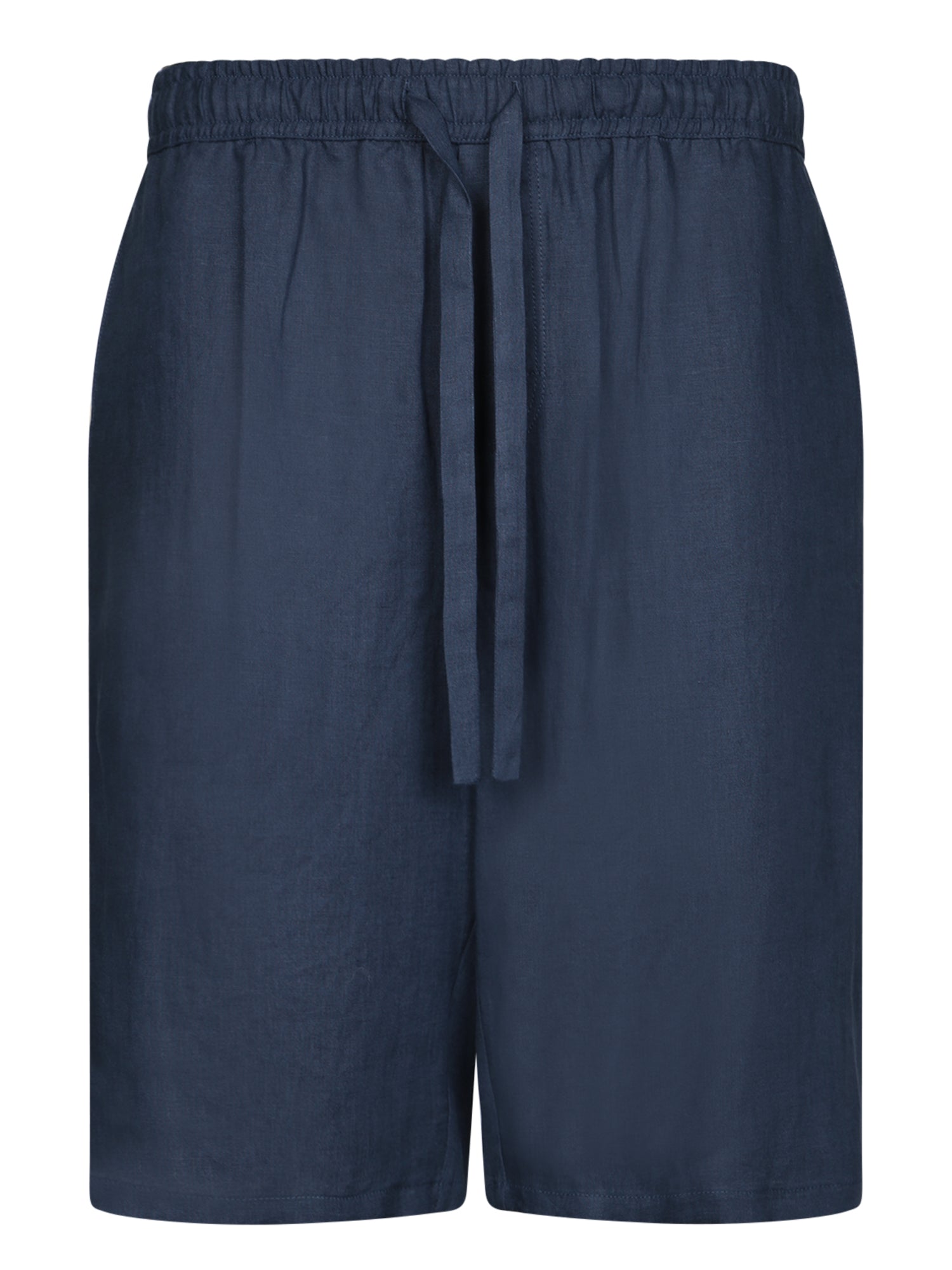 Linen Bermuda shorts, blue color, elastic waistband with drawstring, casual style.