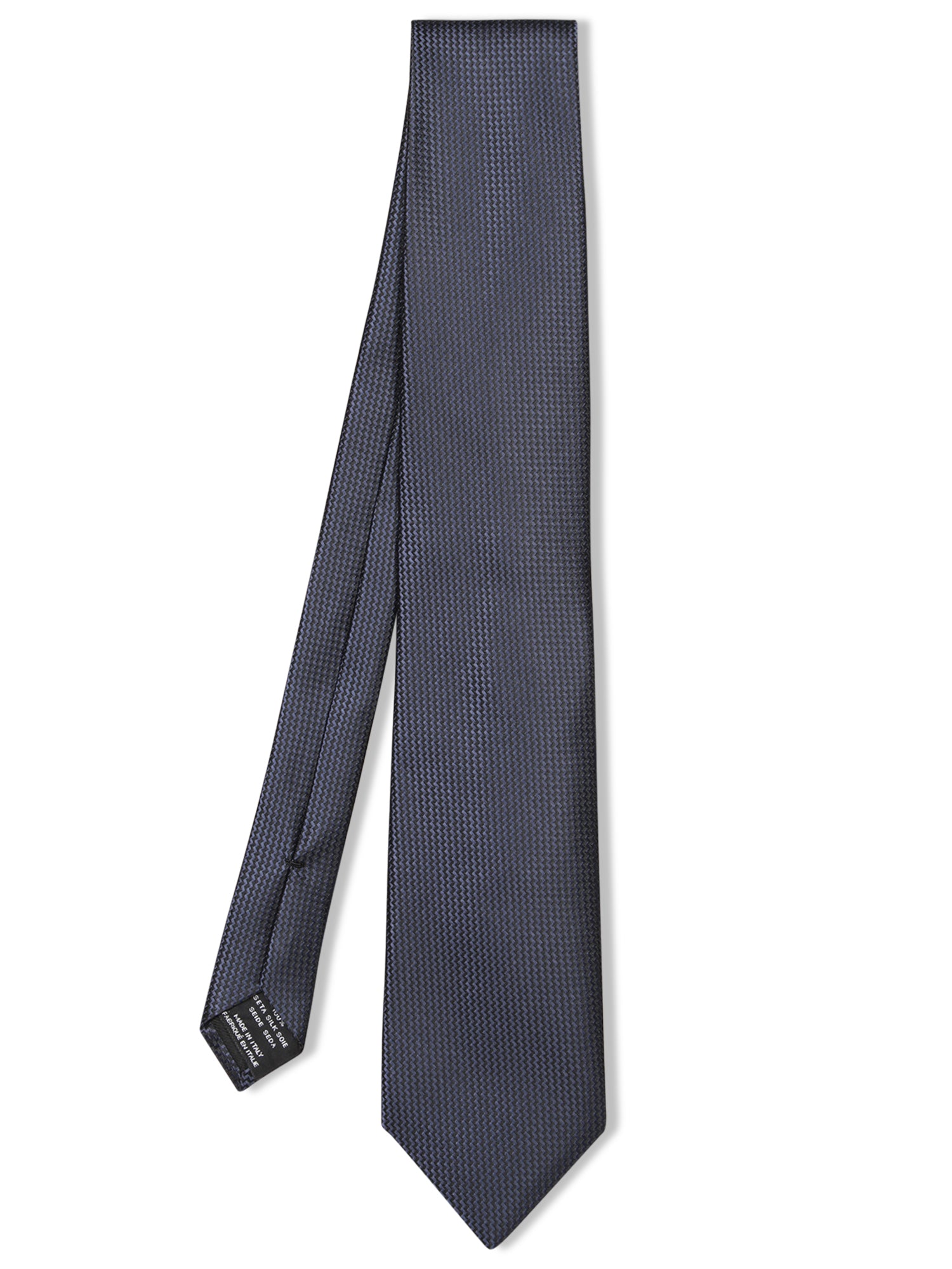 Blue silk tie. Fabric with micro pattern design. Features a cut tip and inner lining.