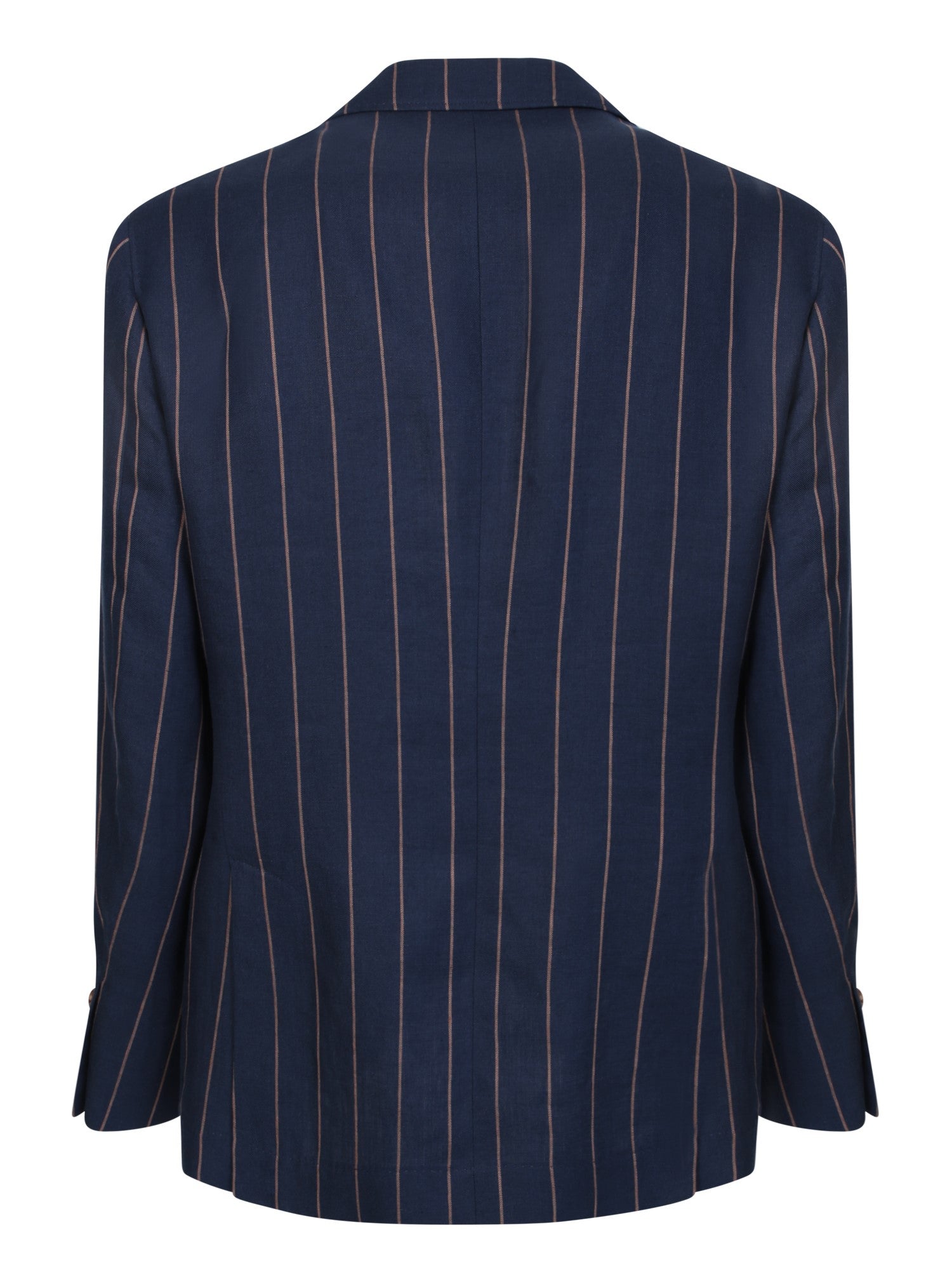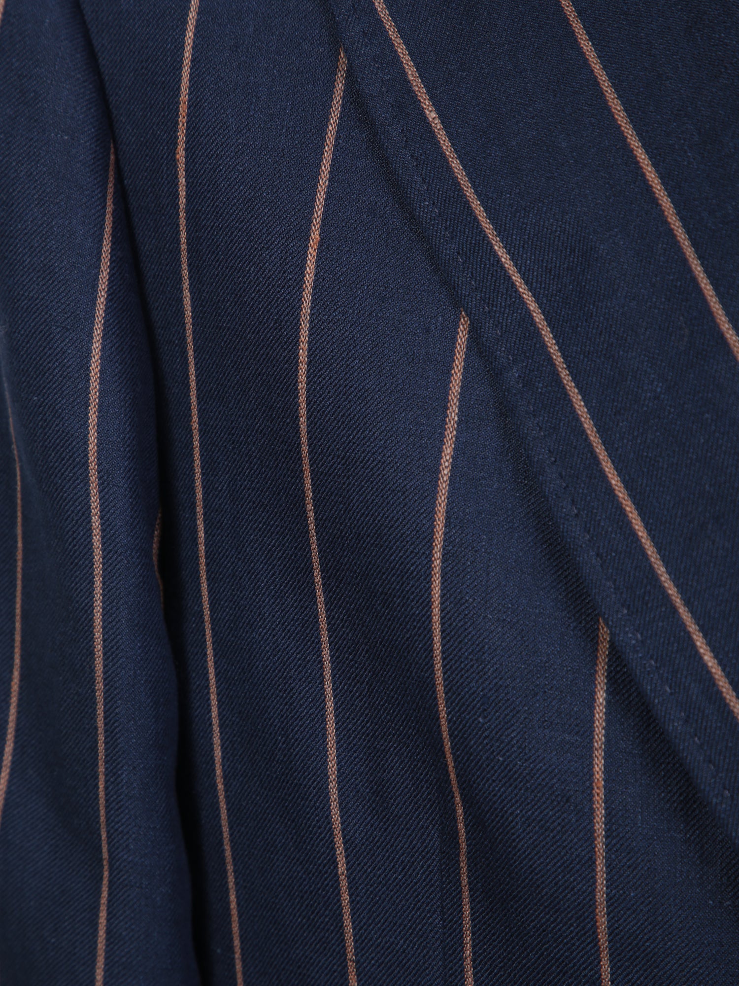 Blue pinstripe tailored jacket by Brunello Cucinelli. The sartorial taste of the wide pinstripe is enhanced by the refined qualities of the botavia in pure wool 150's