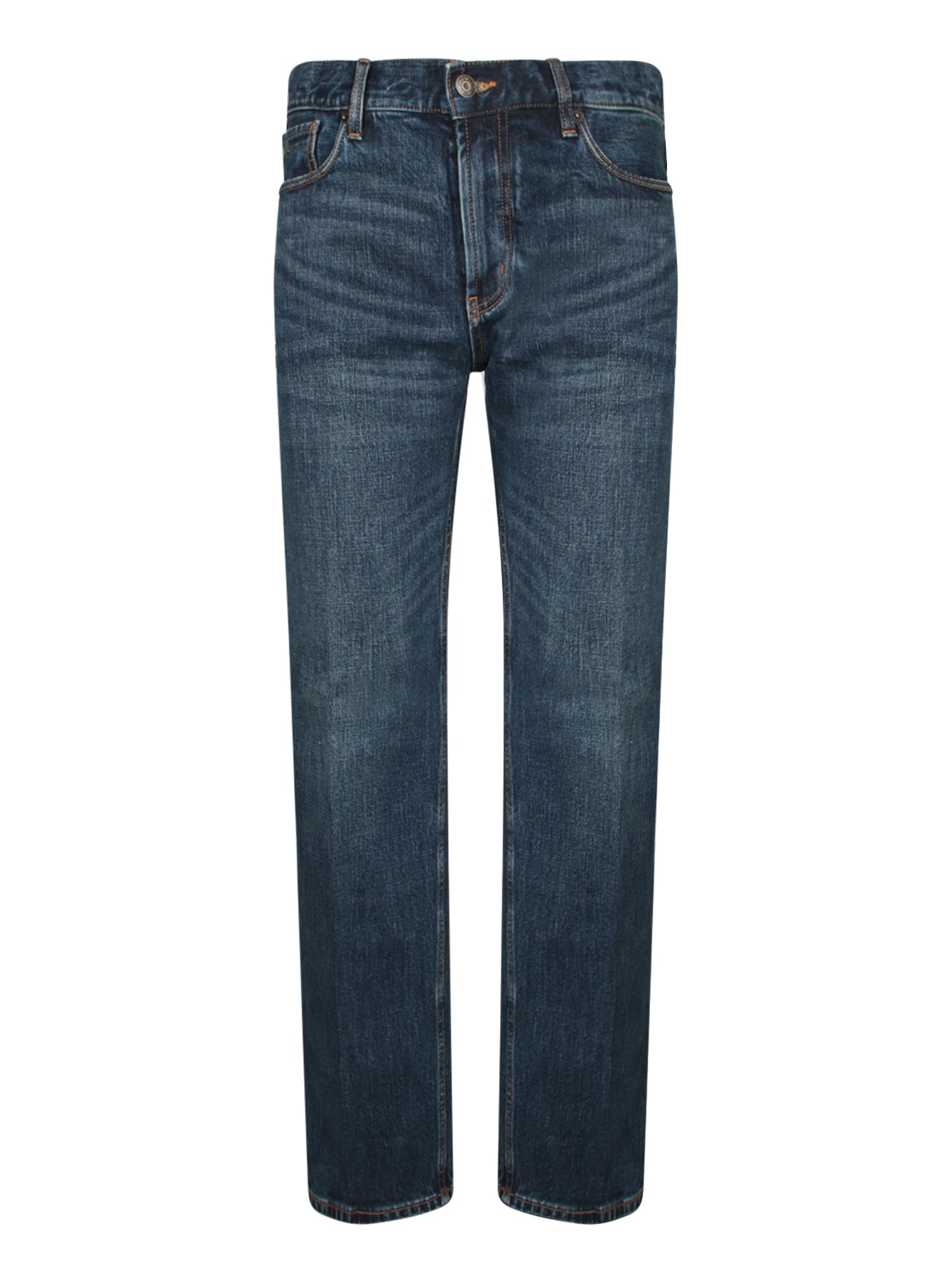 Straight-leg jeans. Denim fabric. Button and zip closure.