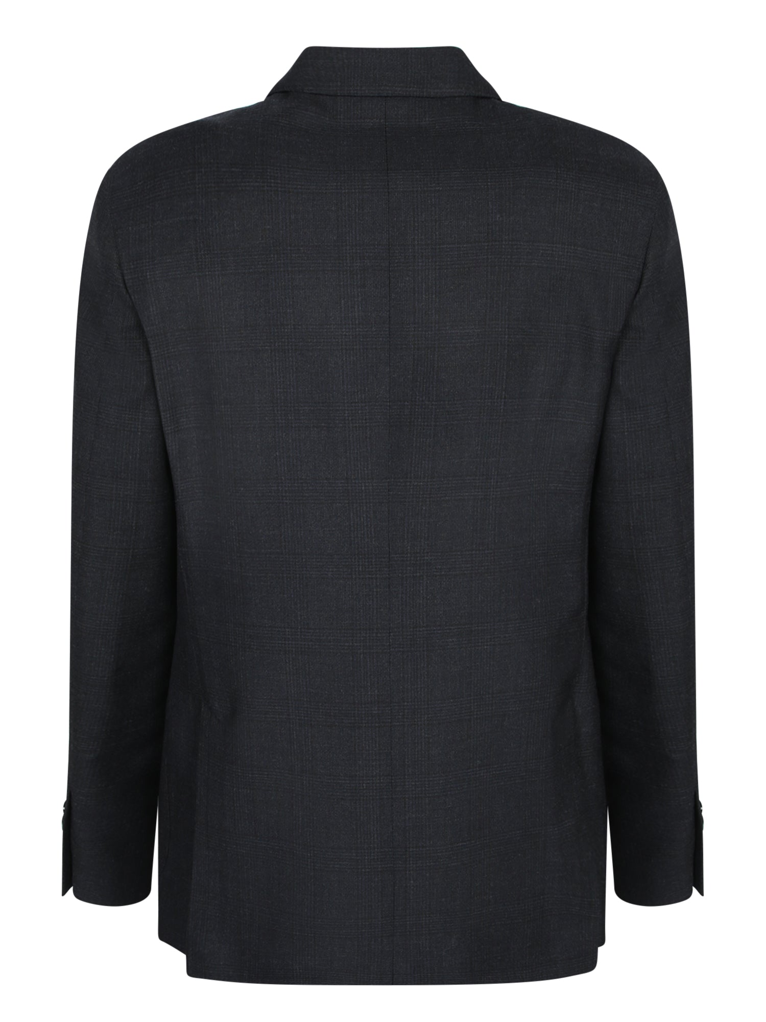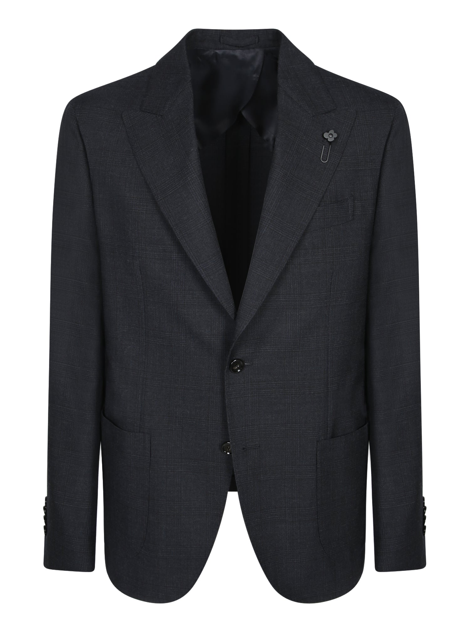 Blue jacket in pure wool. Two-button model, jetted pockets, and decorative pin on the lapel.